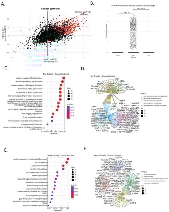 Identification of TNBC-Specific Gene Signatures and Pathway Enrichment in Cancer Epithelial Cells. (A) Bi-volcano plot comparing gene expression differences between TNBC and other breast cancer subtypes (HER2+ and ER+) in cancer epithelial cells, using single-cell RNA-sequencing (scRNA-seq) data from human primary breast cancer tumors [6]. Each dot represents a gene; those upregulated in TNBC (log2FC > 0.5, adjusted p < 0.05 in both comparisons) are colored red. The x-axis shows average log2 fold change (log2FC) between TNBC and ER+ tumors, while the y-axis shows log2FC between TNBC and HER2+ tumors. Genes in the upper right quadrant are significantly upregulated in TNBC compared to both HER2+ and ER+ tumors, highlighting TNBC-specific gene expression programs. In contrast, genes in the lower left quadrant are significantly downregulated in TNBC compared to both HER2+ and ER+, indicating genes specifically suppressed in TNBC. (B) Boxplot of SERPINB3 expression levels in cancer epithelial cells across subtypes. TNBC exhibits significantly higher expression compared to HER2+ and ER+ (t-test, p < 2.22 × 10−16) (C) Gene Ontology (GO) enrichment of TNBC-upregulated genes, showing biological processes. Color indicates adjusted p-value; dot size reflects gene count per term. (D) cnetplot of upregulated TNBC gene sets and their pathway associations. Only pathways with an adjusted p-value (FDR) < 0.05 were retained. (E) GO enrichment of TNBC-downregulated genes, highlighting suppressed processes including autophagy and exocytosis. (F) cnetplot of TNBC-downregulated genes showing network-level relationships among enriched pathways.