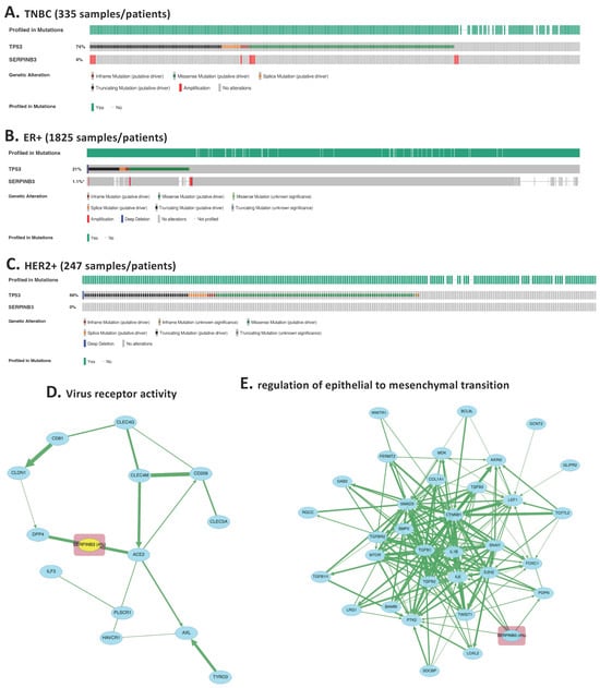 Independent clinical validation of SERPINB3 overexpression and TNBC-specific pathway activation using the METABRIC cohort. (A–C) SERPINB3 expression across >2400 primary breast cancers in the METABRIC dataset, stratified by molecular subtype. Heatmap-style tracks demonstrate that SERPINB3 is overexpressed almost exclusively in TNBC tumors (4% of 335 TNBC cases), with minimal expression in ER+ tumors (1.1% of 1825 cases) and no detectable expression in HER2+ tumors (0% of 247 cases) *: p < 0.05. (D) Pathway analysis of SERPINB3 was performed using the cBioPortal “Enrichment” and “Pathway Analysis” modules, restricted to TNBC samples and ranked by p-value significance. The top enriched pathways, “virus receptor activity”, emerged prominently. (E) The second top enriched pathways enriched in SERPINB3-altered TNBC tumors is epithelial–mesenchymal transition (EMT). The clustering of SERPINB3 within these biologically coherent modules supports its mechanistic role in TNBC epithelial remodeling and immune escape.