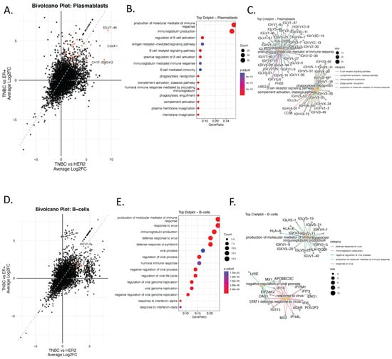 To investigate immune remodeling associated with TNBC, we performed differential gene expression and enrichment analyses focused specifically on immune cell populations, including plasmablasts and B cells using single-cell RNA-seq data. Bi-volcano plots revealed a distinct cluster of genes upregulated exclusively in TNBC, including immunoglobulin genes such as IGLV3-25, IGKV1-9, and IGLV1-40, which were not upregulated in HER2+ or ER+ tumors (Figure 3A–F and Supplementary dataset Tables S1 and S2). These genes are typically restricted to antibody-producing B lineage cells, suggesting aberrant or heightened B cell and plasmablast activity in TNBC.