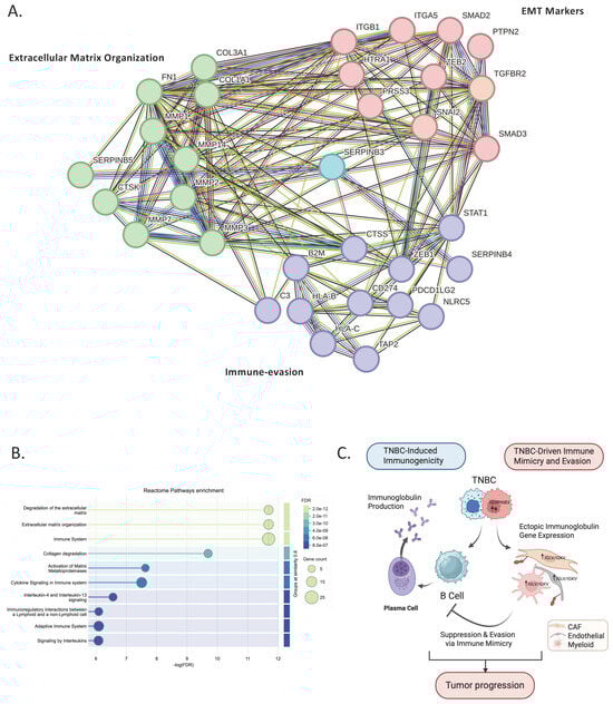 SERPINB-centered protein–protein interaction network and pathway enrichment of TNBC-exclusive cancer epithelial genes. (A) STRING protein–protein interaction network generated from TNBC-exclusive epithelial genes identified in the single-cell analysis (Supplementary dataset). SERPINB3 emerges as a central hub linking clusters involved in extracellular matrix remodeling (COL1A1/2, FN1, MMPs), EMT regulation (ZEB1/2, SNAI2, SMADs), and immune-modulatory pathways (STAT1, NLRC5, HLA class I genes). (B) GO Biological Process enrichment of the SERPINB-linked network showing the top significant pathways, including ECM organization, EMT, antigen processing and presentation, and interferon-γ–related immune signaling. Dot size reflects gene count and color indicates FDR. (C) Schematic model illustrating the dual role of TNBC in shaping tumor immunity. TNBC enhances B-cell and plasmablast activation, leading to increased immunoglobulin production and heightened immunogenicity. Conversely, TNBC epithelial cells upregulate SERPINB3, driving stromal reprogramming toward immune suppression; CAF, endothelial, and myeloid cells acquire immune-mimicry features through ectopic IGLV/IGKV expression. This stromal mimicry suppresses authentic B-cell activity and promotes immune evasion, collectively supporting tumor progression. Figure created with BioRender.com.
