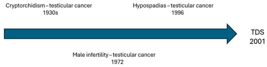 Testicular dysgenesis syndrome (TDS) is characterized by dysfunction of the fetal male genitals leading to various clinical features that can manifest at birth or later in life [1]. The most common components are male infertility, hypospadias, cryptorchidism, and testicular germ cells tumors (GCTs) [2]. Recent evidence suggests that a shorter anogenital distance (AGD) could also be part of this syndromic picture [3]. Despite the association between cryptorchidism and testicular cancer being noted since the 1930s [4], a possible correlation with other conditions was only proposed after several years (Figure 1). Indeed, the first histological finding suggesting an association between male infertility and testicular cancer dates 1972 [5]. On the other hand, an increased risk of testicular cancer in patients affected by hypospadias was first observed in a Danish cohort study published in 1996 [6] and then confirmed in other large population-based studies [7,8]. Considering the co-occurrence of these conditions and the epidemiological overlap, in 2001, Skakkebaek et al. [9] suggested a common etiopathogenesis in the context of TDS. The concept of TDS is somewhat similar to that of disorders of sex development (DSDs), a group of congenital conditions involving atypical development of chromosomal, gonadal, or anatomical sex [10]. Analogies with subcategory 46, XY DSD, referring to XY karyotype patients, can also be found. A distinction from complete gonadal dysgenesis is easy to carry out considering the female phenotype. Instead, the clinical picture of partial gonadal dysgenesis, characterized by mild-to-severe penoscrotal hypospadias and reduced sperm production, can often mimic TDS. However, the phenotype of TDS is usually less pronounced than that of DSD, probably because of the stronger impact of genetics on the pathogenesis of DSDs [11,12]. In fact, even if nowadays the existence of TDS is strongly supported by the literature [2], its etiology remains unclear. Genetics play a central role, as suggested by the association between genetic alterations and all the components of TDS [13,14,15,16]. In more detail, genetics could be particularly relevant for male infertility, since many cases of idiopathic infertility may be linked to unknown genetic causes [17,18]. However, genetics does not seem to be the only factor contributing to the origin of TDS. Indeed, many studies have reported an increasing incidence of TDS cases, especially in developed countries [19]. Many chemical substances, so-called endocrine disruptors, have shown endocrine activities like estrogenic or antiandrogenic effects potentially interfering with the development of fetal male genitals [2,20,21,22]. Nowadays, there are more than 800 substances that can be classified as endocrine disruptors [23]. These substances are mainly found in plastics, building materials, combustion products, and pesticides, as well as in cosmetics and some foods [24,25,26,27,28,29].They are now practically ubiquitous, being commonly found in air and water [29,30]. Therefore, pregnant women may encounter these substances, which can then affect fetal development [31,32]. In addition, maternal lifestyle can represent an additional critical factor, since cigarette smoking, alcohol, obesity, and diabetes have been associated with the occurrence of TDS [33,34,35]. All these potential contributors to TDS should also be evaluated considering the declining trend in semen quality [36] and serum testosterone levels worldwide [37,38], with associated health issues [39]. Indeed, this decline could also be related to endocrine disruptors [40,41] and the increasing incidence of obesity and metabolic syndrome correlated with unhealthy eating habits [42,43,44].