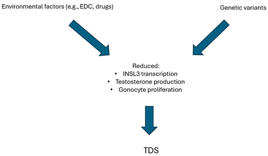 Experimental models to demonstrate the interaction of genetic variants with environmental disruptors were built (Figure 2). Many laboratories used cultures of human testis cell to evaluate the effects of EDCs and drugs on fetal testis. Phthalates exposure led to increased apoptosis of germ cells and bisphenols to reduced testosterone production and INSL3 transcription. Interestingly, paracetamol seemed also to reduce INSL3 production and gonocyte proliferation [12]. Studies using xenograft models of human fetal testis tissue were also carried out. Contrasting results were found, considering that exposure to DBP did not reduce the expression of genes involved in testosterone biosynthesis [242]. Instead, paracetamol exposure reduced testosterone production and lowered seminal vesicle weight in second-semester human fetal testis [12,243]. Mechanistic studies directly evaluating the effects of environmental factors on the presence of genetic variants in TDS models are missing. However, data deriving from mice affected by DSD, a conceptually similar condition, can be analyzed. Xie et al. found that the effects of exposure to different doses of DEHP were different in the presence of a specific genetic variant of the luteinizing hormone/choriogonadotropin receptor (LhcgrW495X/+). Indeed, low-dose DEHP did not exert significant effects on wild-type mouse offspring but caused DSD in LhcgrW495X/+ mice by suppressing the expression of genes involved in steroidogenesis. Moreover, even if high-dose DEHP caused DSD in both genotypes, LhcgrW495X/+ mice had more severe phenotypes [244]. It is possible that a similar mechanistic model could also be applicable to TDS considering the similar etiopathogenesis. Unfortunately, building a mechanistic model evaluating the effects of many maternal and fetal risks previously listed is quite difficult, even if it would surely add important information.