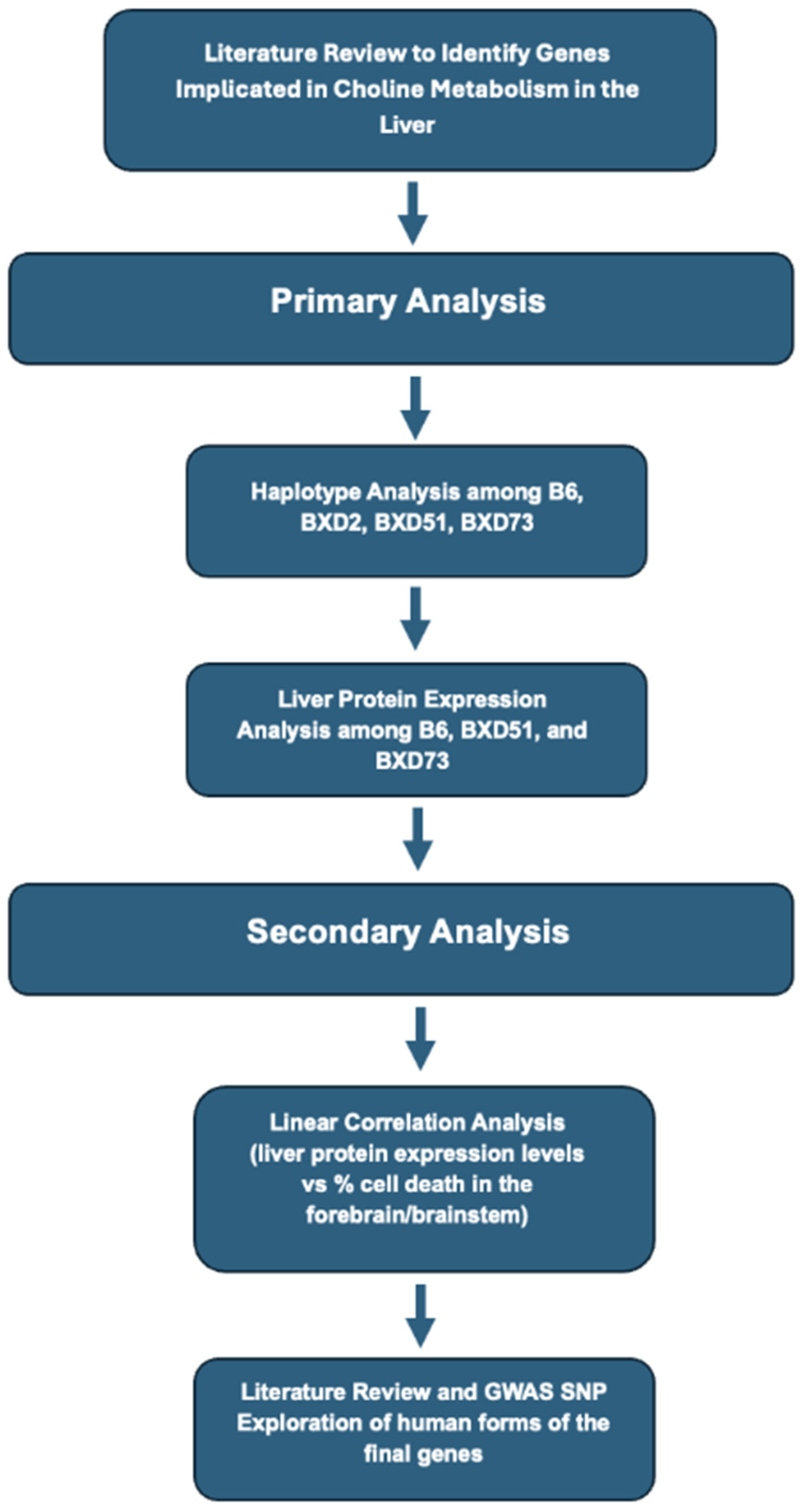 In the present study, a sequential analysis was conducted to identify potential candidate genes that alter choline processing in the maternal liver of the mice (See Figure 1). After each analysis, a set of criteria, defined with each bioinformatic step, was used to eliminate genes that were considered less likely to be critical in mediating differential responses. The analysis focused on the parental strains and the BXD recombinant inbred mouse strains derived from parental B6 or D2 strains. Each BXD mouse has a differential contribution of genes from the parental strains and phenotypic differences in particular traits can be used to assess genetic contributions to specific phenotypes [35]. The bioinformatic analysis was performed using Genenetwork, a repository of datasets used to study complex networks of genes, molecules, and higher-order gene function and phenotypes (https://genenetwork.org/).