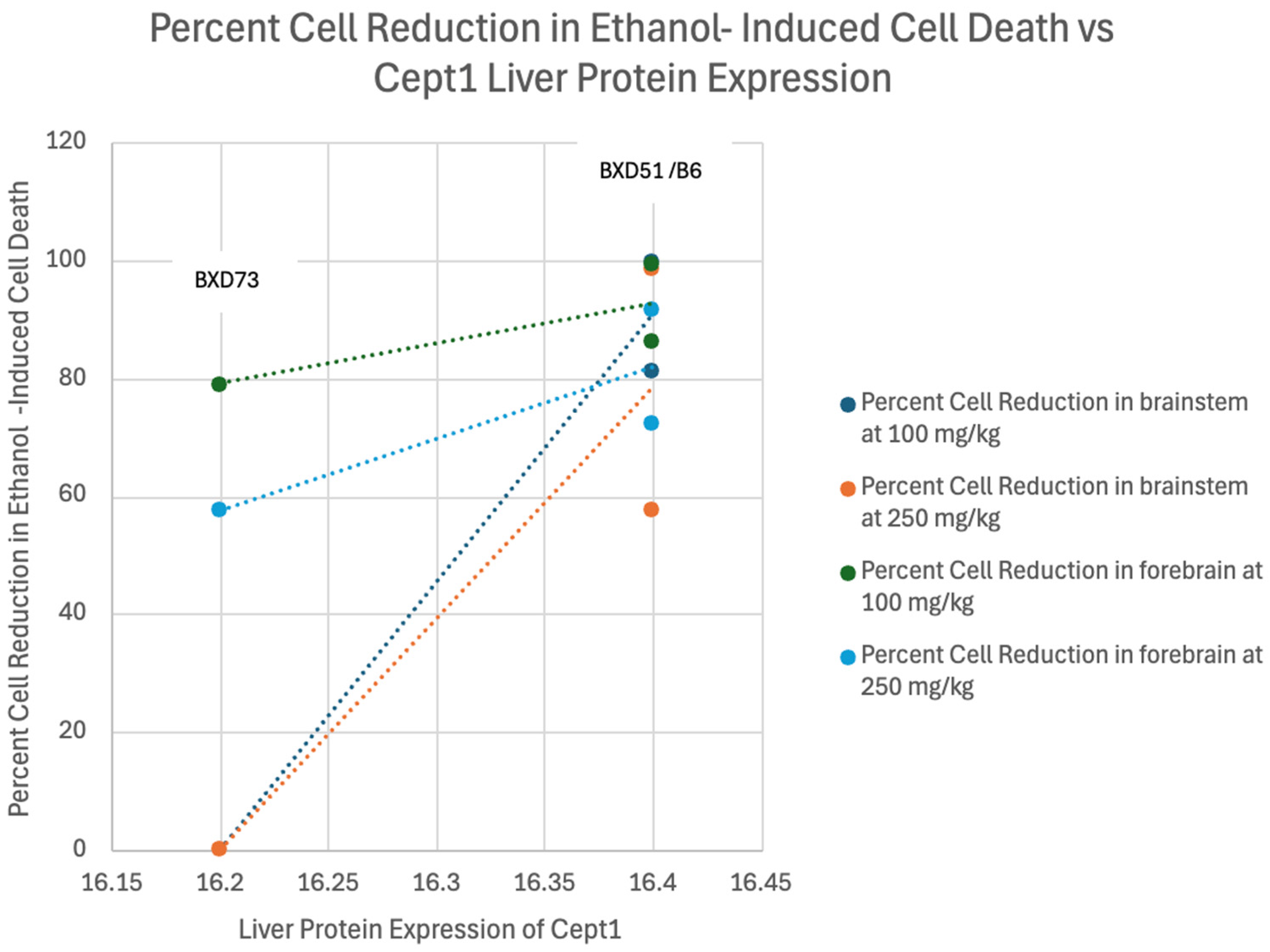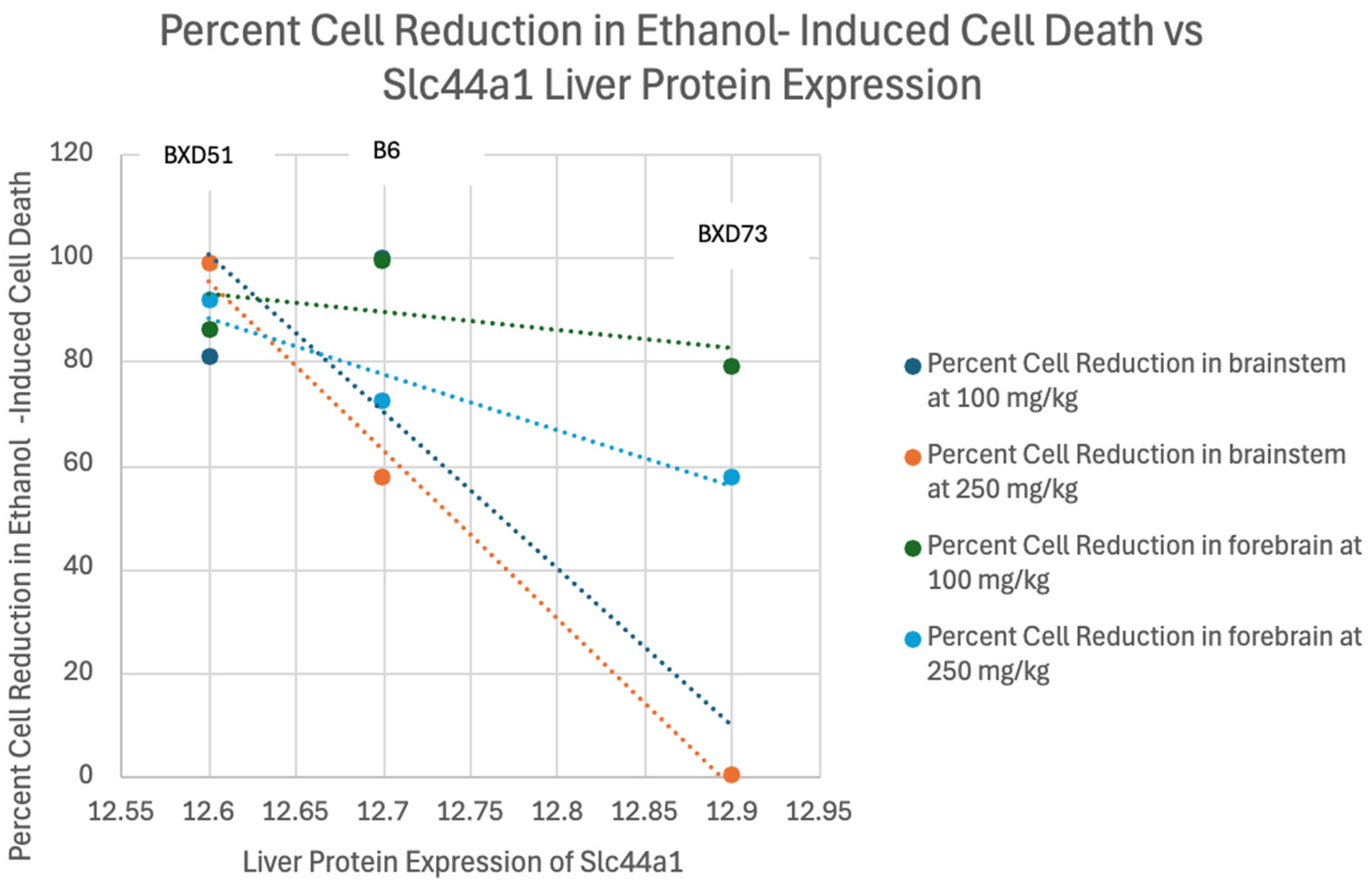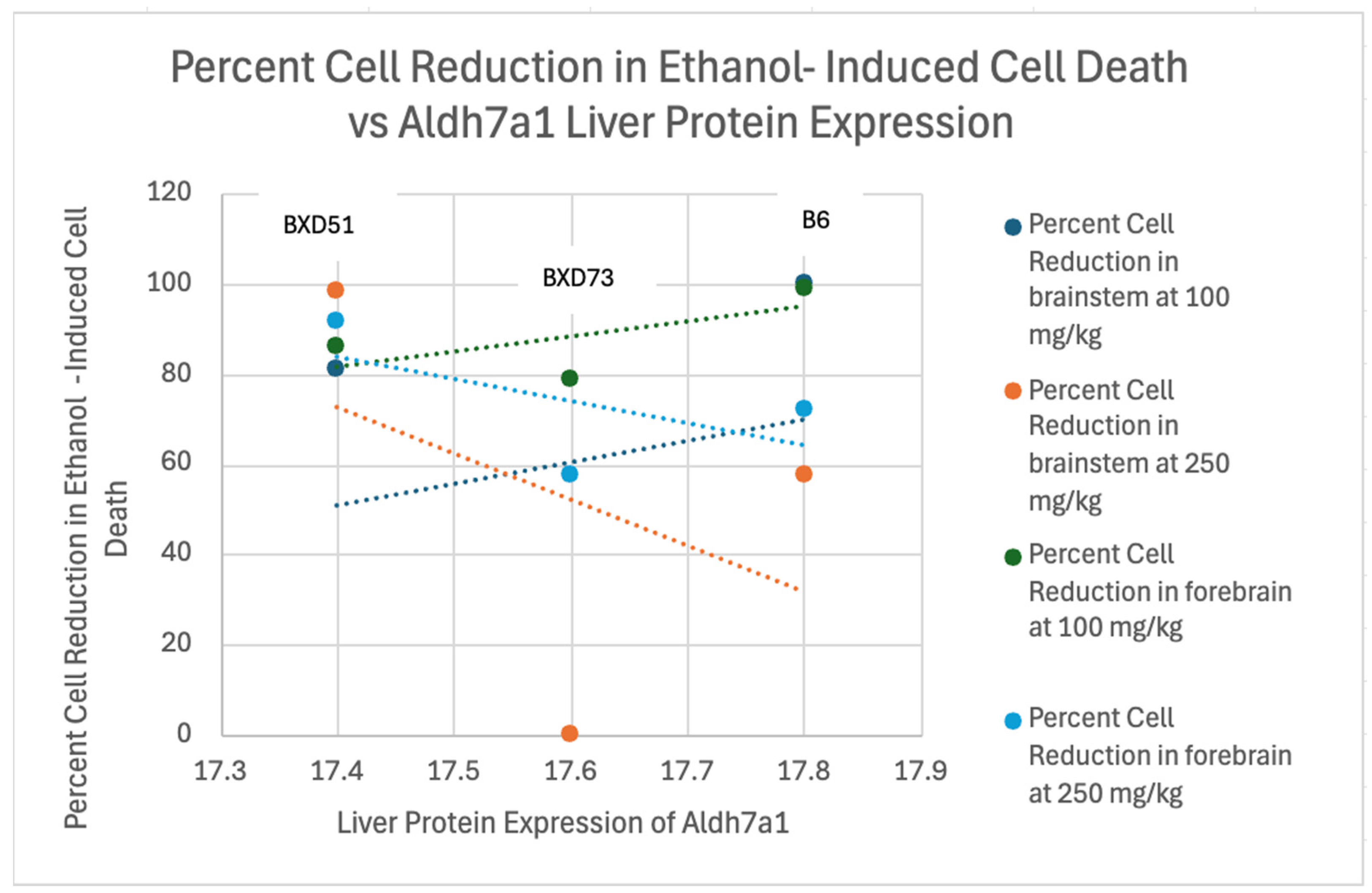 Correlation analyses were conducted to evaluate the relationship between liver protein expression values and percent reduction in ethanol-induced cell death (See Figure 2, Figure 3 and Figure 4). This step of the analysis was to identify general trends between liver protein expression values and percent reduction in ethanol-induced cell death and was not performed to elucidate the strengths of correlations due to the low sample size. Two genes (Cept1 and Slc44a1) were the only genes that demonstrated a trend between level of protein expression in the liver and percent cell death in the forebrain and brainstem, with at least ¾ of the correlations having Pearson coefficients above 0.7 (See Table 4). For Cept1, the brainstem p-values ranged from 0.11 to 0.27, and for Slc44a1, the brainstem p-values ranged from 0.06 to 0.33. The forebrain p-values for both genes were not significant. Aldh7a1 was removed for not demonstrating any positive or negative trends. Positive correlations within the data indicated that increased liver protein expression of the gene could possibly correlate with increased levels of cell death in the brain. Of note, the BXD51 and B6 strains had similar liver protein expression levels of Cept1, resulting in their differing percent cell reduction in ethanol-induced cell death data points being plotted for the same liver protein expression value. Further information about raw numeric values used in correlation calculations, including proteome values, percent cell death means per strain, and sample sizes, can be found in the Supplementary Materials.