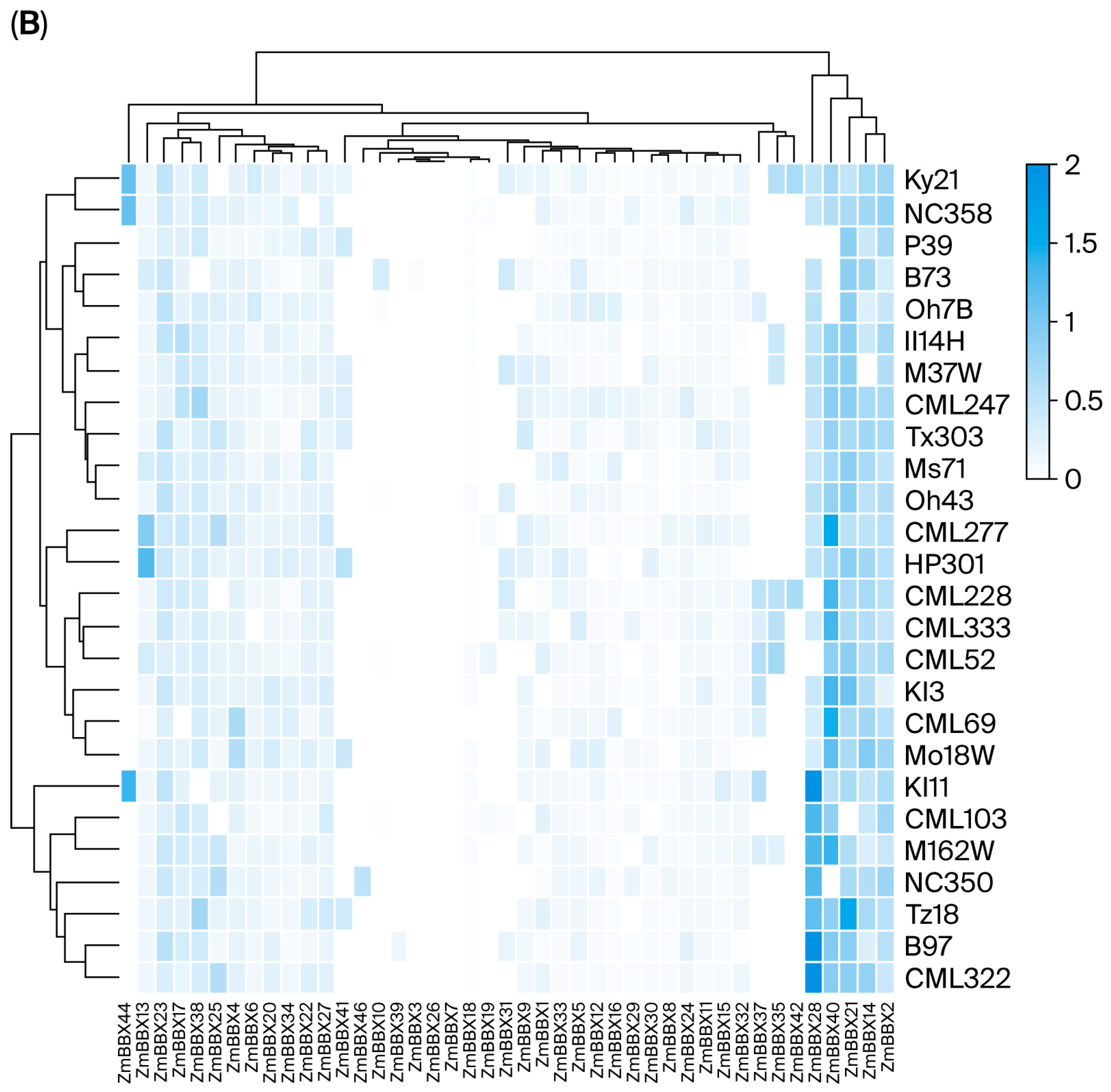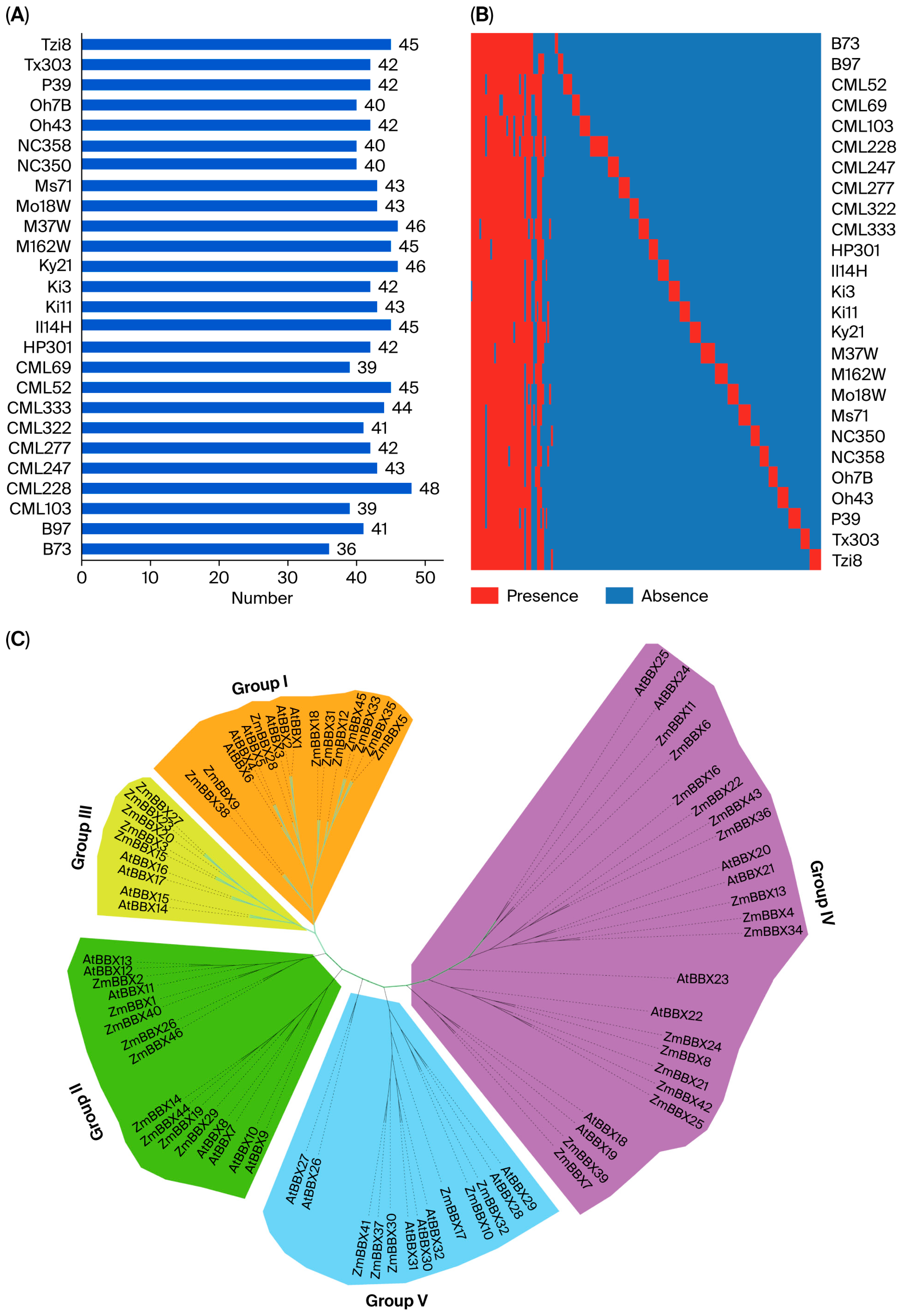 1.2. Phylogenetic Analysis of and Presence/Absence Variation in ZmBBX Gene Family