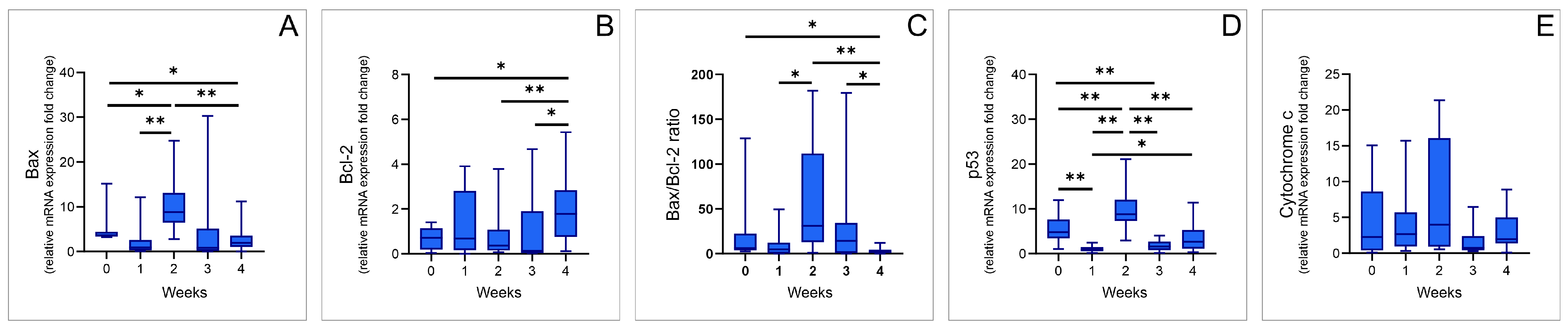 - Suroto, H.; Asriel, A.; De Vega, B.; Samijo, S.K. Early and Late Apoptosis Protein Expression (Bcl-2, BAX and P53) in Traumatic Brachial Plexus Injury. J. Musculoskelet. Neuronal Interact. 2021, 21, 528–532. [Google Scholar]