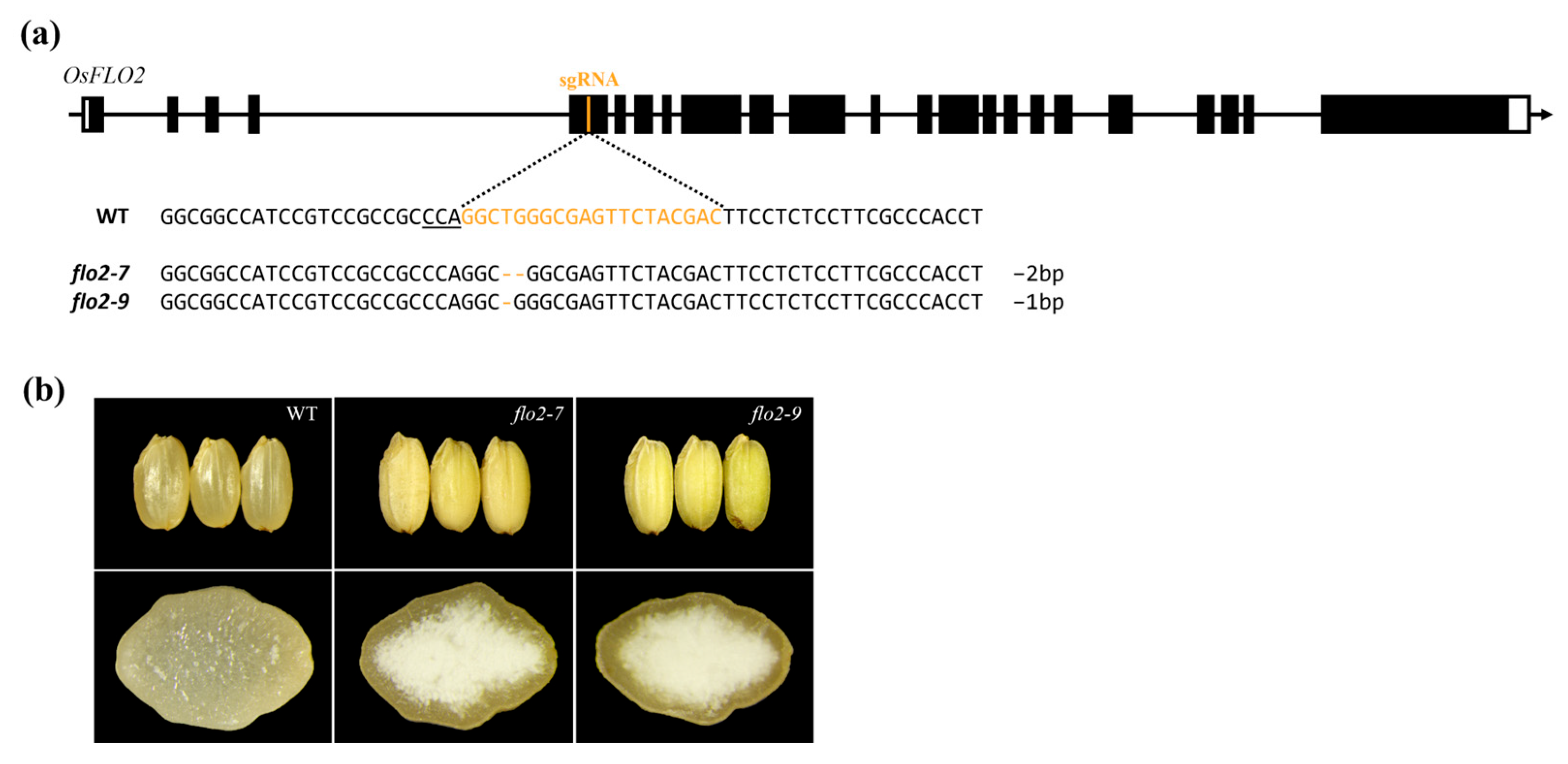 - Lin, L.; Qiu, J.; Zhang, L.; Wei, C. Identification and Analysis of Nine New flo2 Allelic Mutants in Rice. J. Plant Physiol. 2024, 301, 154300. [Google Scholar] [CrossRef] [PubMed]