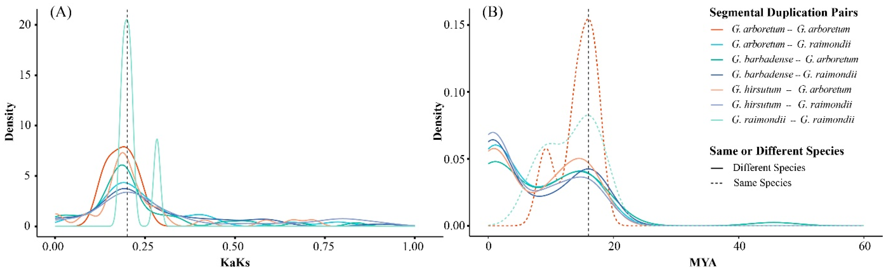 - Udall, J.A.; Long, E.; Hanson, C.; Yuan, D.; Ramaraj, T.; Conover, J.L.; Gong, L.; Arick, M.A.; Grover, C.E.; Peterson, D.G.; et al. De Novo Genome Sequence Assemblies of Gossypium raimondii and Gossypium turneri. G3-Genes Genomes Genet. 2019, 9, 3079–3085. [Google Scholar] [CrossRef]