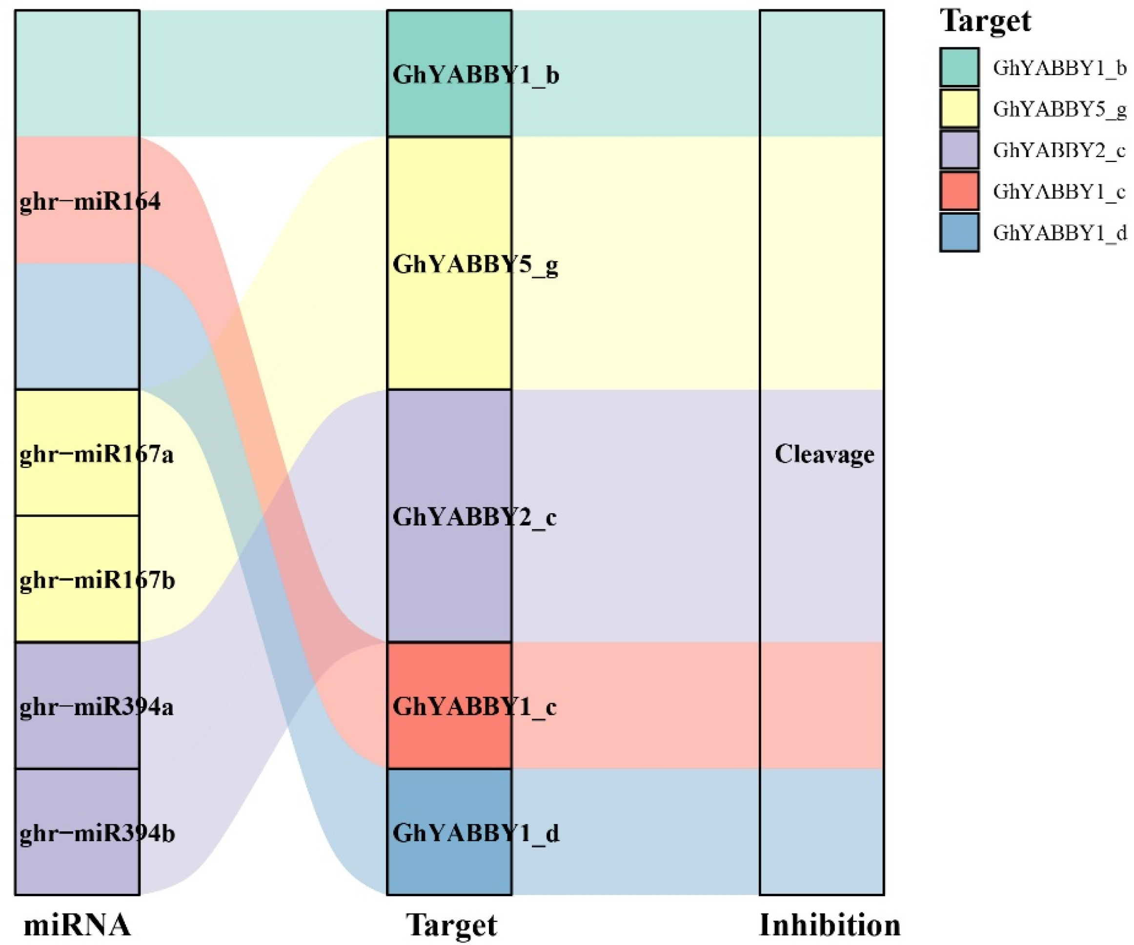 3.8. The miRNA Targeting Analysis of G. hirsutum YABBY Genes