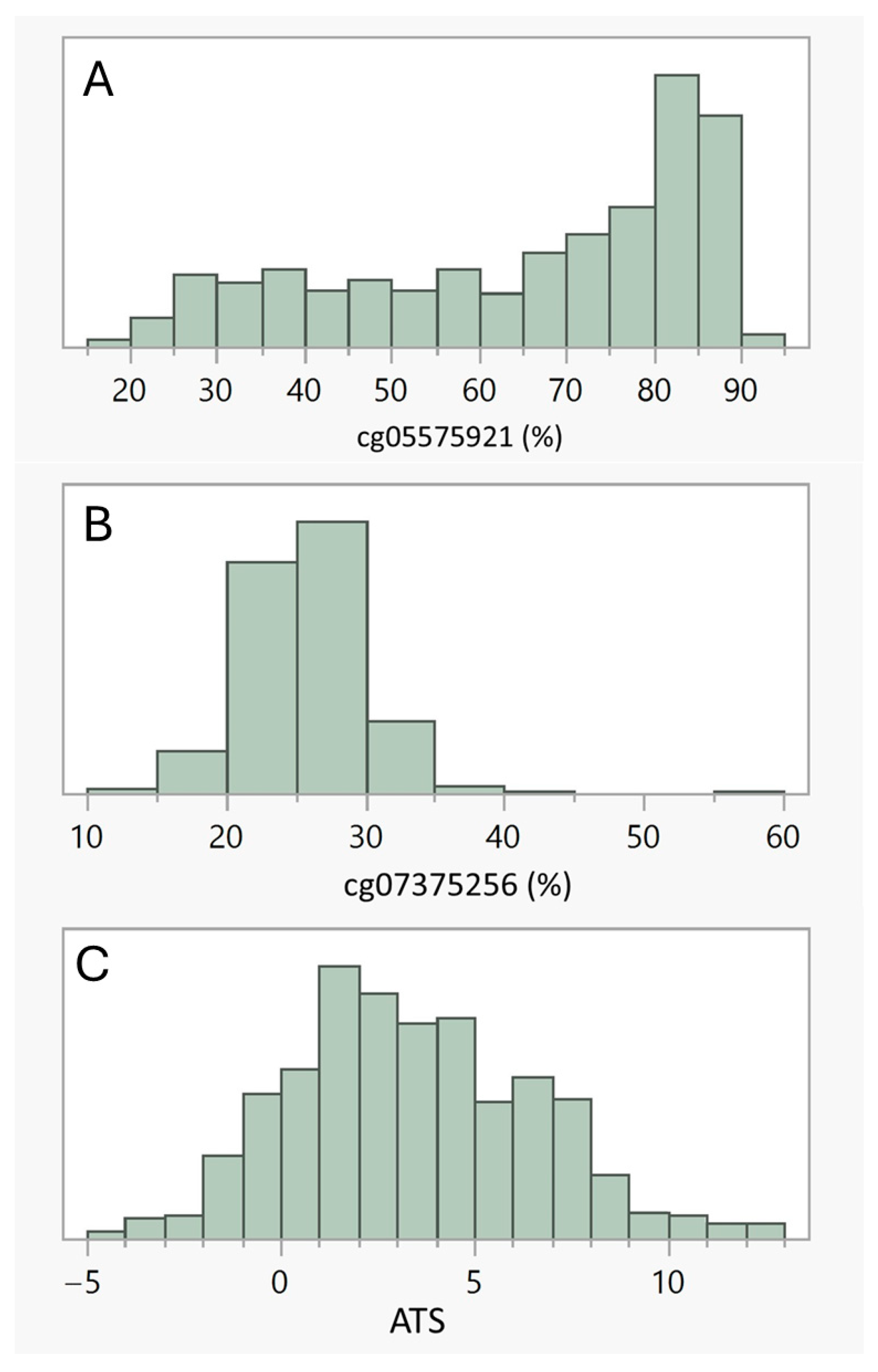 19]. As for cg05575921, cg07375256 values were reported as a methylation percentage. In contrast, the ATS is the sum of z-scores of the four loci named above and is a zero-centered metric in abstinent populations [