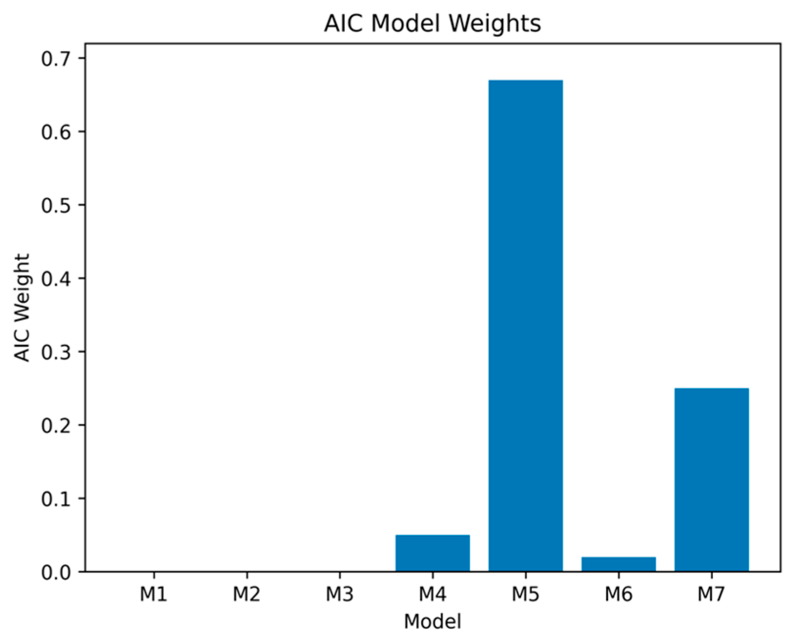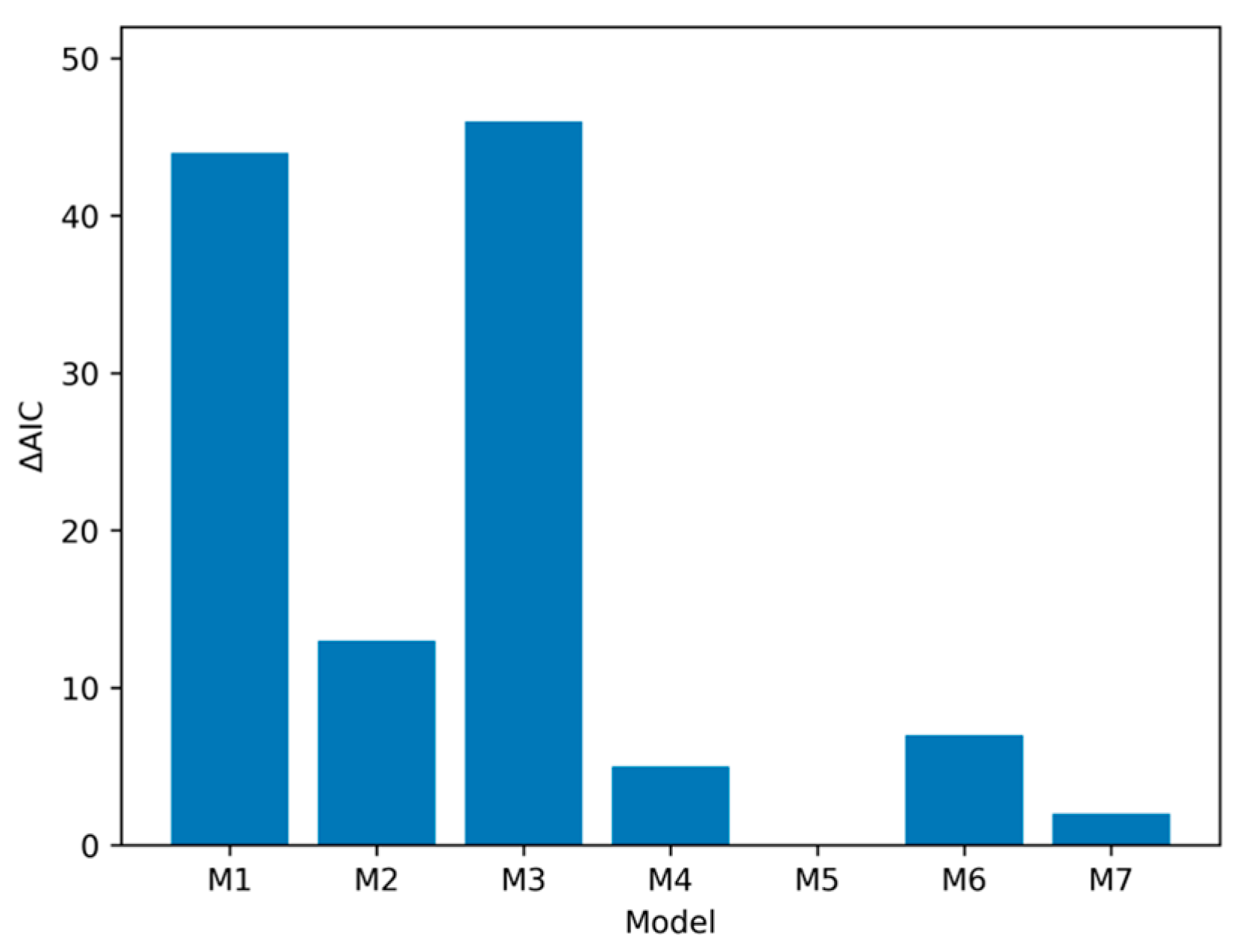 To quantify the relative support for each candidate model, we also computed Akaike weights to provide a quantitative estimate of the probability that our best fitting model was likely to be robust in future replications. We transformed each model’s ΔAIC relative to Model 5 into a relative likelihood of being the correct model using the expression
