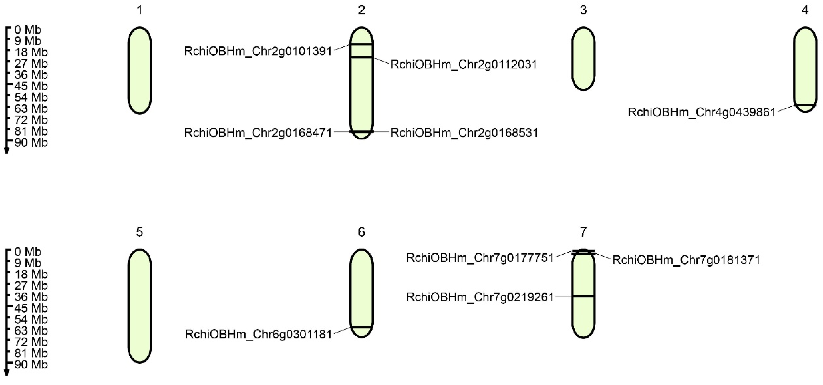 3.3. Chromosomal Distribution of Rose ZF-HD Genes