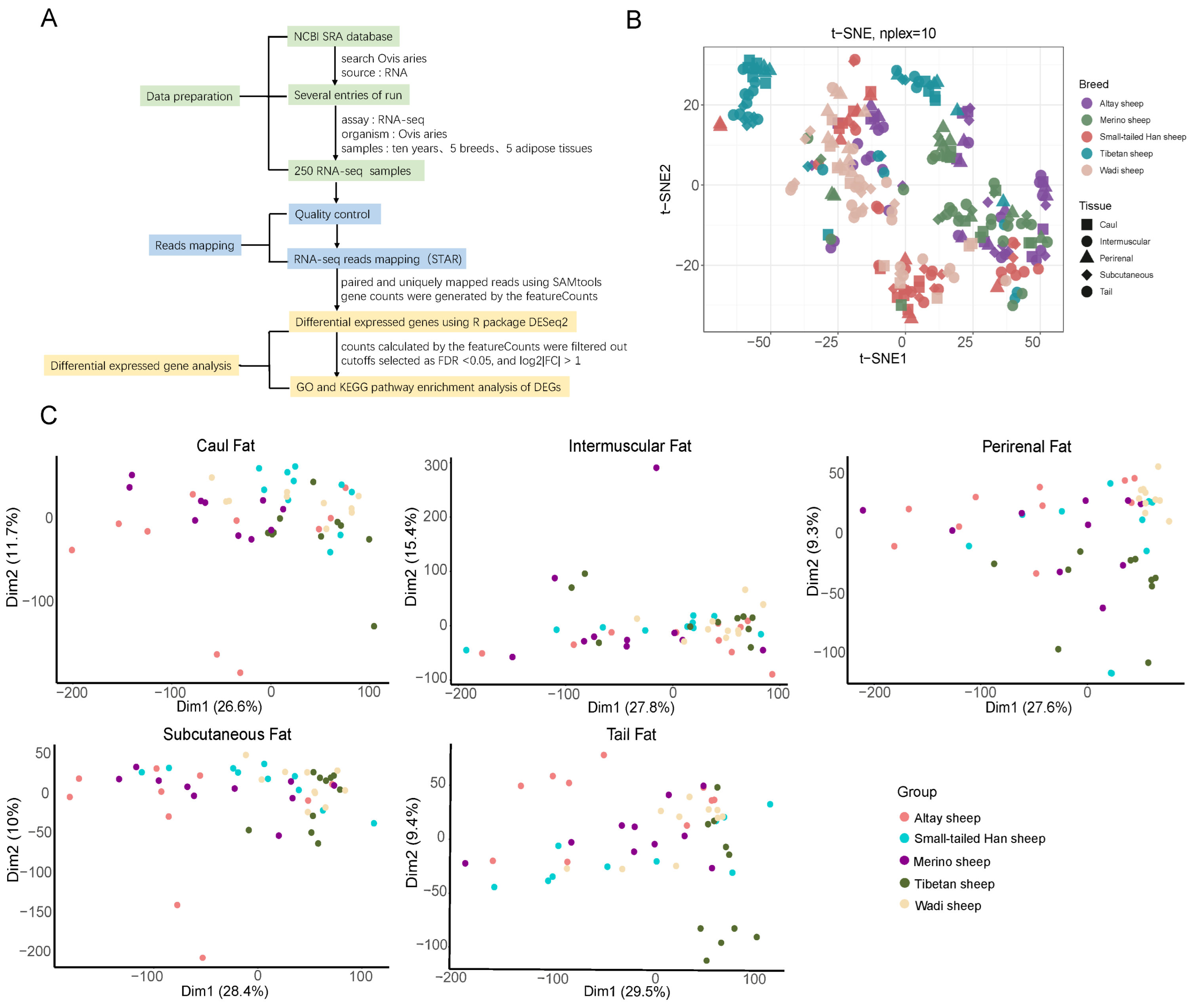 To fill this gap, we conducted a large-scale transcriptomic analysis across five adipose depots (caul, subcutaneous, perirenal, tail, intermuscular fat) in five sheep breeds (Altay sheep, Tibetan sheep, Merino sheep, Wadi sheep, Small-tailed Han sheep), consisting of 250 RNA-seq samples, with 10 biological replicates per depot per breed, enabling a comprehensive examination of breed- and depot-specific transcriptional regulation. Differential expression gene and GO/KEGG enrichment analyses were implemented to explore shared and unique mechanisms associated with fat deposition. We highlight candidate genes and transcription factors (TFs) essential for the tail fat metabolism and tail-type divergence among breeds. Our results provide insights into genetic mechanisms of fat metabolism in different adipose tissues and lay an important foundation for sheep breeding in future.