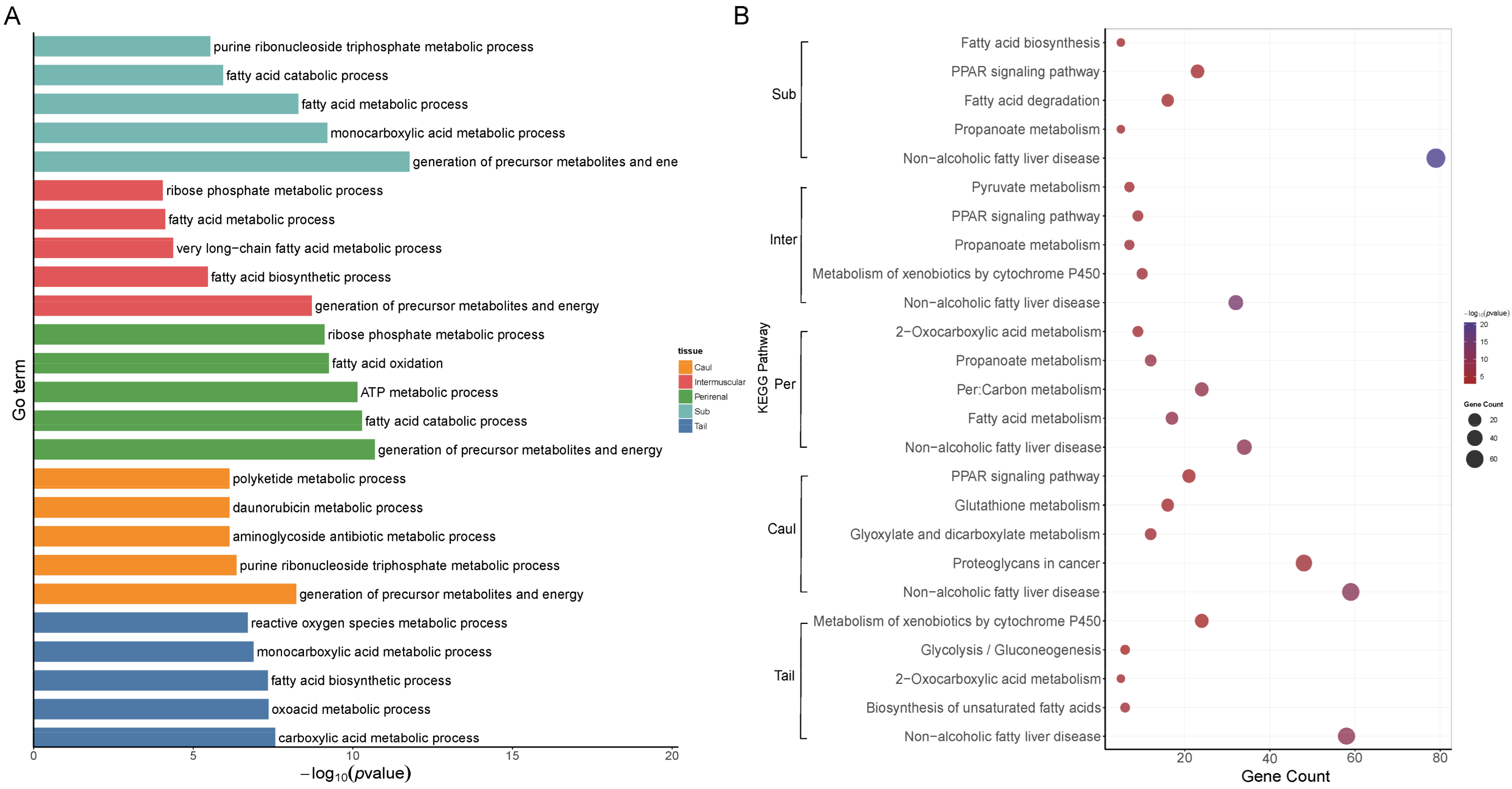We observed marked differences in DEGs and enriched functions among caul, subcutaneous, perirenal, intermuscular, and tail fat highlighted distinct physiological roles [
