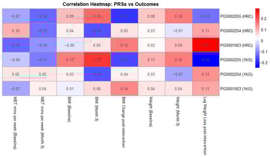 Additionally, as shown in Figure 1, we investigated correlations between the examined PRSs and MET-mins/week as well as weight loss across the 3-month intervention period. None of the PRSs showed statistically significant correlations with MET-minutes/week, either at baseline or post-intervention, with correlation coefficients ranging from −0.13 to 0.10, p-values exceeding 0.08, and confidence intervals crossing zero. Similarly, no statistically significant associations were observed between PRS and BMI change or weight loss, with coefficients ranging from −0.18 to 0.19. The strongest trend was observed for PGS001923 (HRC-imputed), which showed a weak positive correlation with weight loss (r = 0.187, p = 0.093), suggesting a potential association that warrants further investigation.