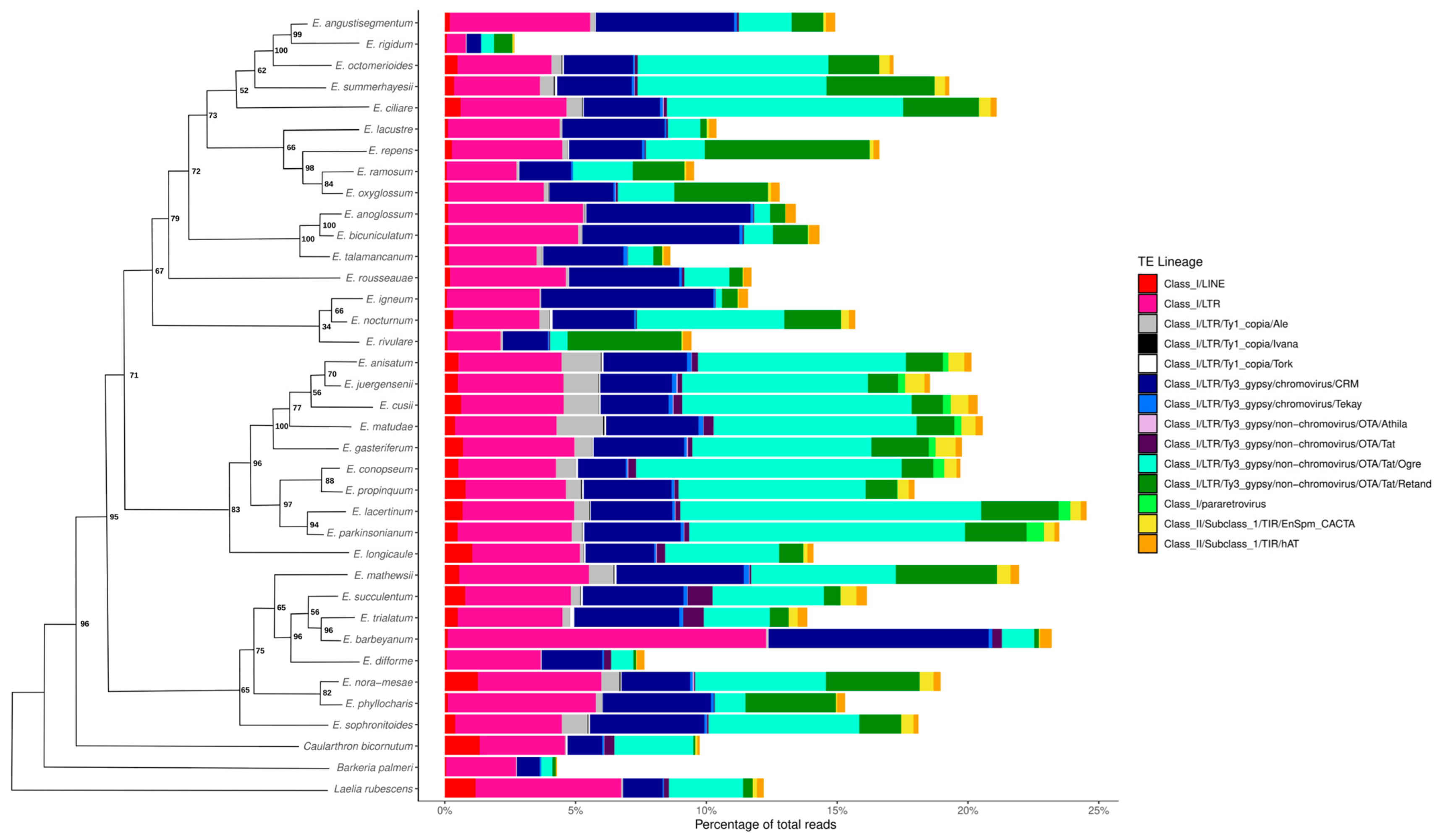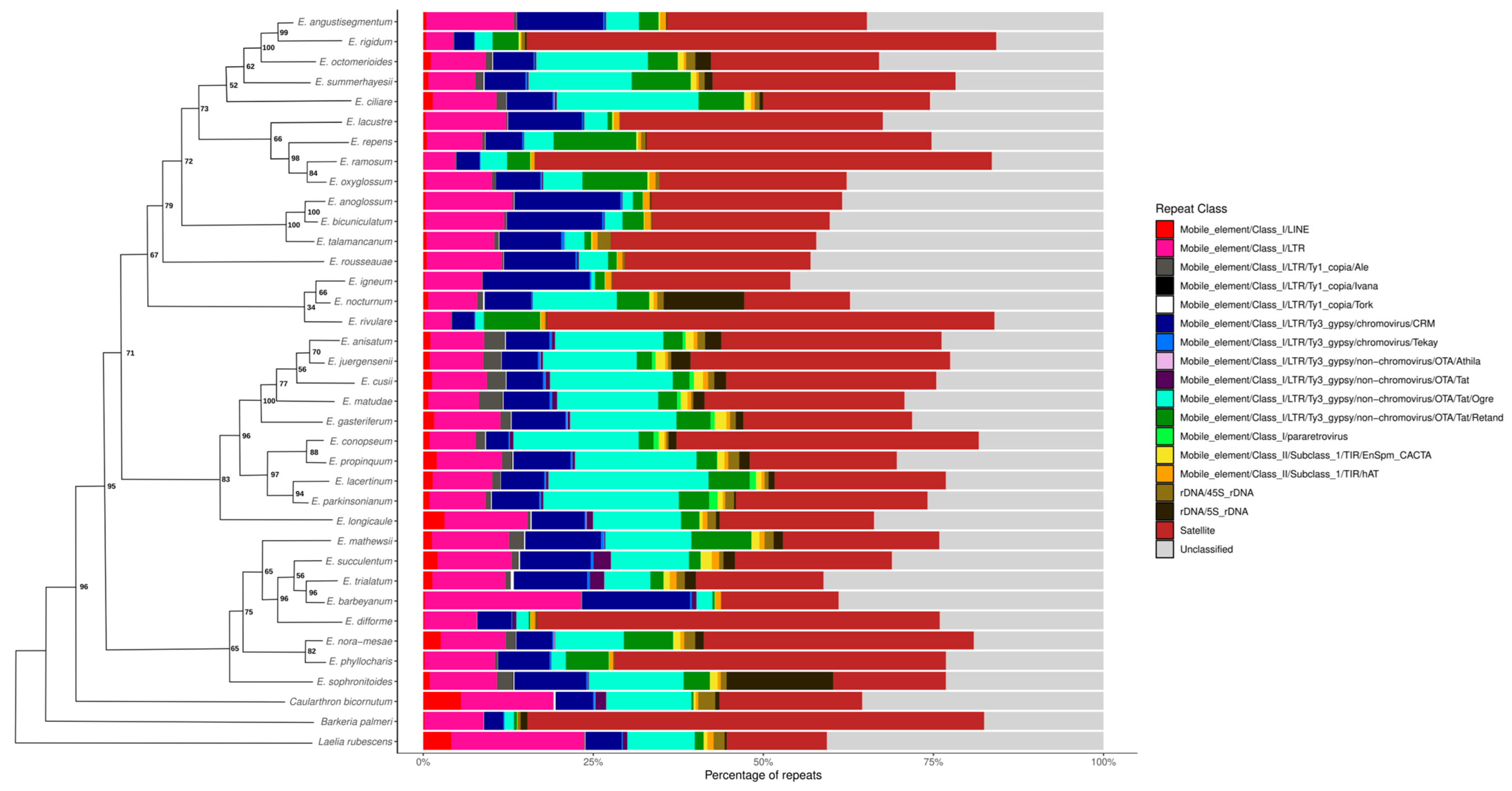 2.5. Comparative Analysis of the Repeatome Composition in Epidendrum