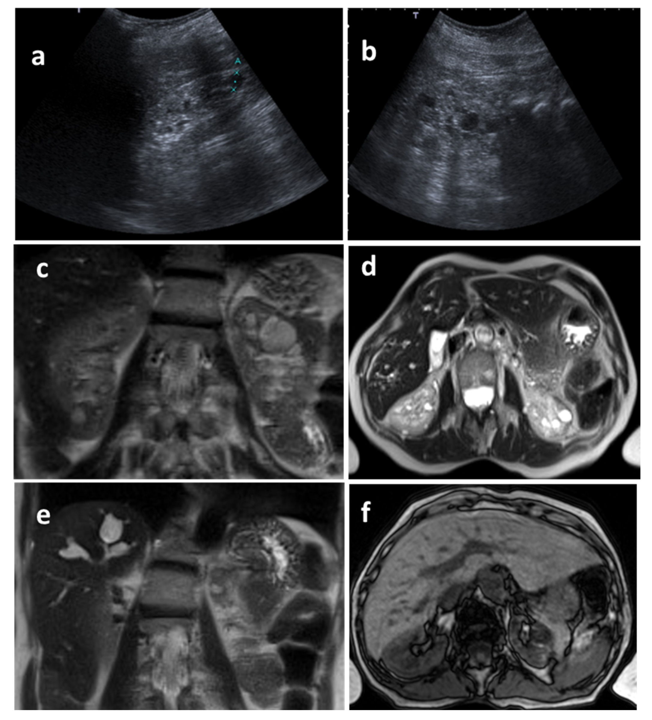 - Gimpel, C.; Avni, F.E.; Breysem, L.; Burgmaier, K.; Caroli, A.; Cetiner, M.; Haffner, D.; Hartung, E.A.; Fanke, D.; König, J.; et al. Imaging of kidney and liver disease in autosomal recessive polycystic kidney disease. Radiology 2019, 290, 759–782. [Google Scholar]