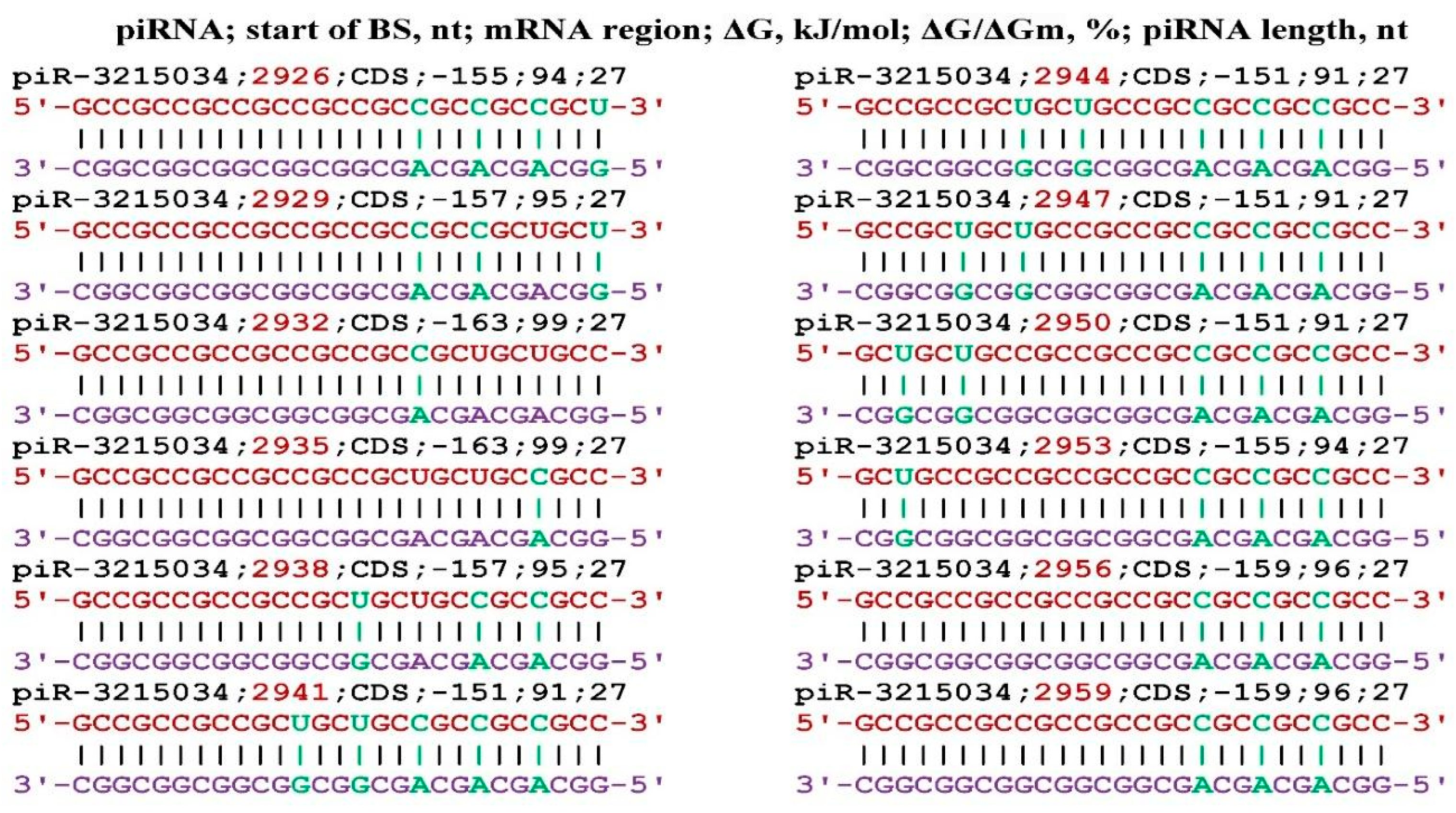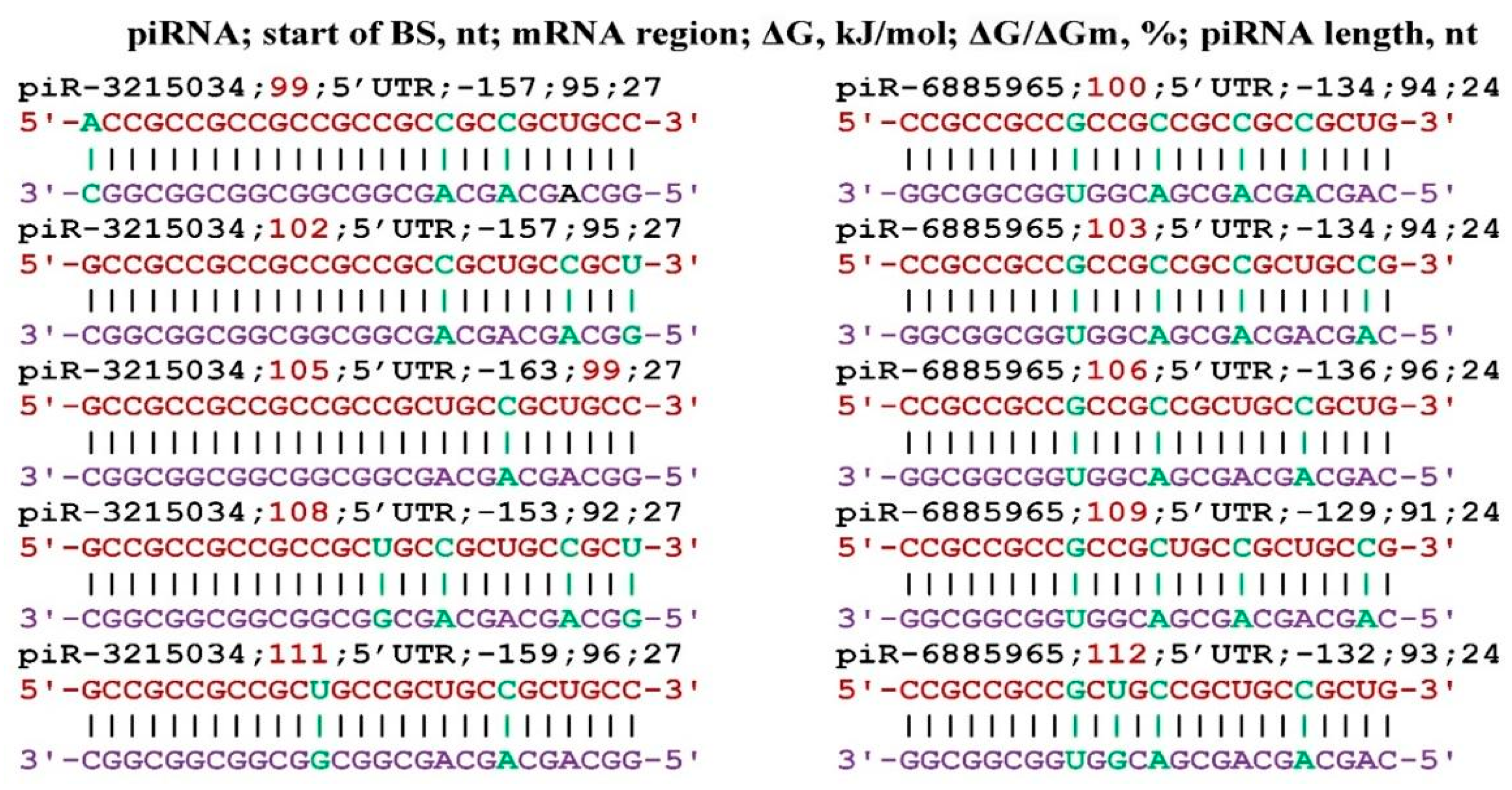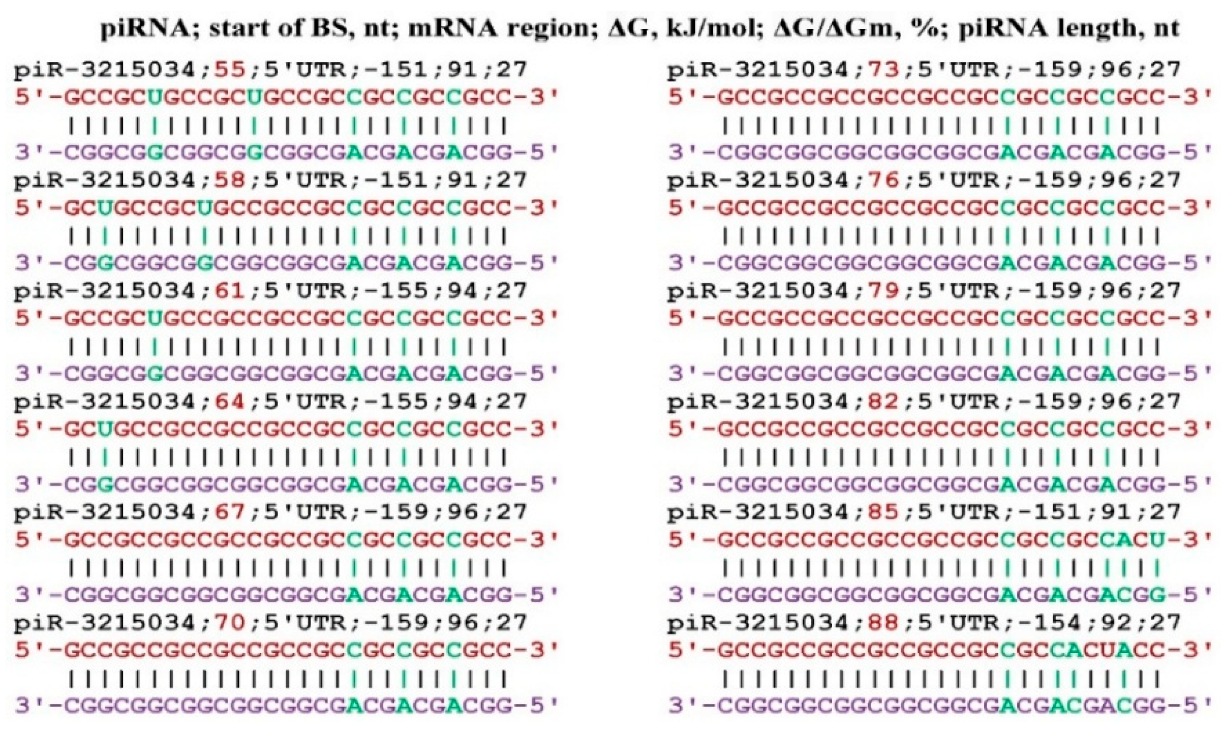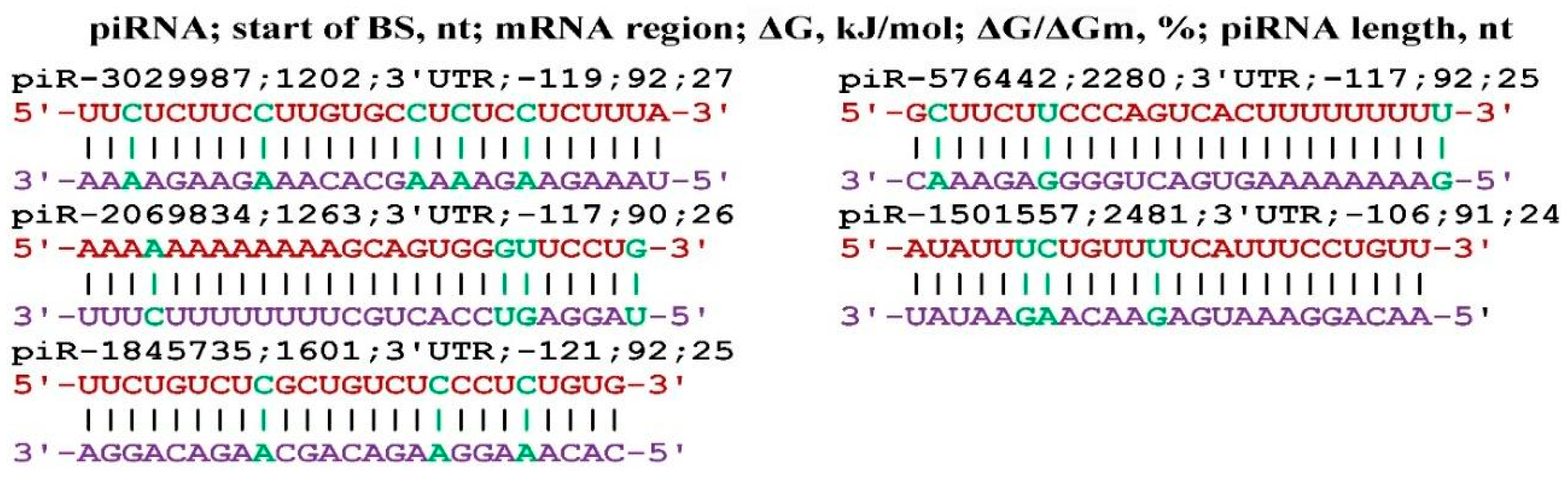 - Belkozhayev, A.; Niyazova, R.; Wilson, C.; Jainakbayev, N.; Pyrkova, A.; Ashirbekov, Y.; Akimniyazova, A.; Sharipov, K.; Ivashchenko, A. Bioinformatics Analysis of the Interaction of miRNAs and piRNAs with Human mRNA Genes Having Di- and Trinucleotide Repeats. Genes 2022, 13, 800. [Google Scholar] [CrossRef]