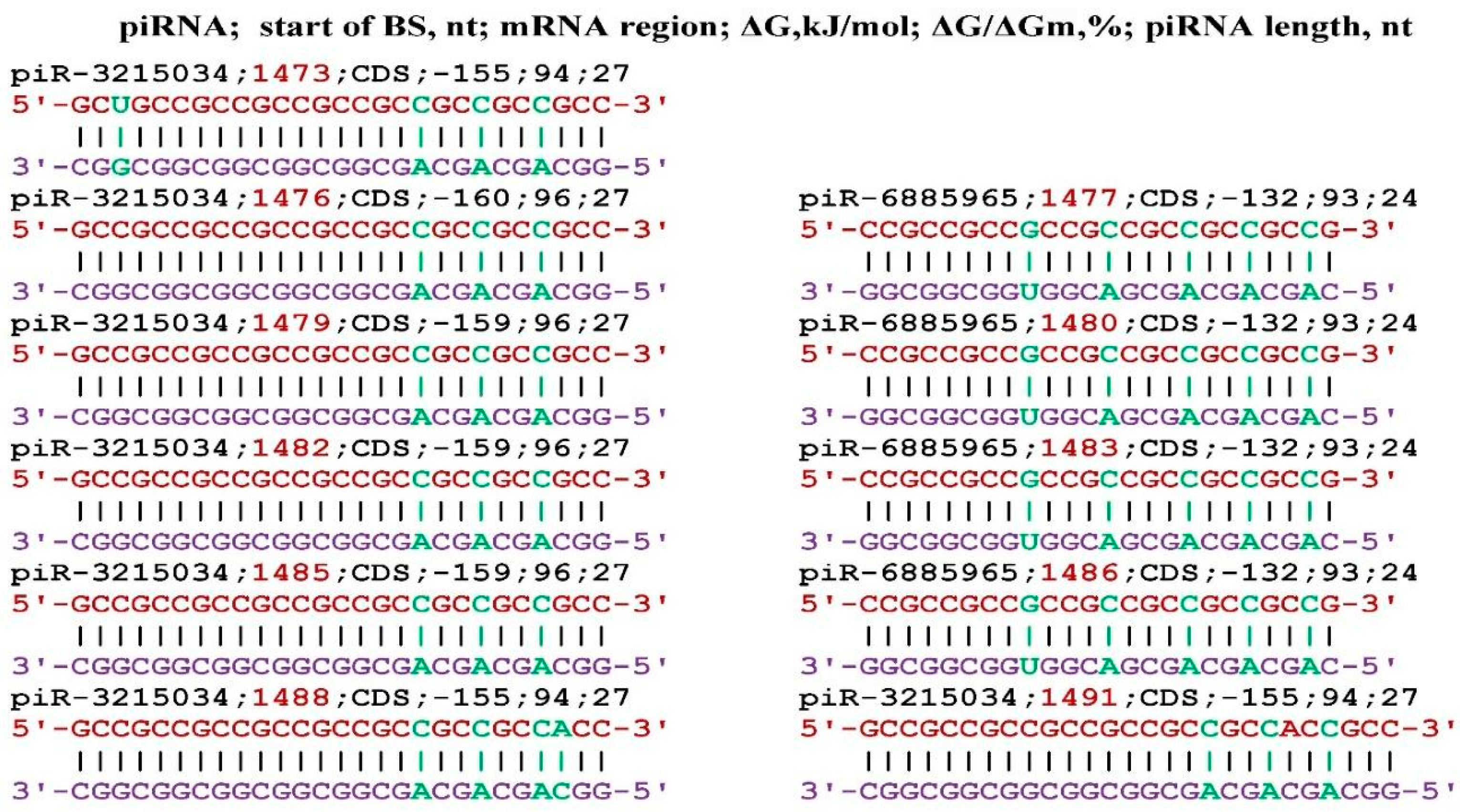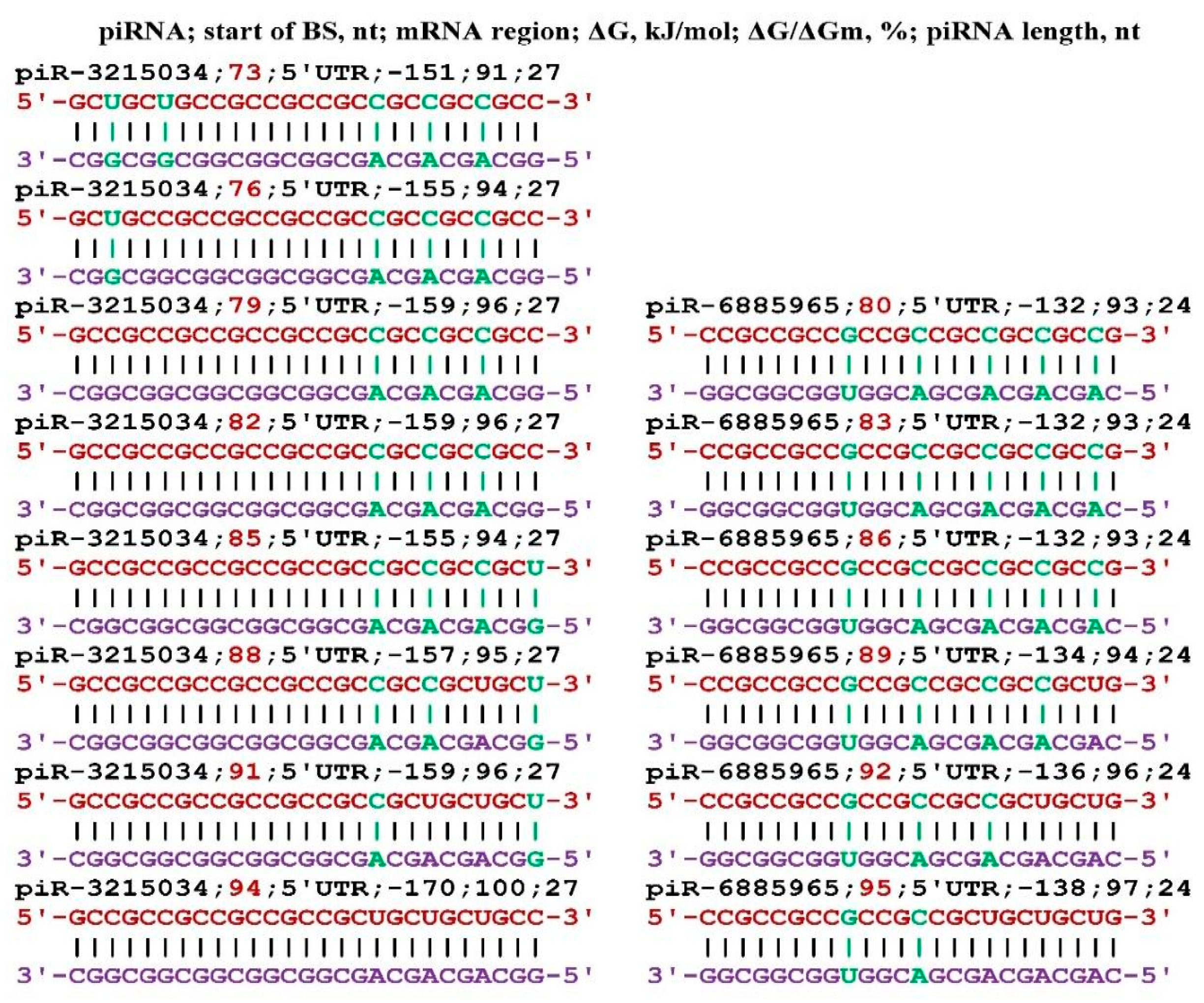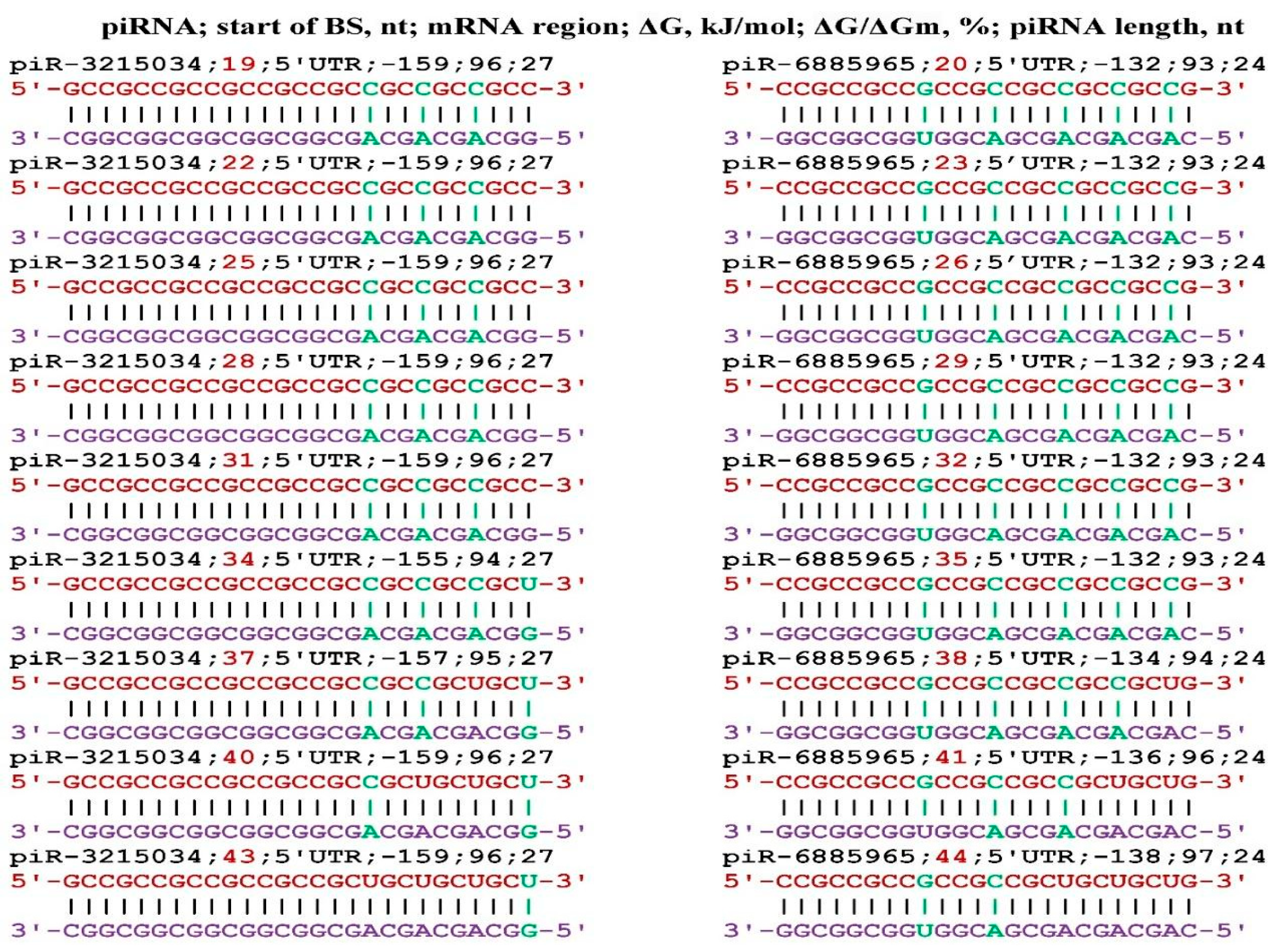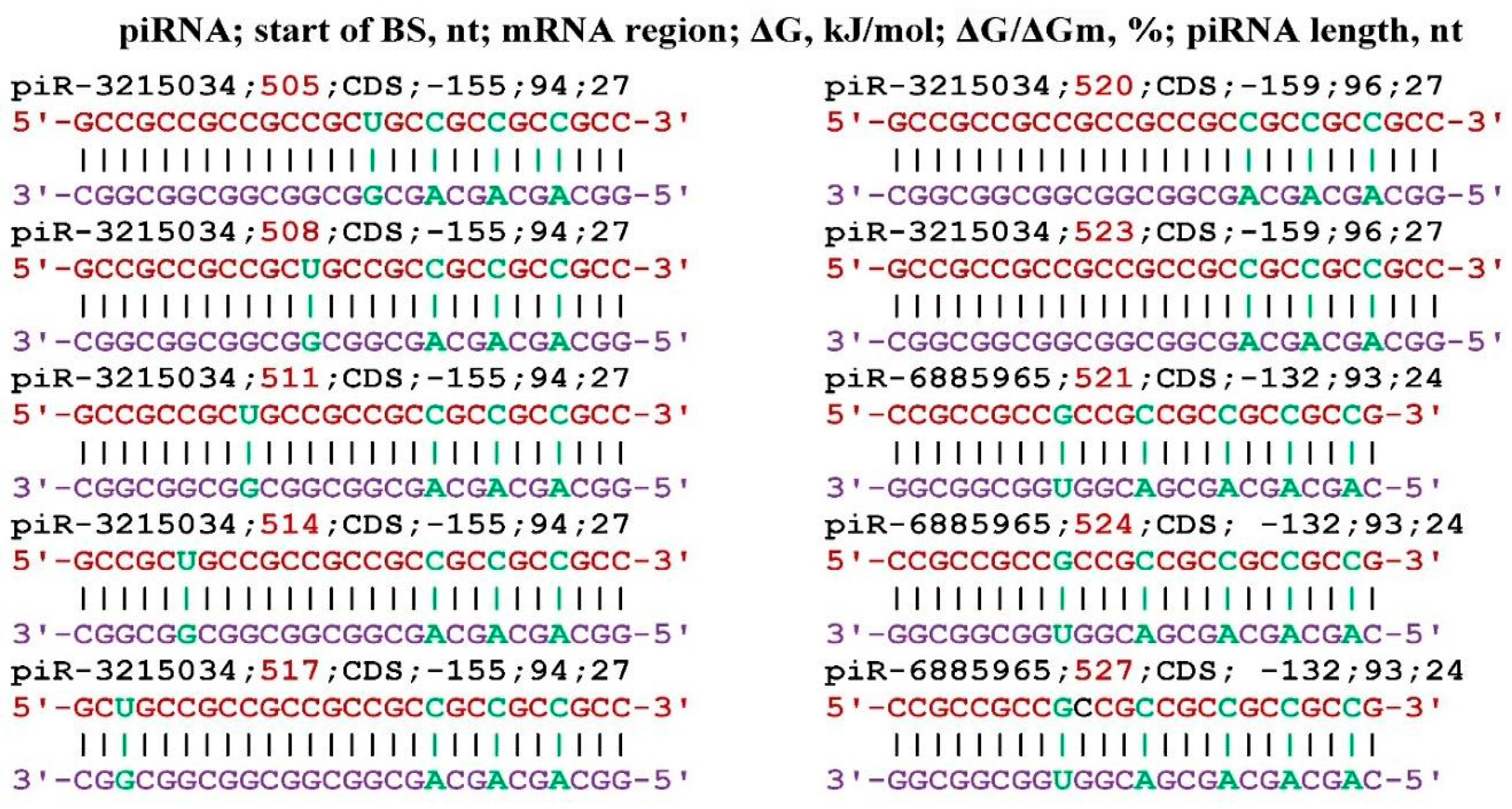 - Belkozhayev, A.; Niyazova, R.; Wilson, C.; Jainakbayev, N.; Pyrkova, A.; Ashirbekov, Y.; Akimniyazova, A.; Sharipov, K.; Ivashchenko, A. Bioinformatics Analysis of the Interaction of miRNAs and piRNAs with Human mRNA Genes Having Di- and Trinucleotide Repeats. Genes 2022, 13, 800. [Google Scholar] [CrossRef]