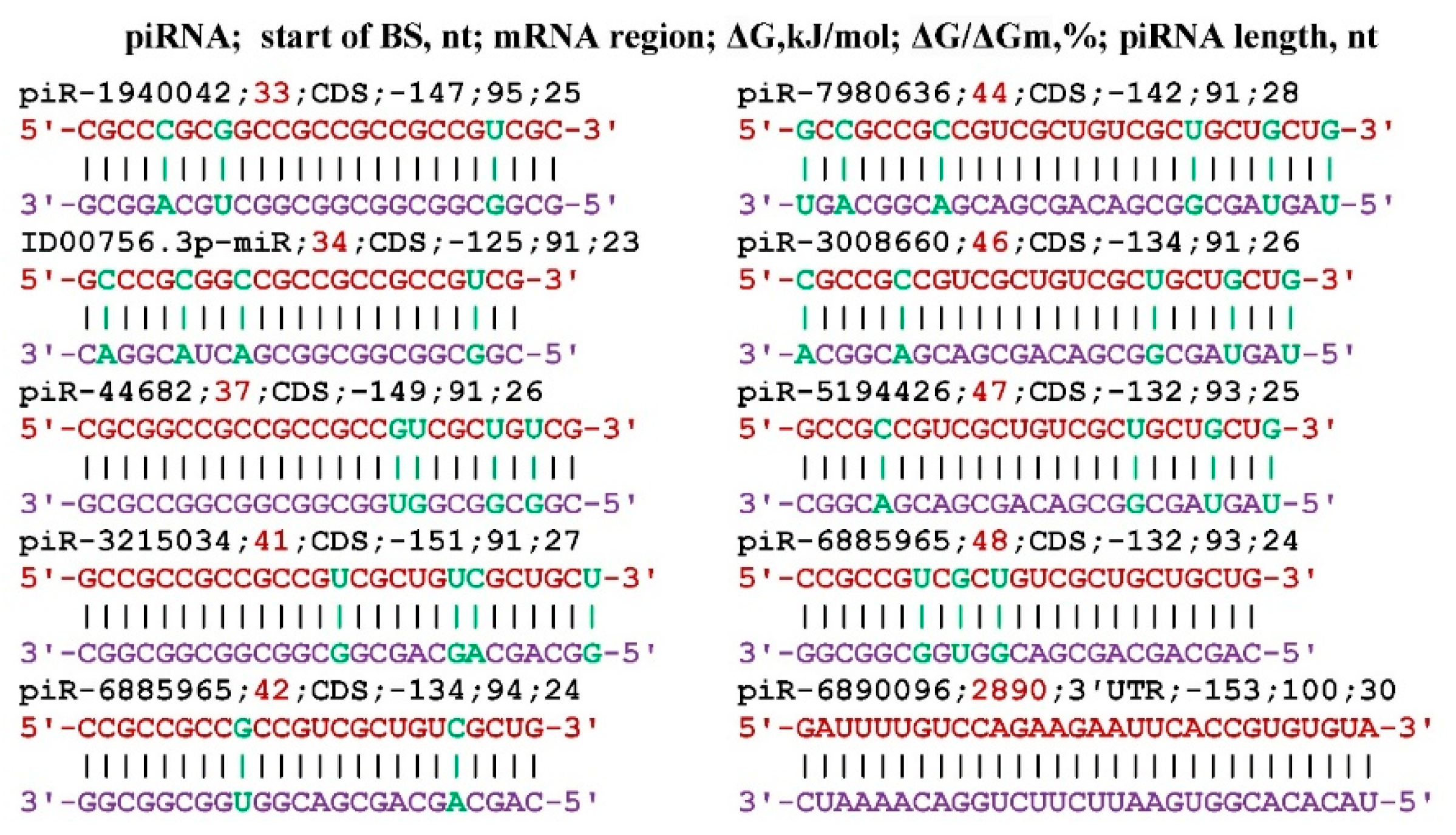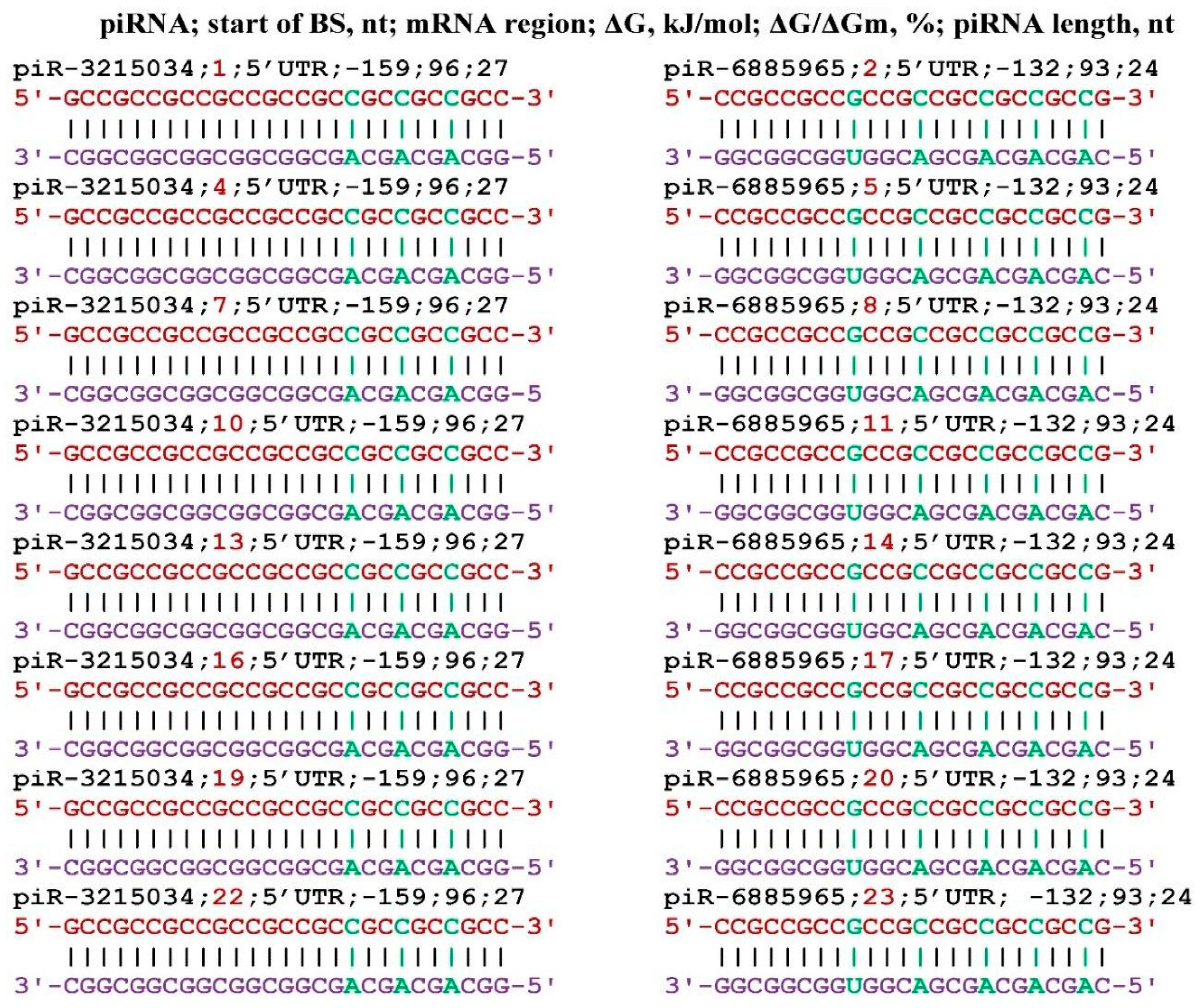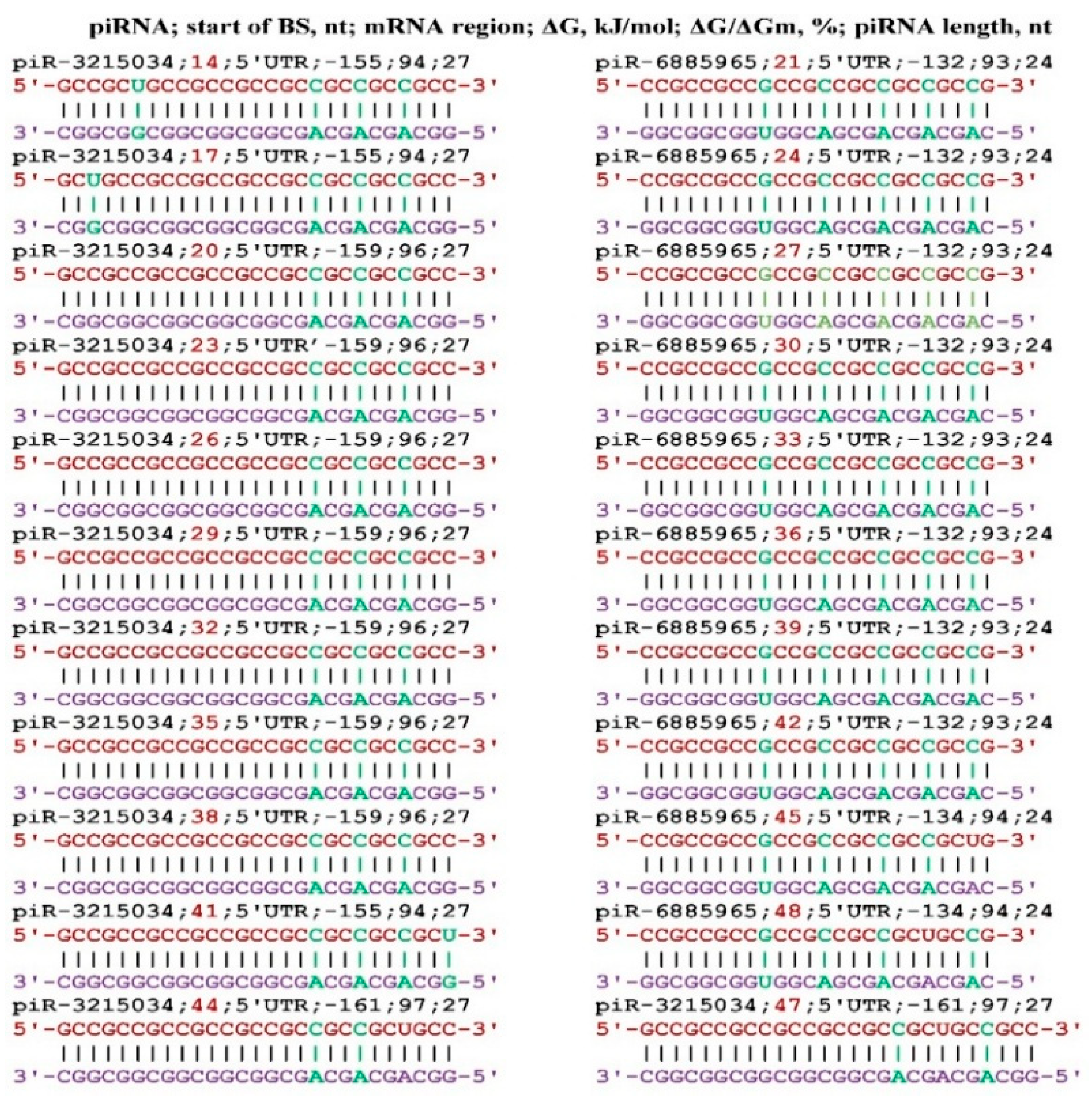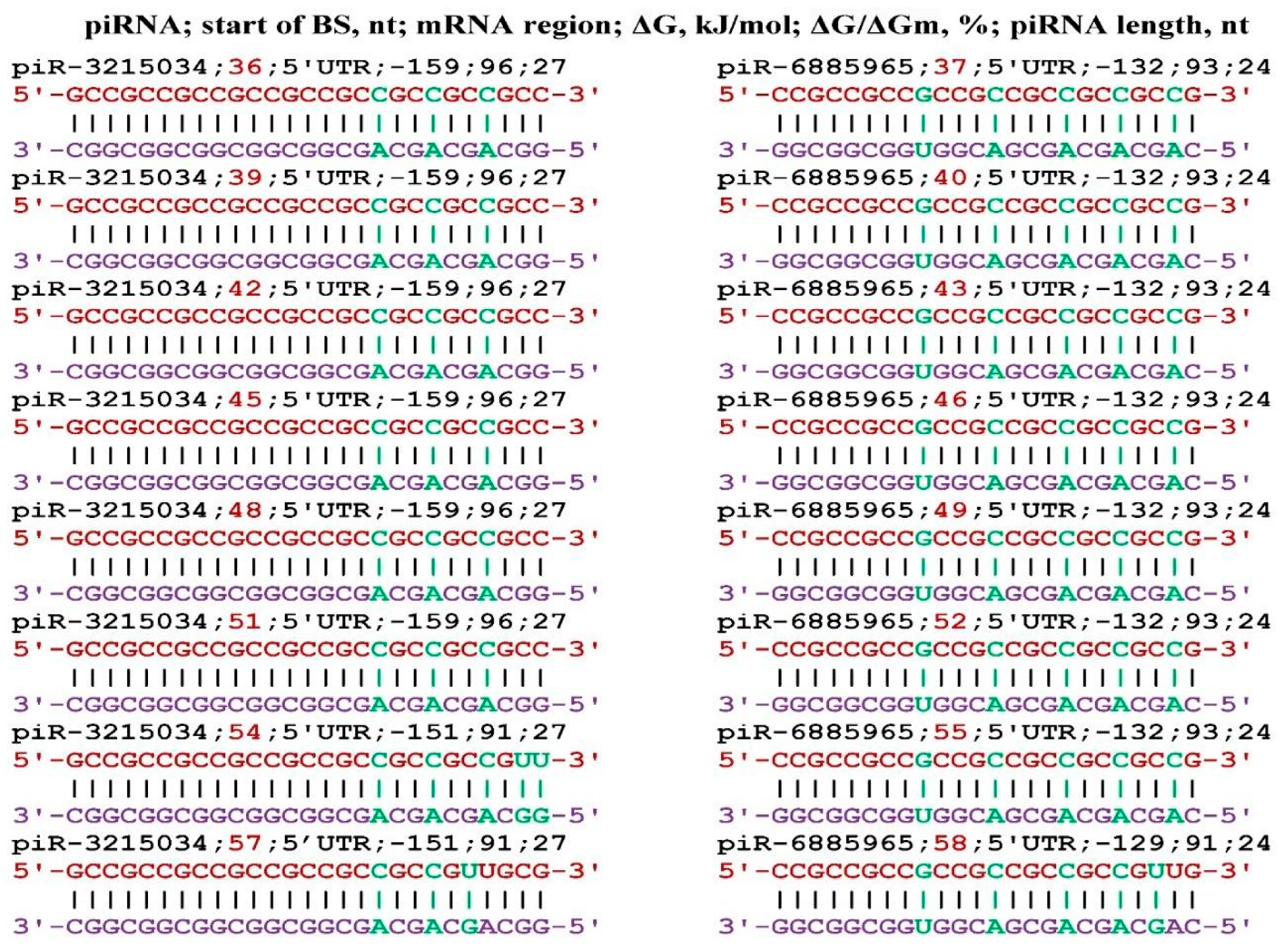 - Belkozhayev, A.; Niyazova, R.; Wilson, C.; Jainakbayev, N.; Pyrkova, A.; Ashirbekov, Y.; Akimniyazova, A.; Sharipov, K.; Ivashchenko, A. Bioinformatics Analysis of the Interaction of miRNAs and piRNAs with Human mRNA Genes Having Di- and Trinucleotide Repeats. Genes 2022, 13, 800. [Google Scholar] [CrossRef]
