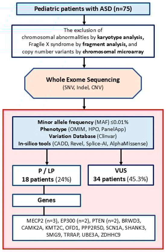 Aside from the clinical presentation, the genetic background of ASD is remarkably complex. Therefore, the rates of genetic diagnosis remain low, particularly in isolated ASD cases without additional findings [8,9,10]. Copy number alterations, a genetic mechanism of ASD, can be identified through molecular karyotyping, which is often the first-line test at many centers. However, copy number alterations account for only a small fraction of the molecular causes of ASD [11]. Most cases follow a monogenic inheritance pattern, with many related genes identified. A significant number of these cases are reported as autosomal-dominant [8], though recessive and polygenic inheritance patterns are also observed in ASD [12,13]. Thus, genetic screening for ASD requires a comprehensive genetic tool for differential diagnosis [14]. In the era of DNA sequencing technologies in clinical genetics, whole exome sequencing (WES) is a powerful tool that covers all exons and exon-intron boundaries throughout the genome. Hence, WES can enhance screening for previously reported variants across all genes and allow exploration of novel variants or genes linked to ASD [15]. Still, one of the major concerns in WES analysis is the evaluation of variants of unknown significance (VUSs). Reporting VUSs can be challenging, as it may mislead patient management or lead to the omission of other critical variants. Therefore, VUSs should be re-evaluated over time, as recent studies suggest [16], which further necessitates phenotype-genotype correlation-based studies.