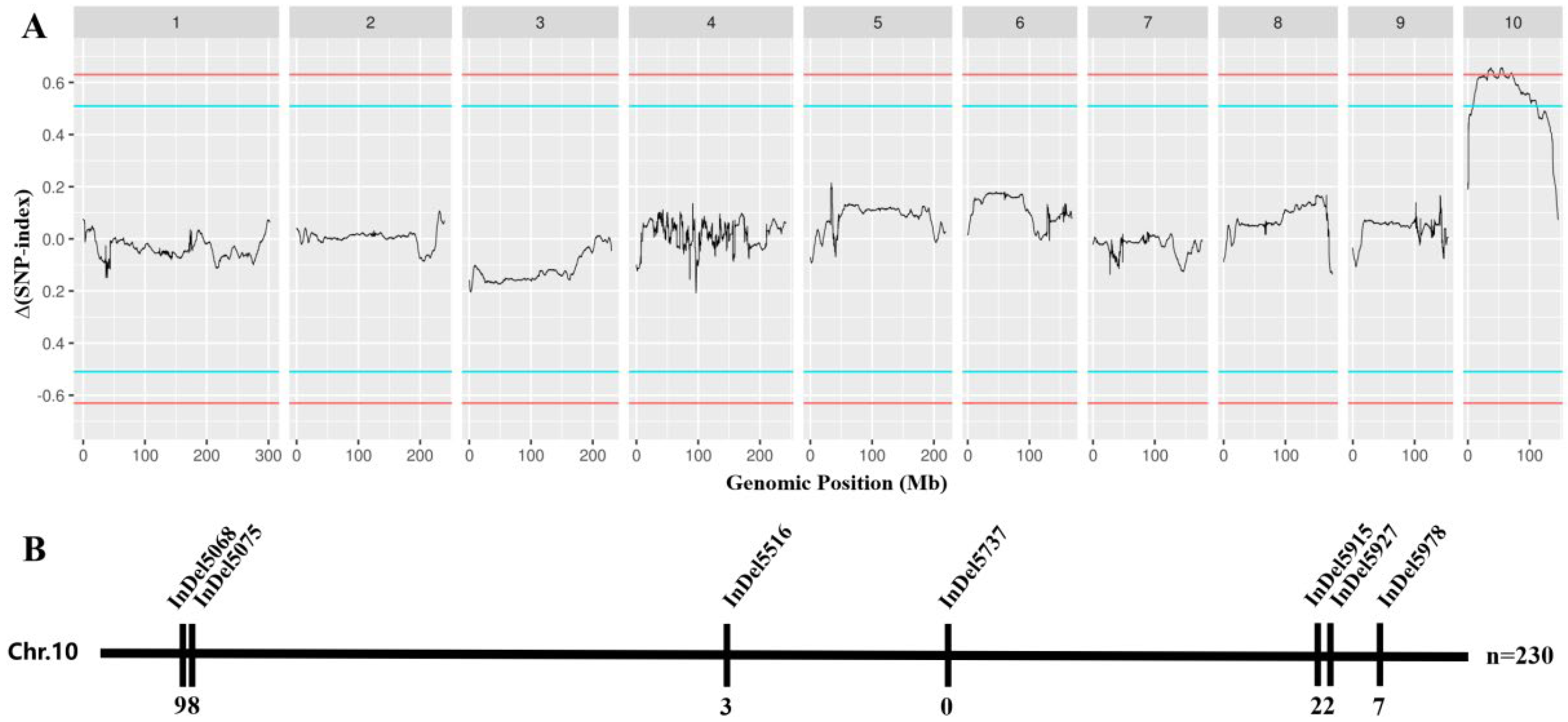 - Takagi, H.; Abe, A.; Yoshida, K.; Kosugi, S.; Natsume, S.; Mitsuoka, C.; Uemura, A.; Utsushi, H.; Tamiru, M.; Takuno, S.; et al. QTL-seq: Rapid mapping of quantitative trait loci in rice by whole genome resequencing of DNA from two bulked populations. Plant J. 2013, 74, 174–183. [Google Scholar] [CrossRef]