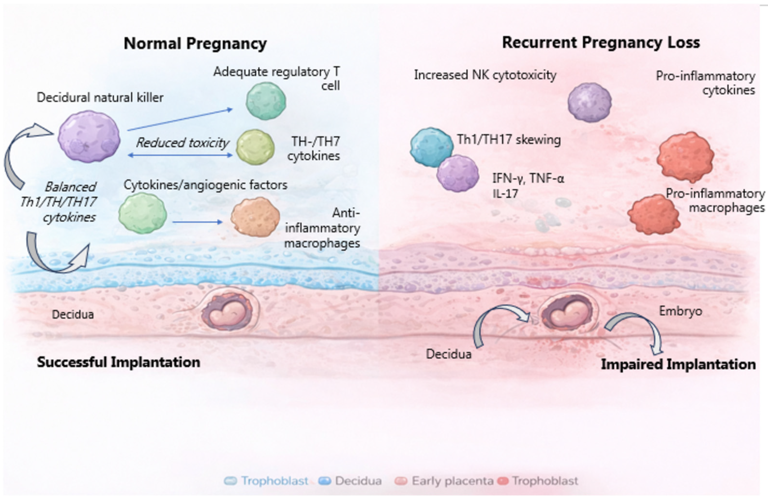 Proper maternal–fetal immunological tolerance is crucial for successful implantation and early placental development, especially at the maternal–fetal interface, where disruptions in immune cells and inflammation can lead to pregnancy loss [