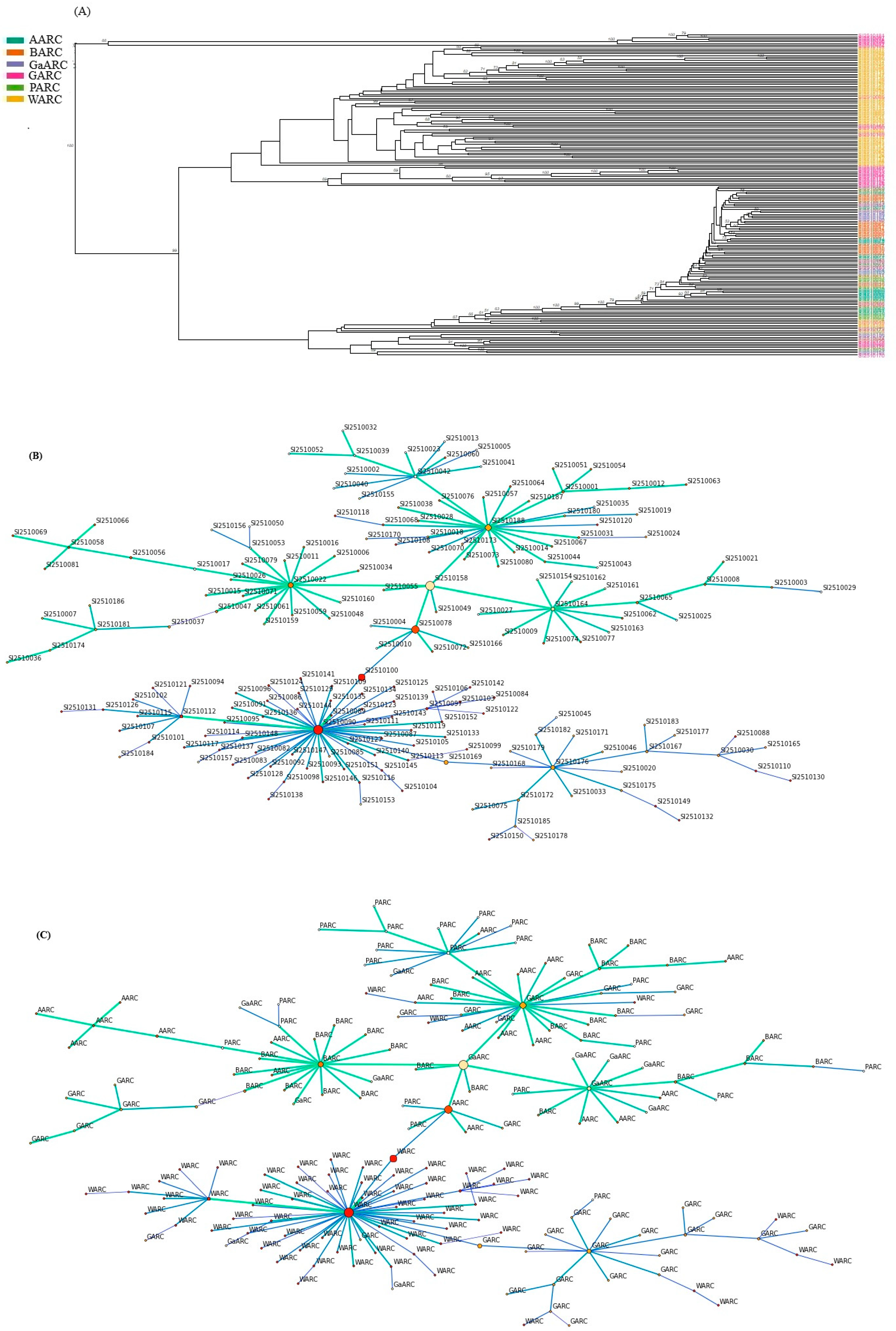 2.4. Genetic Relationship Visualization and Diversity Analysis