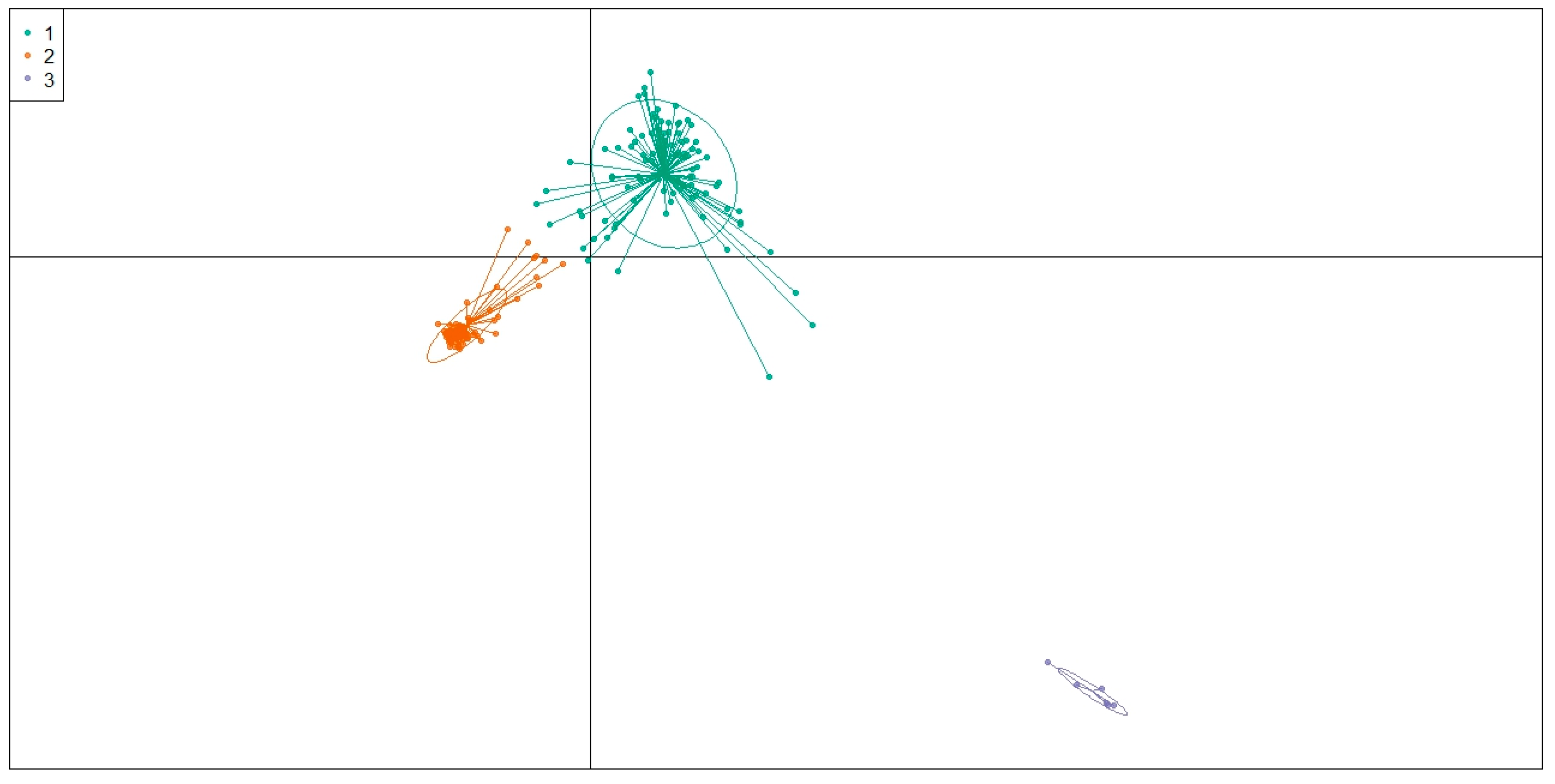 - Jombart, T.; Devillard, S.; Balloux, F. Discriminant analysis of principal components: A new method for the analysis of genetically structured populations. BMC Genet. 2010, 11, 94. [Google Scholar] [CrossRef]