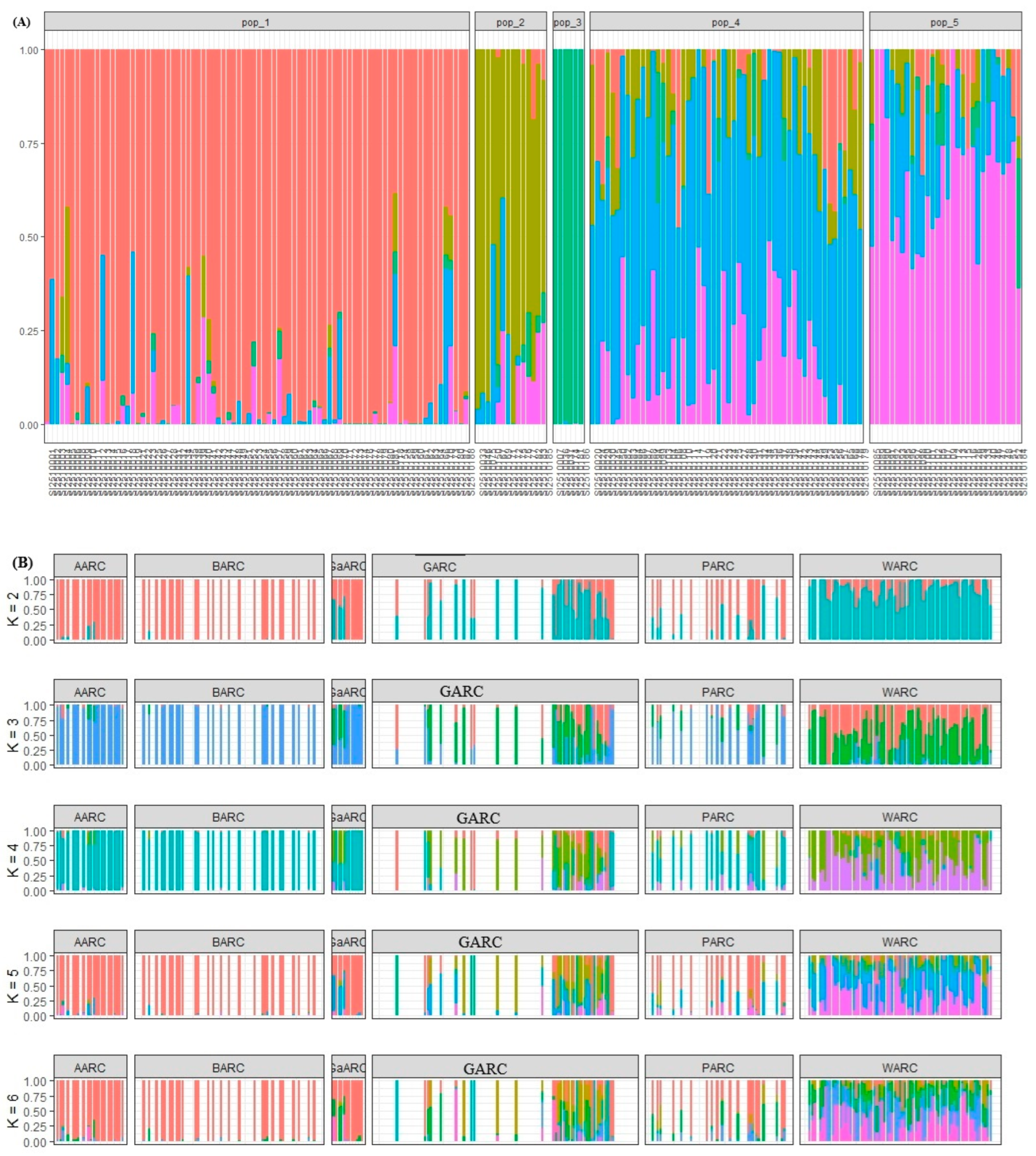 - Pritchard, J.K.; Stephens, M.; Donnelly, P. Inference of Population Structure Using Multilocus Genotype Data. Genetics 2000, 155, 945–959. [Google Scholar] [CrossRef]