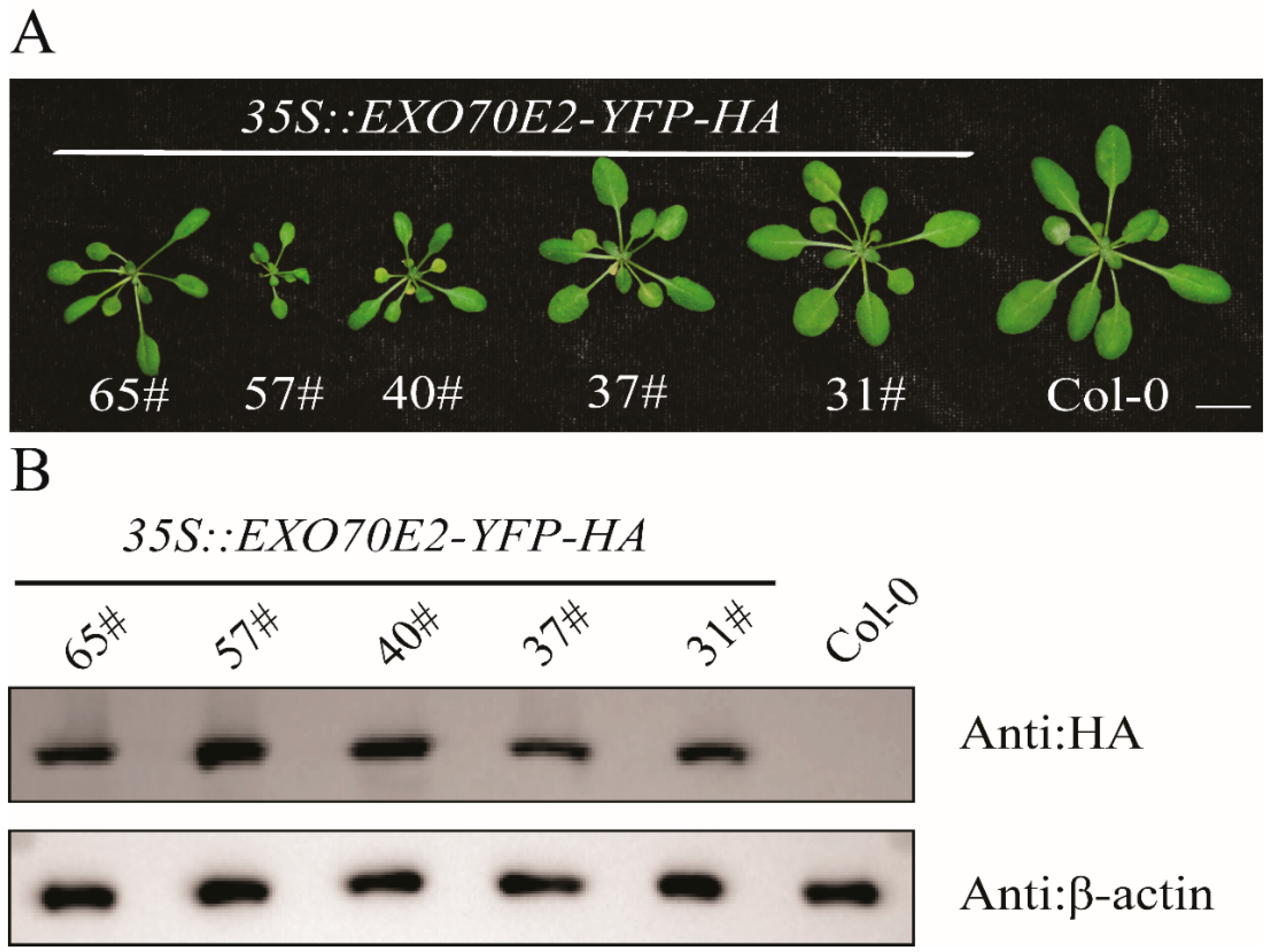 3.1. Constitutive Overexpression of EXO70E2 in Arabidopsis Results in Severe Developmental Abnormalities