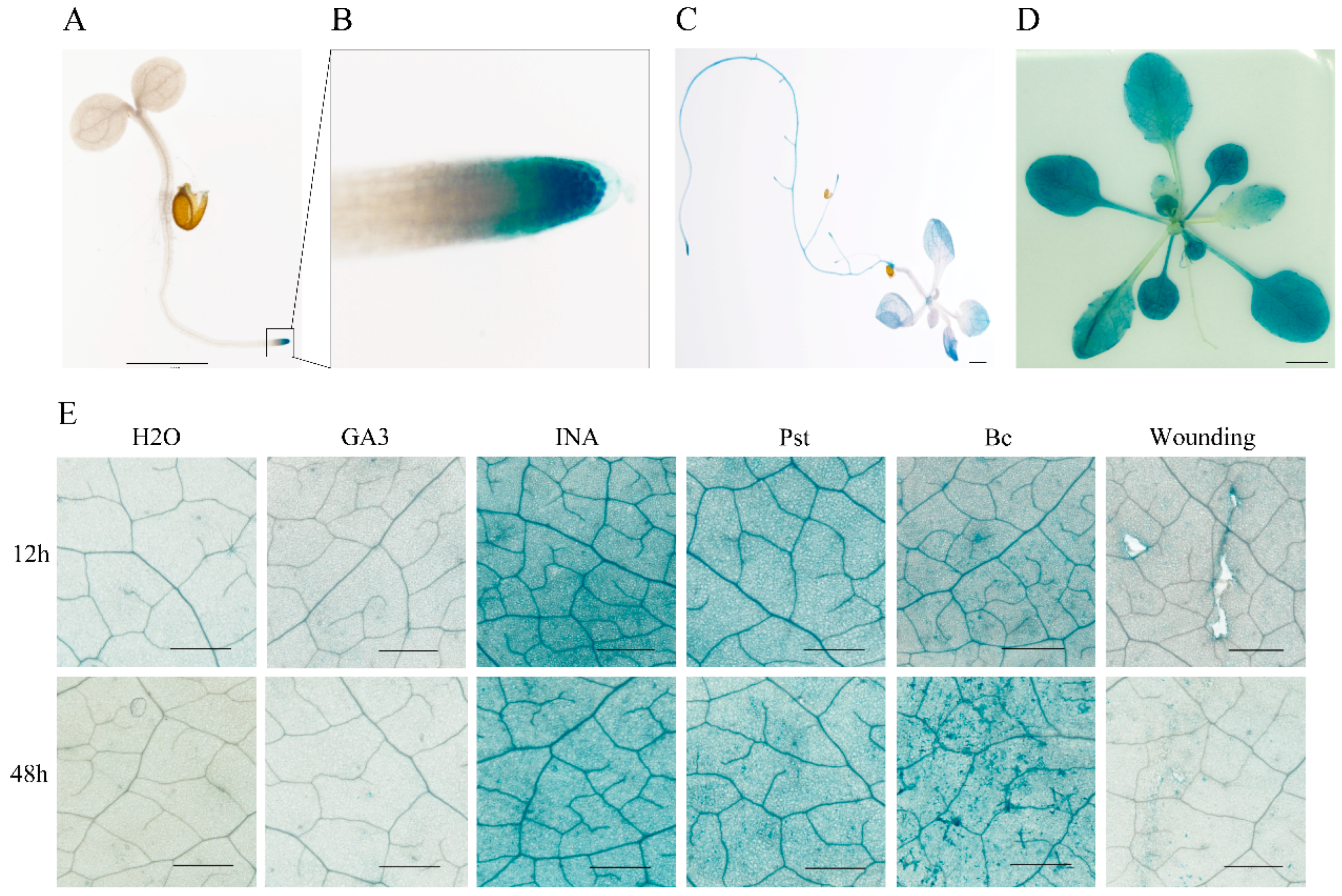 2.6. Histochemical GUS Staining and Stress Assays