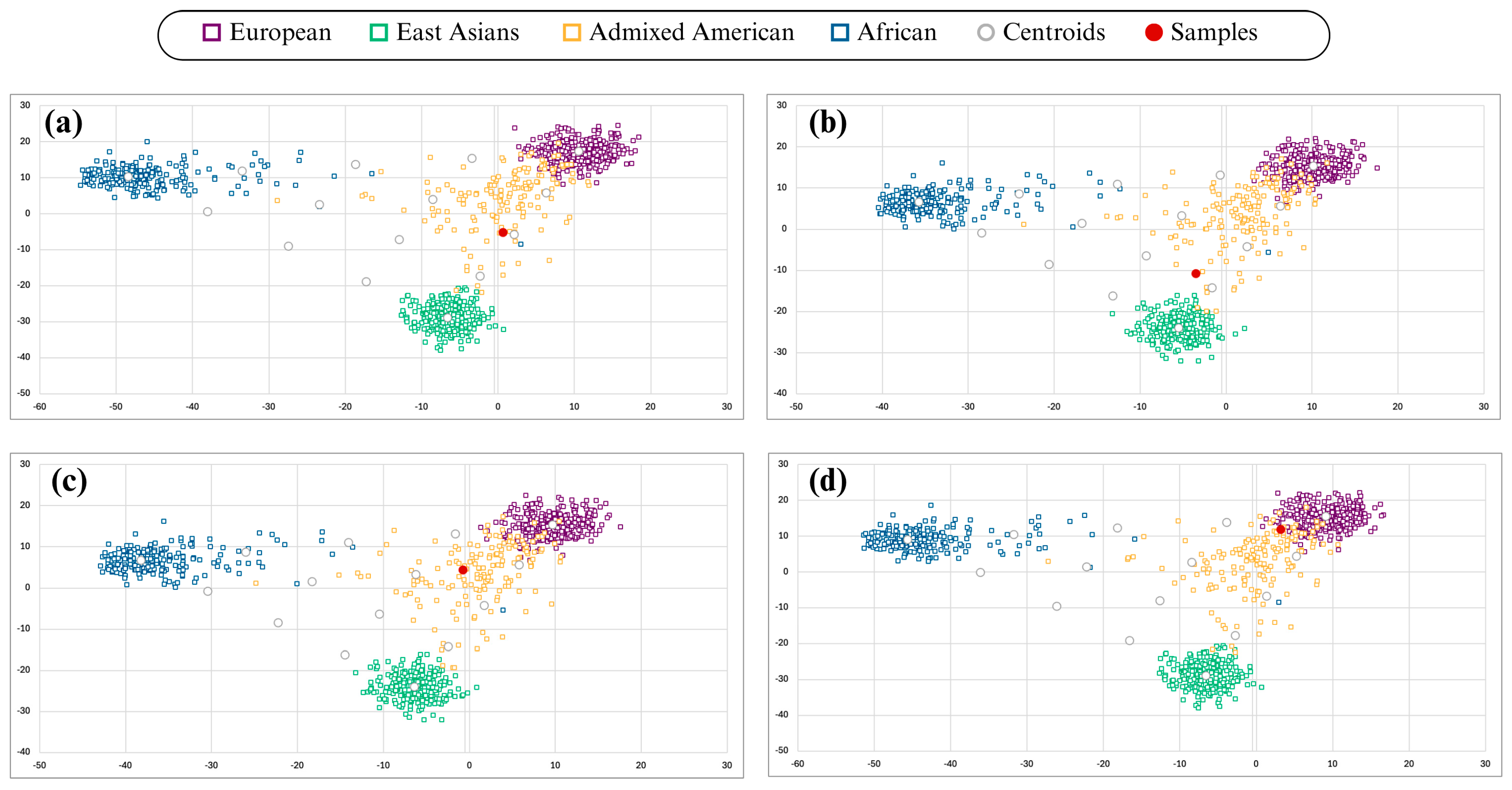 Figure 1): (a) centroid with predominantly American ancestry (admixed); (b) slightly inclined towards the East Asian population, probably showing higher Native American ancestry; (c) slightly inclined towards the European sample; and (d) highly inclined towards the European sample, showing individuals with high European ancestry. Interestingly, samples with the European pattern were the most frequent (46.3%), while the East Asian/Native American pattern was the least frequent (7.3%). Partial genotype recovery did not preclude ancestry inference in any sample, indicating that the aiSNP panel retains analytical stability even when full marker recovery is not achieved.