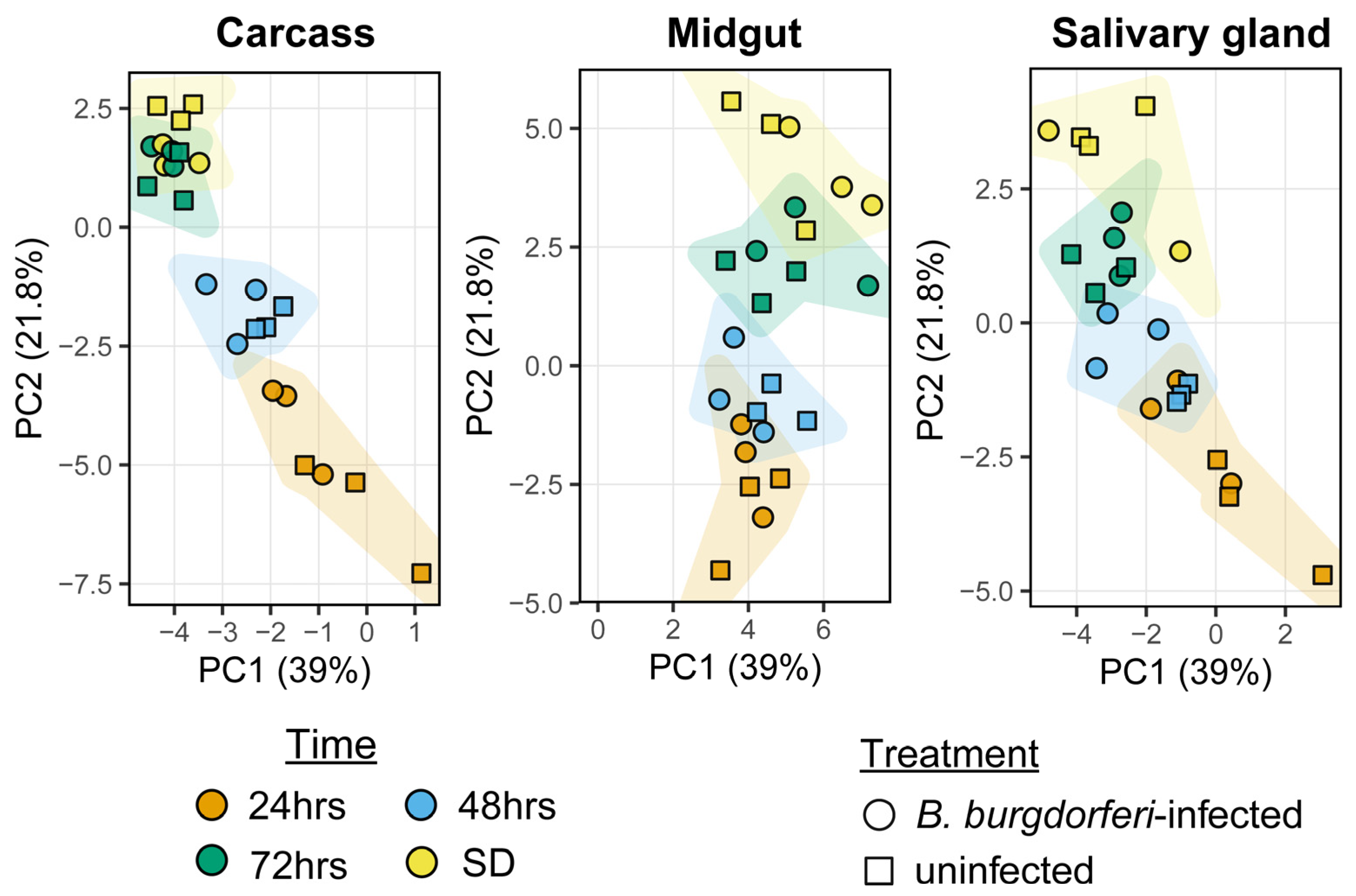 - Gaithuma, A.S.K.; Bencosme-Cuevas, E.; Kim, T.K.; Tirloni, L.; Brian, D.; Cai, J.; Skare, J.; Hyde, J.; Mulenga, A. Pan-transcriptome analysis of the black-legged tick (Ixodes scapularis) during Borrelia burgdorferi Transmission. Unpublished work. 2026. [Google Scholar]