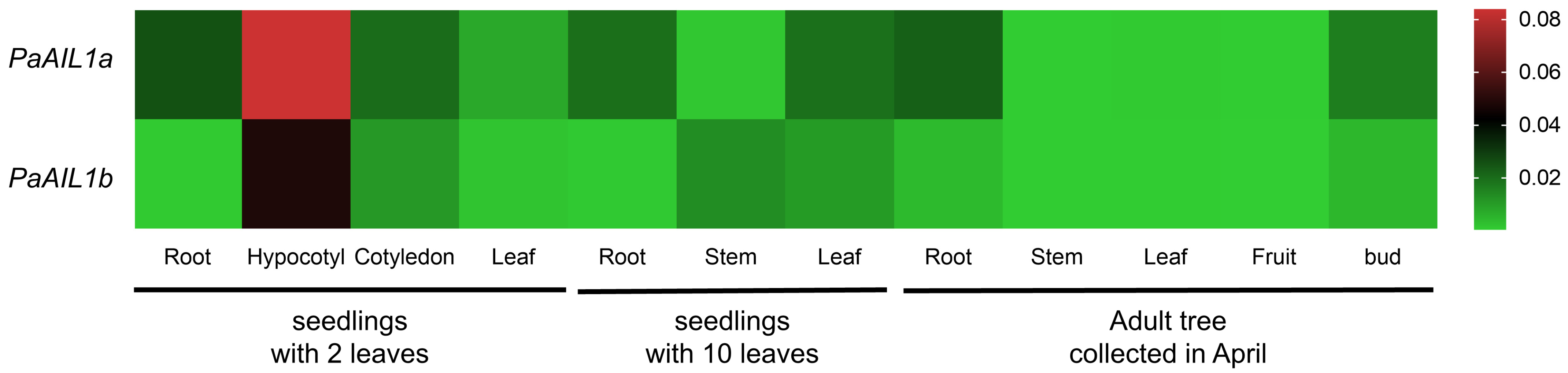 3.3. Spatiotemporal Expression Patterns of PaAIL1a/b in P. acerifolia