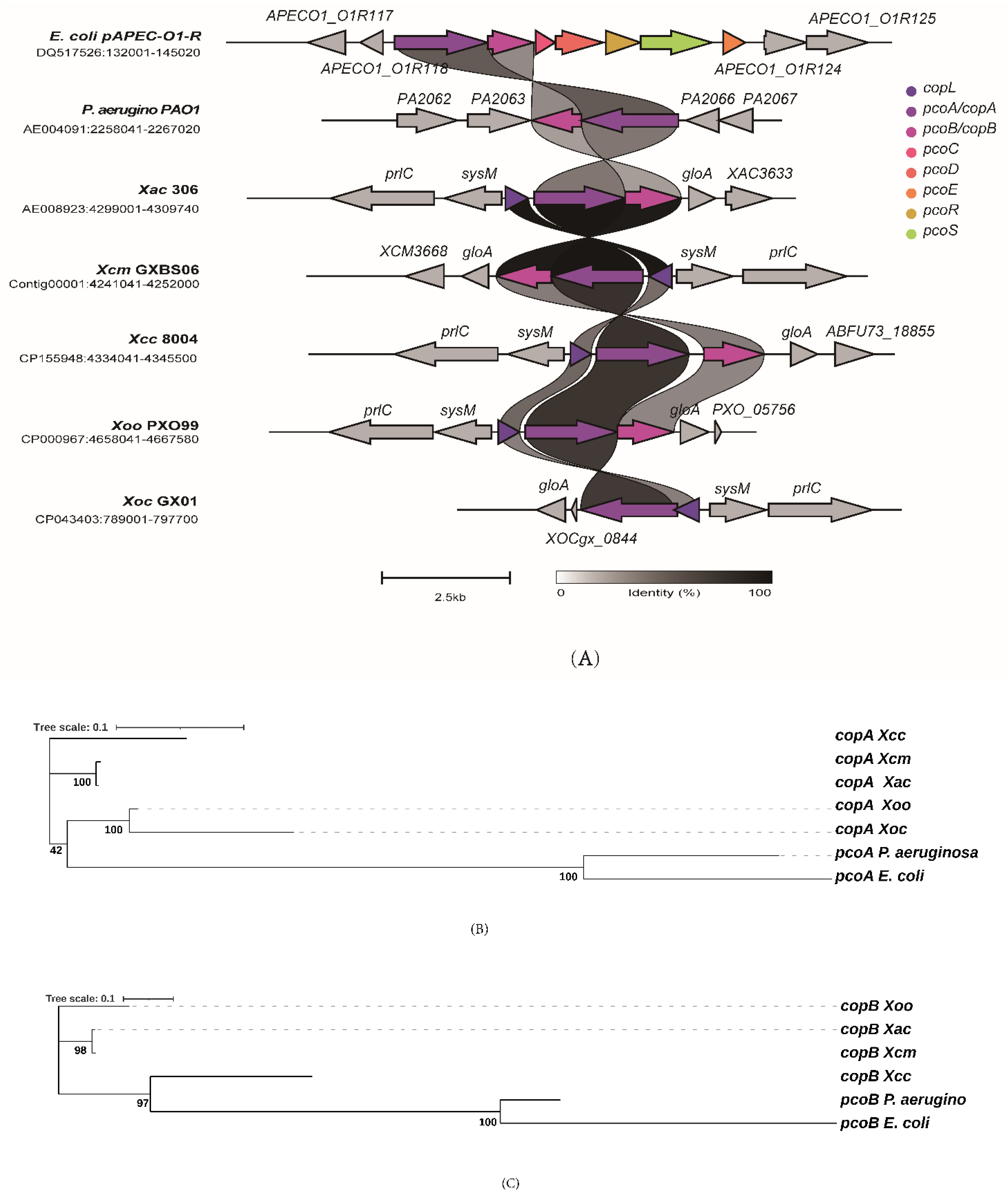 2.8. Identification and Evolutionary Analysis of Copper Resistance Genes in Xcm GXBS06