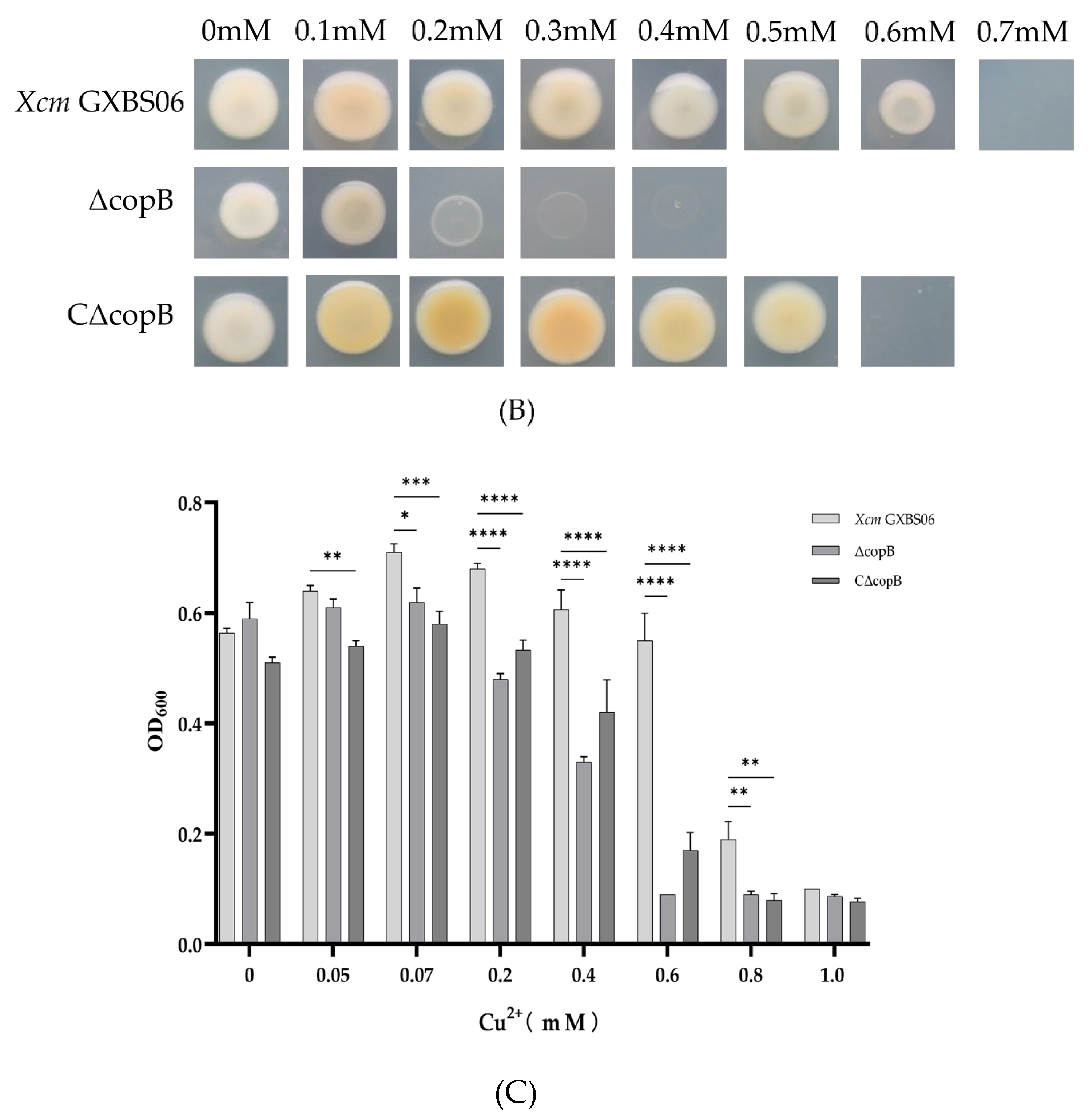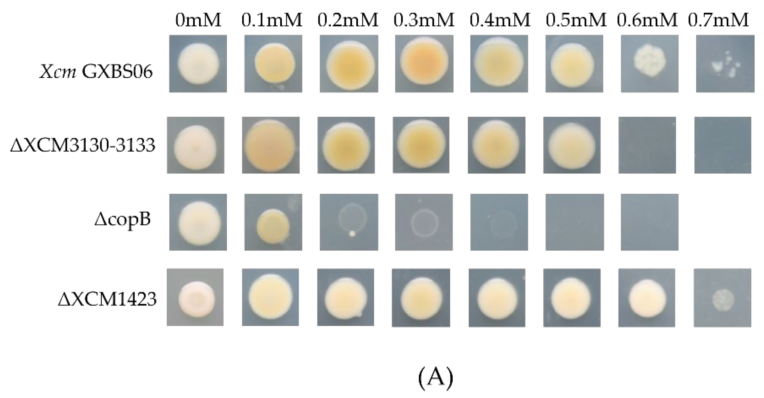 3.3. copB Is a Critical Copper Resistance Gene in Xcm GXBS06