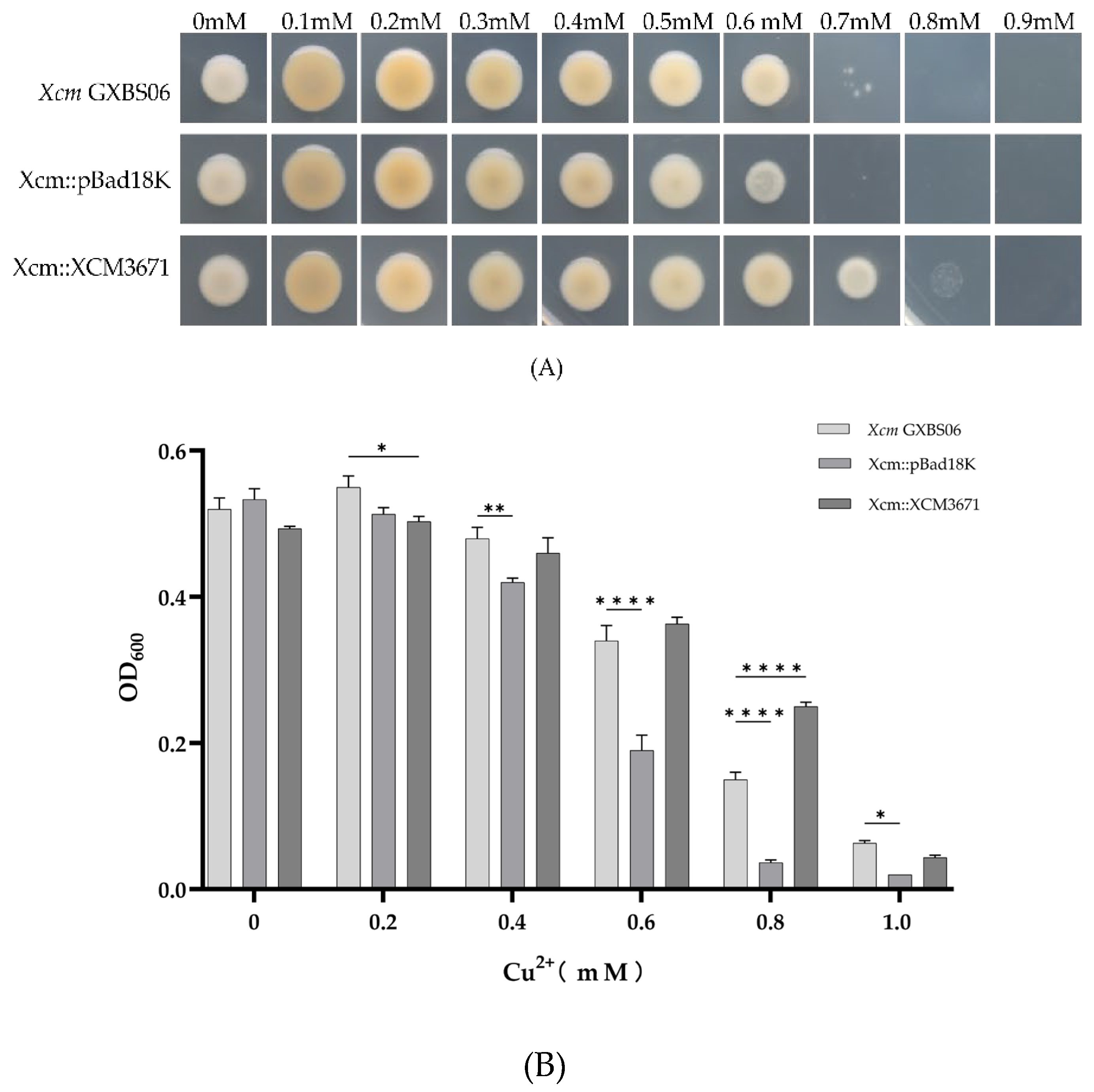 3.5. Overexpression of XCM3671 Significantly Enhances Copper Tolerance in Xcm and Xoc
