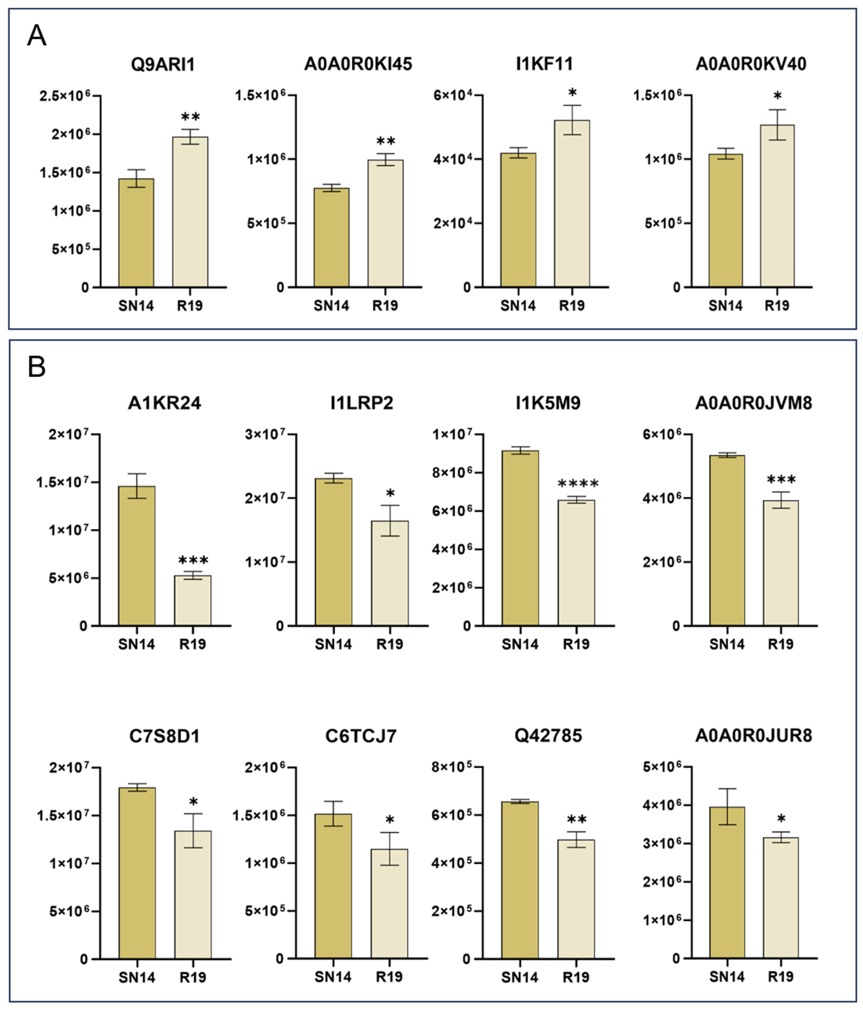 3.3. Proteomics Analysis of R19 and SN14