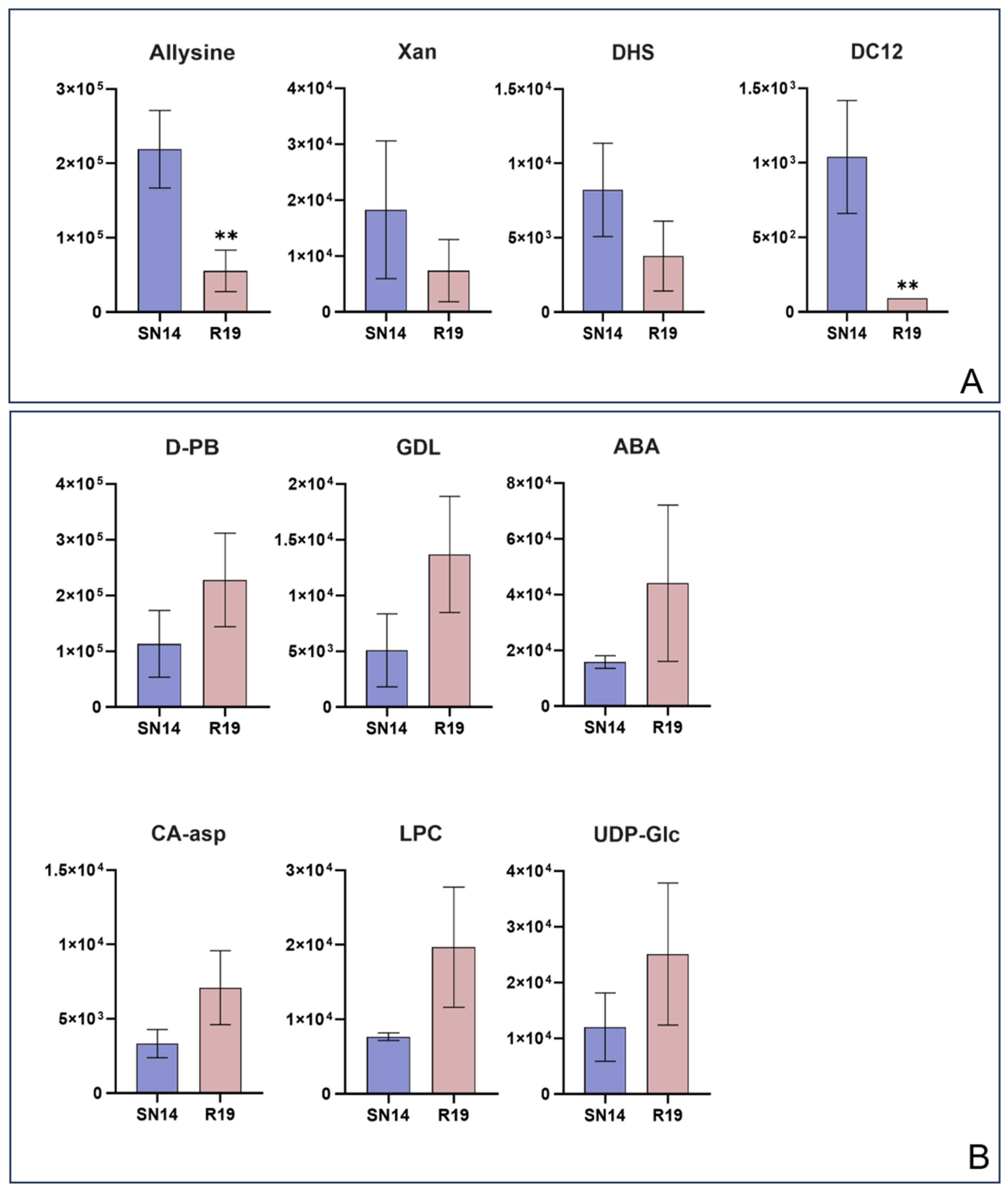 3.4. Metabolomics Analyses of R19 and SN14