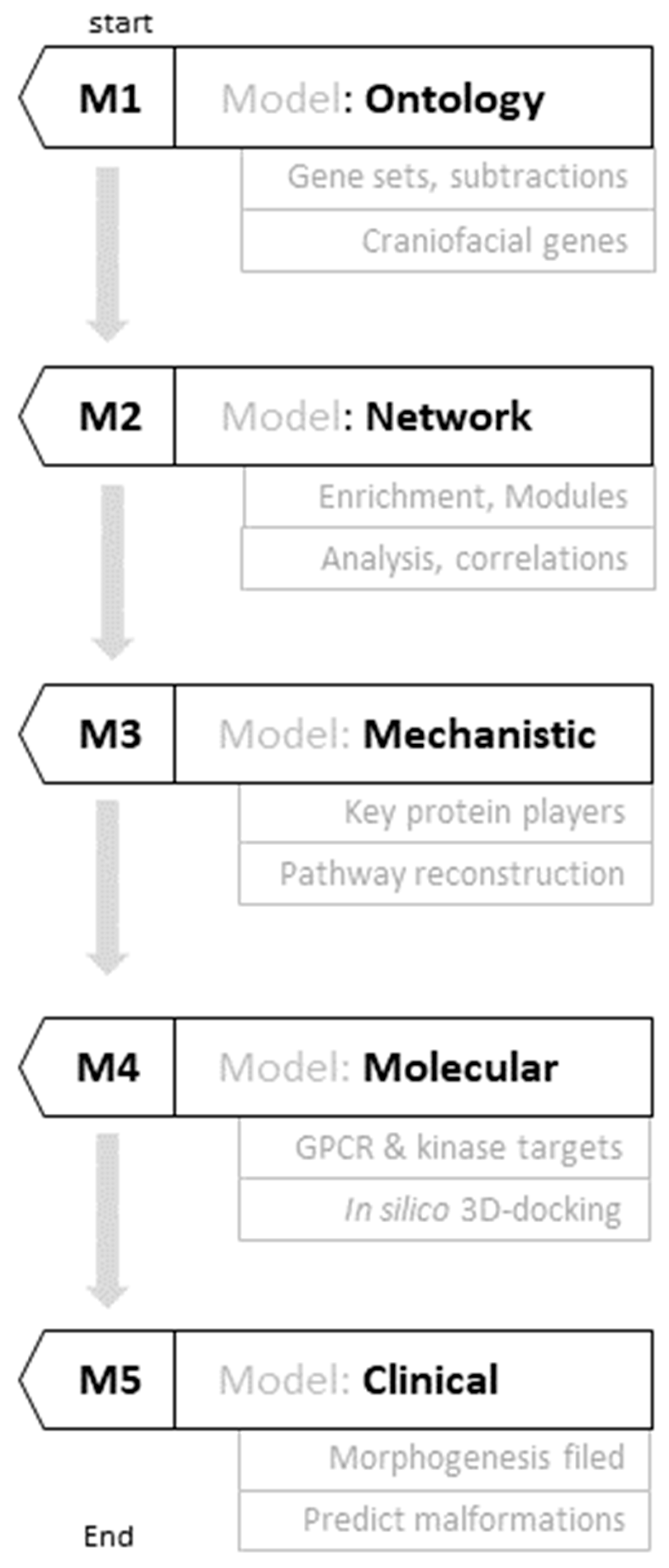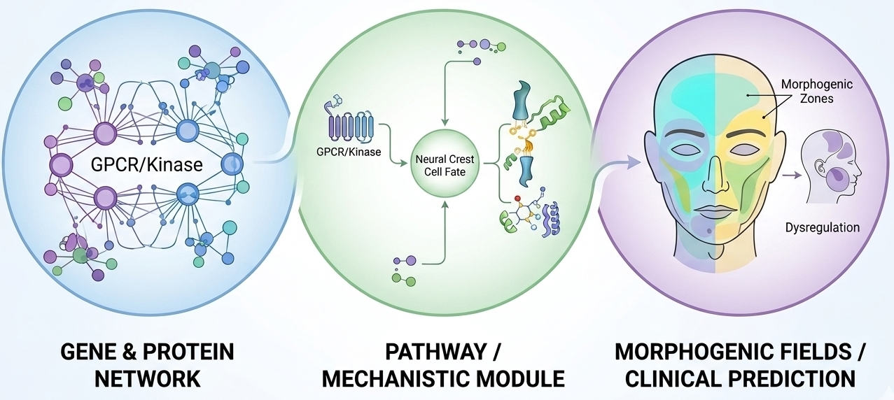 Five-tier computational workflow for predicting neural crest loss and craniofacial malformations through Sonic Hedgehog kinase module analysis. The workflow integrates five progressively refined modeling approaches: (M1) Ontology-based systematic curation of craniofacial development gene sets from UniProt and KEGG databases; (M2) Network enrichment analysis revealing convergent SHH and WNT signaling axes with GPCR and kinase hubs; (M3) Mechanistic pathway reconstruction mapping signal transduction cascades governing neural crest cell fate; (M4) Molecular characterization through in silico 3D docking of ligand–protein-binding affinities; and (M5) Clinical integration establishing computational biomarkers for craniofacial anomalies. This hierarchical framework enables systematic progression from genomic data through molecular mechanisms to phenotype prediction.
