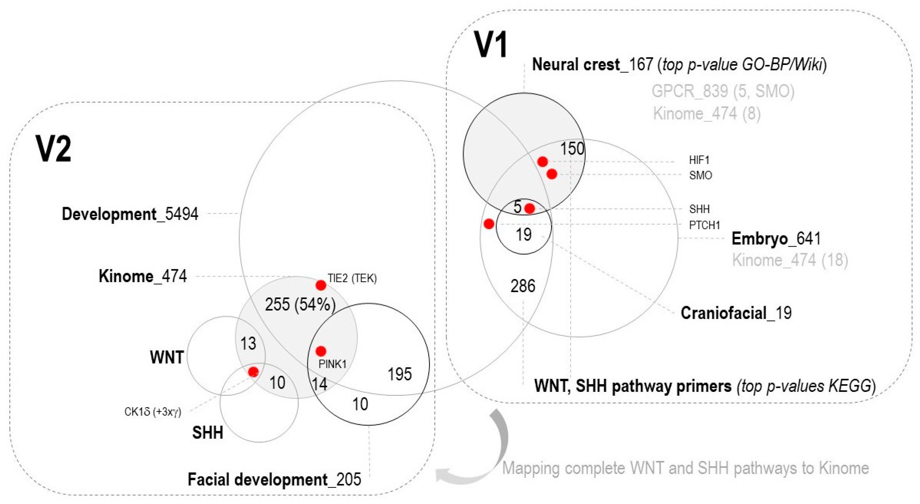 Two-step gene set integration strategy for identifying craniofacial development regulators. (V1) (Initial Pathway Primer Identification): Intersection analysis of neural crest genes (167 genes, GO-BP- and WikiPathways-validated), embryonic genes (641 genes), and craniofacial-specific genes (19 genes) identified HIF1A and SMO within the neural crest set and SHH within the craniofacial subset. KEGG functional enrichment established WNT and SHH pathways as critical primers. (V2) (Refined Kinome Integration): Integration of developmental genes (5494), facial development genes (205), and human kinome genes (474) with complete WNT/SHH pathway annotations revealed CK1δ (plus 3x CK1γ isoforms) at the intersection of developmental processes and kinase signaling. Analysis identified 255 genes (54% of kinome) shared between developmental and kinome datasets, with 14 genes overlapping WNT signaling and 10 genes overlapping SHH signaling, converging on 186 unique genes driving craniofacial phenotypes through integrated developmental and signaling mechanisms. Red dots indicate location of genes in the set.