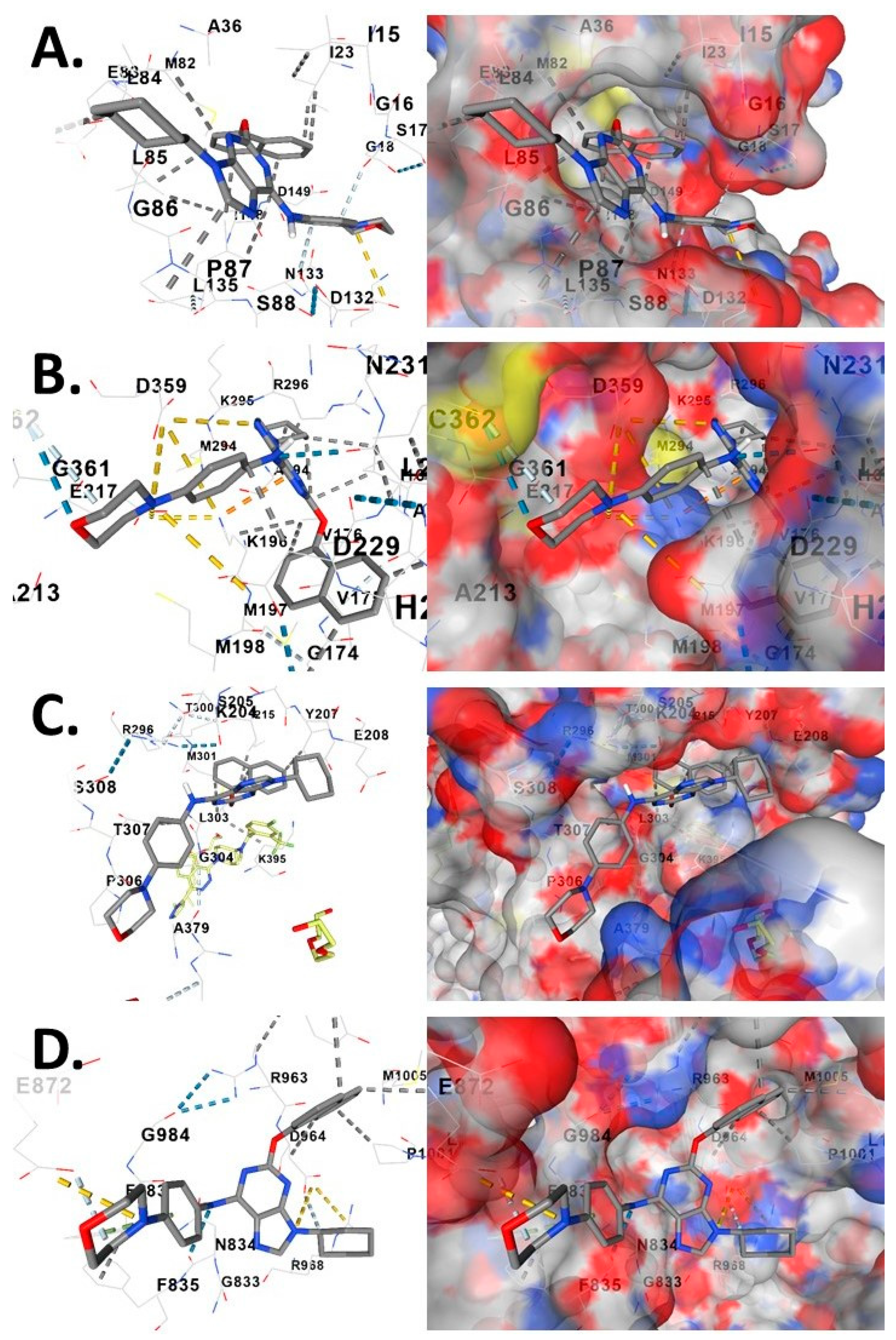 Molecular docking analysis of purmorphamine reveals distinct binding modes and target selectivity across pathway kinases and the SMO receptor. Computational docking of purmorphamine (PubChem CID: 5284329), an SHH pathway agonist, into CK1δ, PINK1, SMO, and control kinase TIE2/TEK reveals target-specific binding modes and differential pocket geometries. Each panel displays stick representation (left, atomic interactions) and electrostatic surface (right, colored by potential), providing structural rationale for purmorphamine’s polypharmacology. (A) (CK1δ, PDB: 3UYS): Purmorphamine adopts a compact conformation in the ATP-binding pocket, with morpholine ring oriented toward the hinge region (Gly86, Pro87, Ser88). Hydrogen bonds form with Gly86 backbone and Asp132 side chain. Hydrophobic contacts with Leu85, Met82, Ile23. The deep, compact cavity yields favorable predicted binding energy (low Vina score), suggesting competitive ATP-site inhibition of CK1δ-mediated phosphorylation of HIF1A and SMO. (B) (PINK1, PDB: 5OAT): Curved conformation maximizes contacts with the narrow active site. Multiple hydrogen bonds with hinge region (Gly174, Met197, Met198) and catalytic loop (Asp229, Asn231). Morpholine extends into hydrophobic subpocket (Met294, Lys295, Cys362). Tightly constricted geometry yields low Vina score (high-affinity), suggesting purmorphamine may modulate PINK1 activity, partially compensating for HEY1-mediated transcriptional repression. Residue numbering corresponds to Tribolium castaneum PINK1 (PDB 5OAT) and structurally equivalent human PINK1 residues: Gly174 (T. castaneum, red flour beetle, UniProt ID:D6WMX): This aligns with the first glycine in the GKG motif (glycine-rich loop) of the human sequence (UniProt ID:Q9BXM7). In the alignment, the beetle …GKPI AKGTNG aligns with human …GQSIG KGC…, placing beetle G174 opposite human G193; Met197 and Met198 (Beetle): These two consecutive methionines in beetle (MM) correspond to the two methionines in human (MM) at positions M216 and M217 within the conserved ALKMMWN motif; Asp229 and Asn231 (Beetle): These residues are located in the activation segment. Beetle YSNHDL aligns with human YAGEYG, placing beetle D229 opposite human D248 and beetle N231 opposite human N250; Met294 and Lys295 (Beetle): These are in the highly conserved HRDLK motif of the kinase domain. Beetle HRDLK aligns perfectly with human HRDLK, mapping beetle M294 and K295 to human M314 and K315; and Cys362 (Beetle): This residue is in the DFG motif region. Beetle DFGCCL aligns with human DFGCCL, mapping beetle C362 to human C387. (C) (SMO, PDB: 4JKV): Extended conformation in the transmembrane heptahelical bundle allows morpholine and aromatic rings to engage different subpockets. Hydrogen bonds with Tyr207, Glu208, Ser308. Hydrophobic contacts with Met301, Leu303, Pro306, Ala379. Larger, more open cavity yields higher Vina score (moderate affinity), consistent with purmorphamine’s SMO agonist role, stabilizing active receptor conformation. (D) (TIE2/TEK, PDB: 1FVR, Control): Partially extended conformation with hydrogen bonds to hinge region (Asp964, Gly984). Relatively open geometry yields higher Vina score (weaker affinity), suggesting reduced off-target kinase inhibition. TIE2 serves as non-embryonic control, demonstrating purmorphamine’s preferential binding to developmental kinases (CK1δ, PINK1) over non-developmental targets.