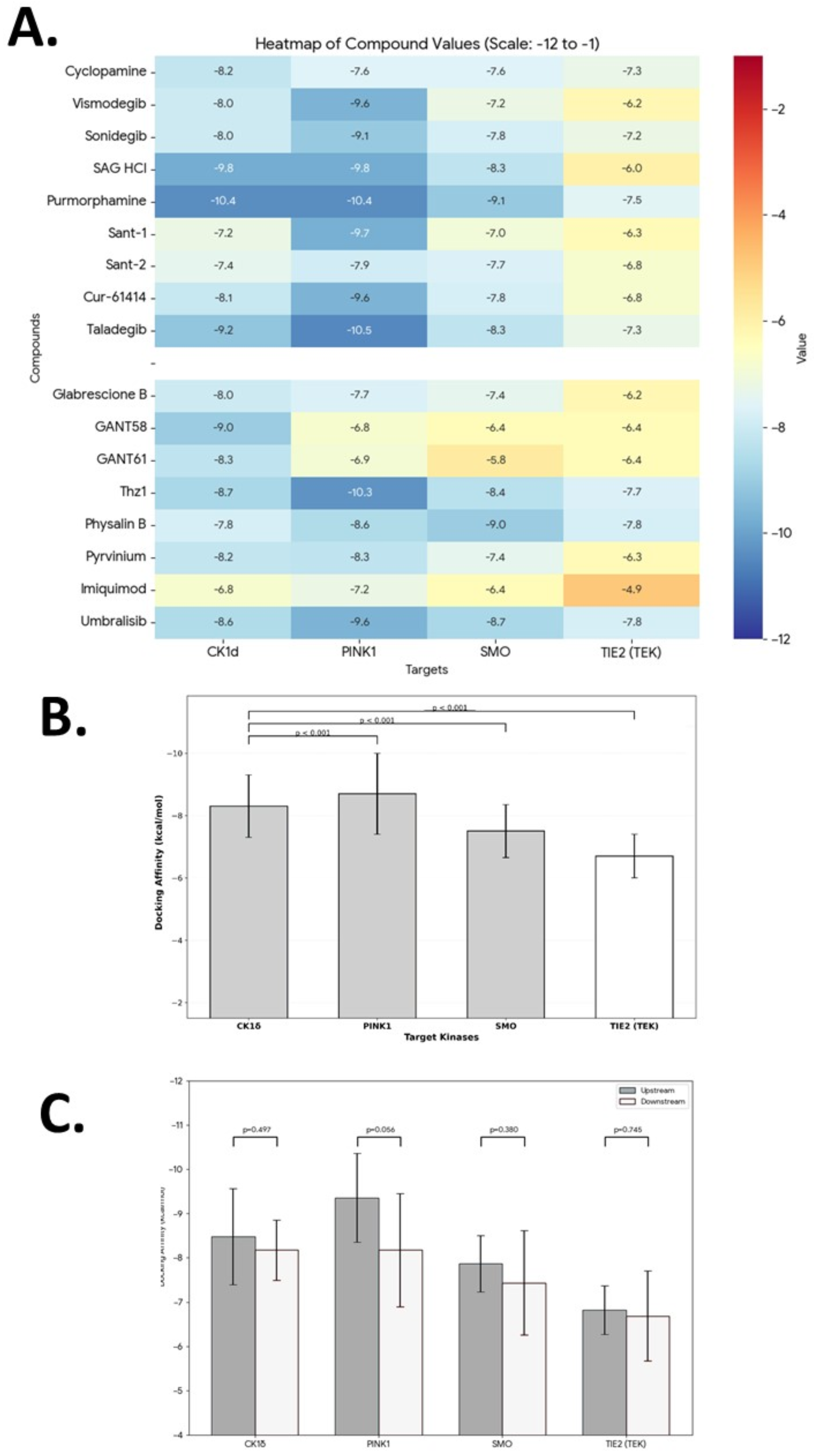 Systematic multi-target-binding affinity profiling reveals preferential engagement of developmental pathway kinases by SMO modulators and identifies embryonic-stage kinase selectivity patterns. Comprehensive molecular docking of 17 compounds against CK1δ, PINK1, SMO, and TIE2/TEK reveals systematic preferential binding to embryonic kinases over non-developmental control, supporting the integrated CK1δ-HIF1A-HEY1-PINK1 axis and rationalizing therapeutic dual kinase–GPCR modulation strategies. (A) (Heatmap): Color-coded binding affinity matrix (red = −1 kcal/mol weaker, blue = −12 kcal/mol stronger) for 17 compounds × 4 targets. Compounds organized into SMO-targeting (n = 9: cyclopamine, vismodegib, sonidegib, SAG HCl, purmorphamine, SANT-1, SANT-2, Cur-61414, taladegib) and downstream modulators (n = 8: glabrescione B, GANT58, GANT61, Thz1, physalin B, pyrvinium, imiquimod, umbralisib). Both classes show stronger binding to CK1δ (mean: −8.34 kcal/mol, range: −6.8 to −10.4) and PINK1 (mean: −8.80 kcal/mol, range: −6.8 to −10.5) versus TIE2 (mean: −6.76 kcal/mol, range: −4.3 to −7.8). Purmorphamine exhibits strongest CK1δ and PINK1 binding (−10.4 each), with moderately strong SMO binding (−9.1), positioning it as a lead polypharmacological scaffold. (B) (Mean Affinity Comparison): Target-centric analysis of all 17 compounds shows PINK1 exhibits the strongest mean affinity (−8.80 ± 1.15 kcal/mol), followed by CK1δ (−8.34 ± 0.86 kcal/mol), SMO (−7.50 ± 0.97 kcal/mol), and TIE2 (−6.76 ± 1.02 kcal/mol). All pairwise comparisons between developmental kinases and the TIE2 control reach statistical significance (p < 0.001, paired t-tests with Bonferroni correction), confirming the affinity ranking CK1δ ≈ PINK1 > SMO > TIE2 across the full compound panel. Even compounds designed to target SMO exhibit stronger mean affinity for the embryonic kinases than for their primary target, indicating that ATP-binding pockets of CK1δ and PINK1 present more thermodynamically favorable environments for these scaffolds than the SMO transmembrane cavity. (C) (Stratified Analysis): Both upstream SMO-targeting compounds (gray hatched bars; n = 9) and downstream non-SMO modulators (white bars; n = 8) maintain preferential binding to developmental kinases over the TIE2 control. Between-class comparisons (upstream vs. downstream) for each individual target are all non-significant (ns): CK1δ, p = 0.497; PINK1, p = 0.056; SMO, p = 0.380; TIE2, p = 0.748, indicating that the two compound classes do not differ significantly in their absolute affinity for any target. In contrast, within-class comparisons against TIE2 remain highly significant for both classes: for upstream SMO-targeting compounds, CK1δ vs. TIE2: −1.71 kcal/mol (p = 6.62 × 10−7) and PINK1 vs. TIE2: −2.55 kcal/mol (p = 3.05 × 10−8); for downstream modulators, CK1δ vs. TIE2: −1.43 kcal/mol (p = 3.62 × 10−6) and PINK1 vs. TIE2: −1.46 kcal/mol (p = 1.51 × 10−6). This pattern indicates that the selectivity for early-embryonic kinases over the non-developmental control is intrinsic to SHH pathway scaffolds as a class, rather than being specific to either upstream or downstream compound subgroups.