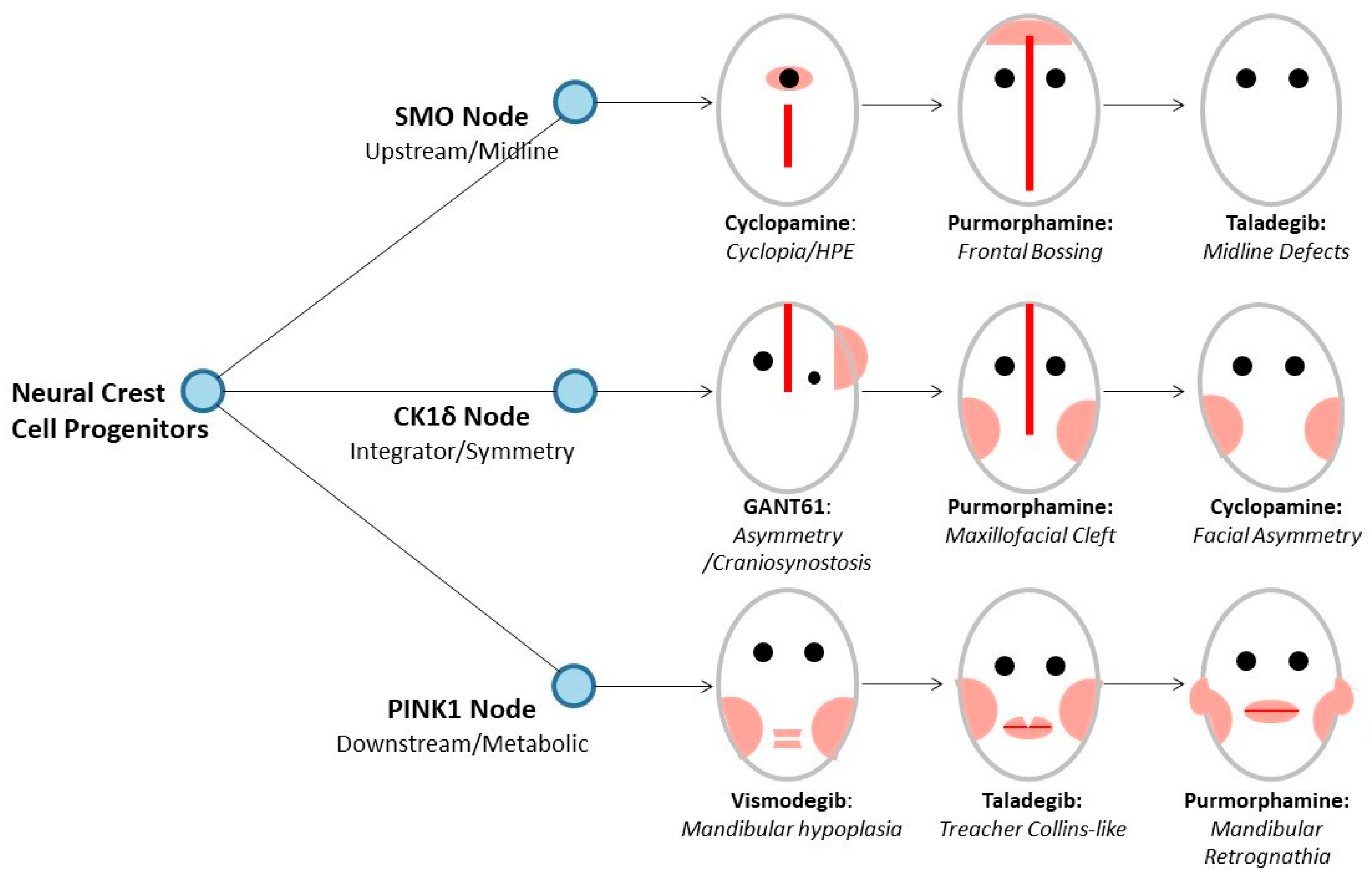 Integrated developmental perturbation model: multi-node molecular targeting by pharmacological compounds and associated anatomically specific craniofacial malformation phenotypes. The figure presents a unified mechanism-based framework linking three critical signaling nodes, SMO (upstream morphogen transducer), CK1δ (symmetry integrator), and PINK1 (mitochondrial quality control regulator), to nine distinct craniofacial malformation phenotypes arising from perturbation of neural crest cell progenitor populations. Each schematic face depicts a stylized anterior view in which pink/red shading indicates anatomical regions that are hypoplastic, fused, asymmetrically underdeveloped, or structurally absent as a consequence of the indicated compound. Vertical red bars on the facial midline denote abnormal fusion or failure of midline separation. The developmental decision tree illustrates how the same compounds produce different phenotypes depending on the node they preferentially perturb and how multi-node compounds (purmorphamine, cyclopamine, taladegib) produce combinatorial phenotypes. Anatomical legend for red/pink shading regions: The pink shading in each facial schematic represents the following affected anatomical territories: the frontonasal region (forehead, glabella, nasal bridge) and periorbital region (orbital rims, upper and lower eyelid margins) when affected in midline or gain-of-function phenotypes; the malar/zygomatic region (cheekbones and zygomatic arches) and auricular region (external ear and periauricular soft tissue) when bilateral hypoplasia is shown; and the mandibular/lower facial region (mandibular body, ramus, condyle, and chin prominence) and maxillary region (upper jaw and palate) in lower-face phenotypes. The midline vertical red bar represents failed or abnormal separation of bilateral facial primordia. SMO Node (Upstream/Midline Patterning): (1) Cyclopamine (SMO antagonist): Cyclopia/Holoprosencephaly (HPE). The facial schematic depicts a single, centrally fused eye with a prominent vertical midline bar. The pink shading covers the entire nasal dorsum and midface, indicating complete absence of the nasal septum, piriform aperture, and interorbital septum. Anatomically, cyclopamine-induced HPE results from failure of the embryonic prosencephalon to divide into bilateral cerebral hemispheres, with corresponding failure of the single eye field to resolve into two separate orbital cavities. Affected regions include the ethmoid (absent crista galli and cribriform plate), the interorbital septum, and the premaxillary/vomeronasal complex; the nasal bones and the alae are absent or vestigial, replaced by a proboscis-like appendage above the single orbit. The midline facial skeleton is therefore completely absent, with absence of the philtrum, median lip, and premaxillary bones. (2) Purmorphamine (SMO agonist): Frontal Bossing/Hypertelorism. The facial schematic shows bilateral eyes with increased inter-orbital spacing and pink shading over the supraorbital ridges and forehead. Anatomically, SMO hyperactivation by purmorphamine drives excessive proliferation of frontonasal mesenchyme, causing overgrowth of the frontal bone (frontal bossing), widening of the interorbital distance (hypertelorism due to excessive expansion of the ethmoid and interorbital plate), and broadening of the nasal bridge. The coronal suture and metopic suture regions are affected by premature or disproportionate bone formation. The supraorbital rims, glabella, and frontal squama are the primary sites of osseous excess. (3) Taladegib (SMO antagonist): Midline Defects/Microform HPE. The facial schematic shows bilateral eyes without midline fusion but with a prominent vertical midline bar and pink shading limited to the nasal bridge and philtrum region, representing intermediate-severity midline disruption short of cyclopia. Anatomically, this corresponds to the HPE microform spectrum: median cleft lip, single central maxillary incisor, hypotelorism (reduced interorbital distance with narrowing of the ethmoid), midface hypoplasia of the premaxilla and vomer, and hypoplastic nasal bones with a flat or absent nasal bridge. The primary nasal septum and columella are underdeveloped; orbital hypotelorism reflects incomplete lateral displacement of the orbits from a persistent midline position. CK1δ Node (integrator/symmetry control): (1) GANT61 (GLI1/2 inhibitor): Asymmetry/Craniosynostosis. The facial schematic depicts asymmetric eye positions with pink unilateral shading over one cheek and parietal region and a vertical midline bar. Anatomically, CK1δ–GLI axis disruption impairs the bilateral symmetry program in neural crest cell populations, resulting in unilateral or asymmetric craniosynostosis—premature fusion of cranial sutures (most characteristically the coronal and lambdoid sutures on one side)—producing plagiocephaly with tilted skull base, asymmetric orbital positioning, and unilateral malar/zygomatic hypoplasia. The affected hemiface shows underdevelopment of the zygomatic body and arch, the lateral orbital wall (frontal process of the zygoma), and the maxillary tuberosity on the ipsilateral side, while the contralateral hemiface is relatively preserved. (2) Purmorphamine (SMO/CK1δ agonist): Maxillofacial Cleft. The facial schematic shows bilateral eye positions and prominent vertical midline bar with bilateral pink shading over both cheeks and jaw. Anatomically, bilateral maxillofacial clefting arises from failure of the maxillary and medial nasal prominences to merge correctly during primary palate formation (Carnegie stage 16–18), resulting in bilateral cleft lip extending through the primary palate (premaxillary segment), and potentially involving the secondary palate (hard palate posterior to the incisive foramen). The affected structures include the maxillary alveolar ridges bilaterally, the philtrum and columella, the nasal alae and nasal floor, and the palatine processes of