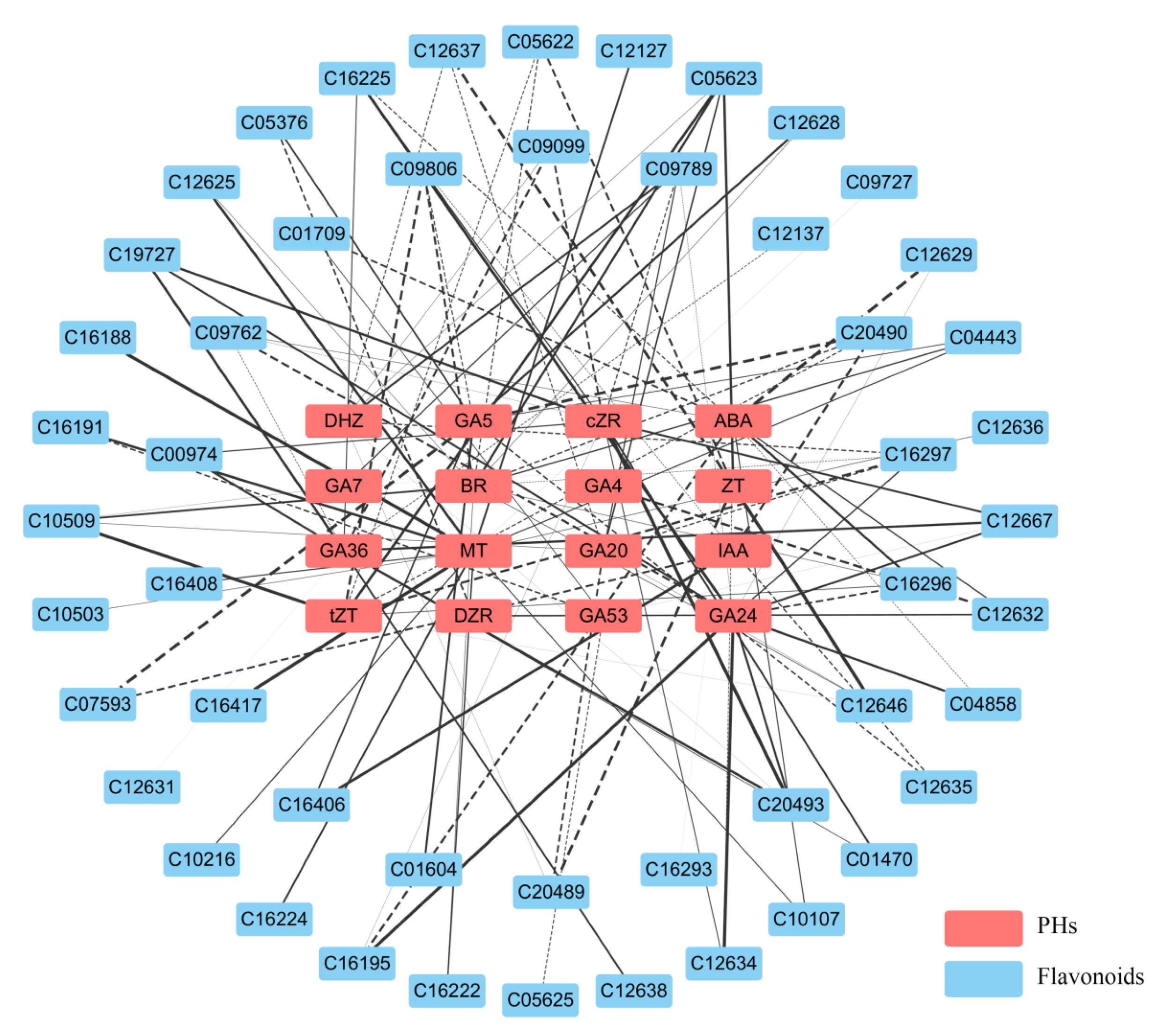 3.1.4. Correlation Analysis Between Differential Phytohormones and Flavonoid Metabolites