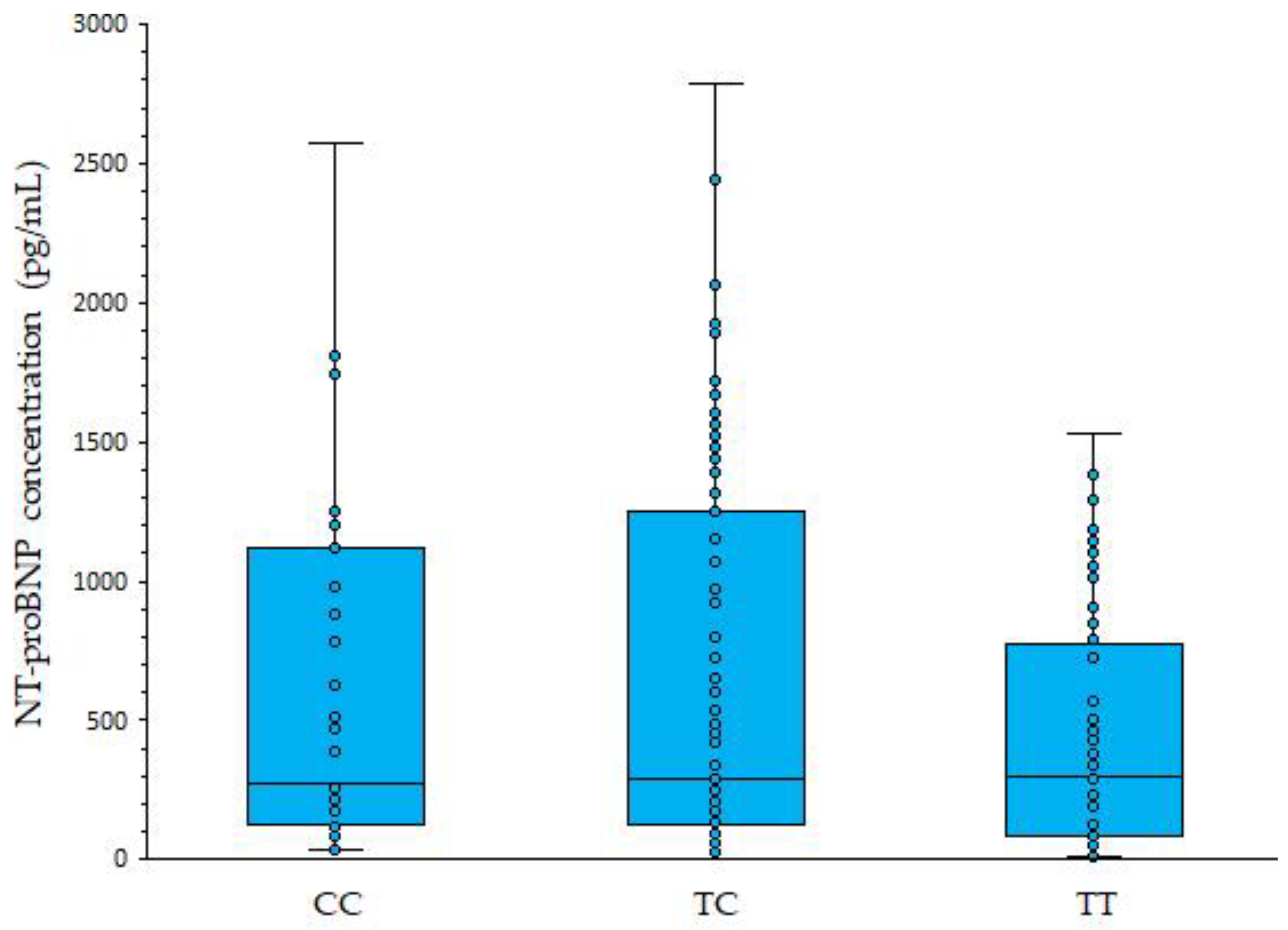 The present study has not demonstrated any crucial relationship between NPPB:rs198389 genotypes and phenotypic features of HF patients. In addition, within the HF group, there were no significant associations between the NPPB:rs198389 genotypes or alleles and the other analyzed variables except for height. There were no significant differences in the distribution of NPPB:rs198389 genotypes or alleles across NT-proBNP concentrations. Similar results were reported by Ichiki et al. [19]. In a study of 1146 patients from Minnesota, USA, the NPPB:rs198389 minor allele was not associated with any BP, metabolic, renal, or echocardiographic parameters in either sex [19]. Moreover, Johansson et al. did not associate NPPB:rs198389 genotypes with any tested phenotypic traits, including lipid profile, BP, or glycemia [20]. However, Meirhaeghe et al. found that the NPPB:rs198389 C allele was associated with higher BNP promoter activity and, consequently, higher BNP plasma concentrations [21]. Similar results were reported by Cannone et al. [12], although Cannone et al. investigated subjects at risk for HF from the STOP-HF study. They genotyped patients for the rs198389 polymorphism, assessed BNP levels, and determined clinical phenotypes. According to this study, HF patients carrying the rs198389 C allele had higher BNP levels [12]. Furthermore, they conducted a 5-year follow-up in which subjects without the considered rs198389 C allele had lower BNP concentrations, which was associated with higher cardiovascular risk. This suggests that higher circulating BNP levels may be associated with better cardiovascular outcomes in the long term. Compared to our study, they focused their results especially on the population at risk for HF, as well as on subjects with documented higher levels of BNP for an extended period of time [12].