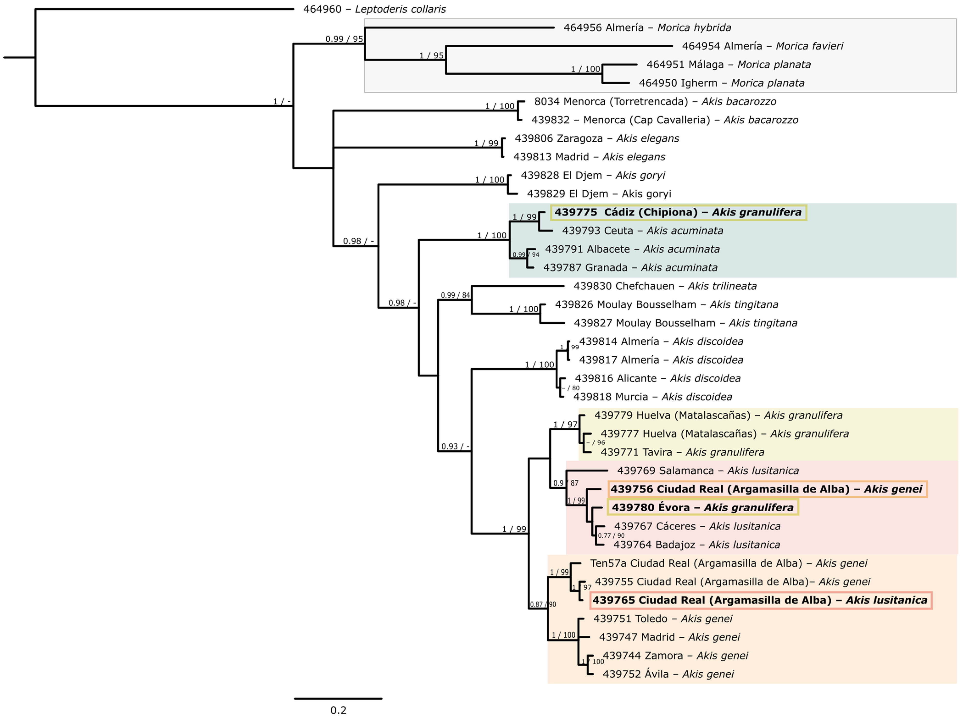| MNCN_Ent 439781 | Akis granulifera (mtDNA A. lusitanica) | Portugal: Alto Alentejo: São Pedro de Corval, Monsaraz | PZ044927 | |