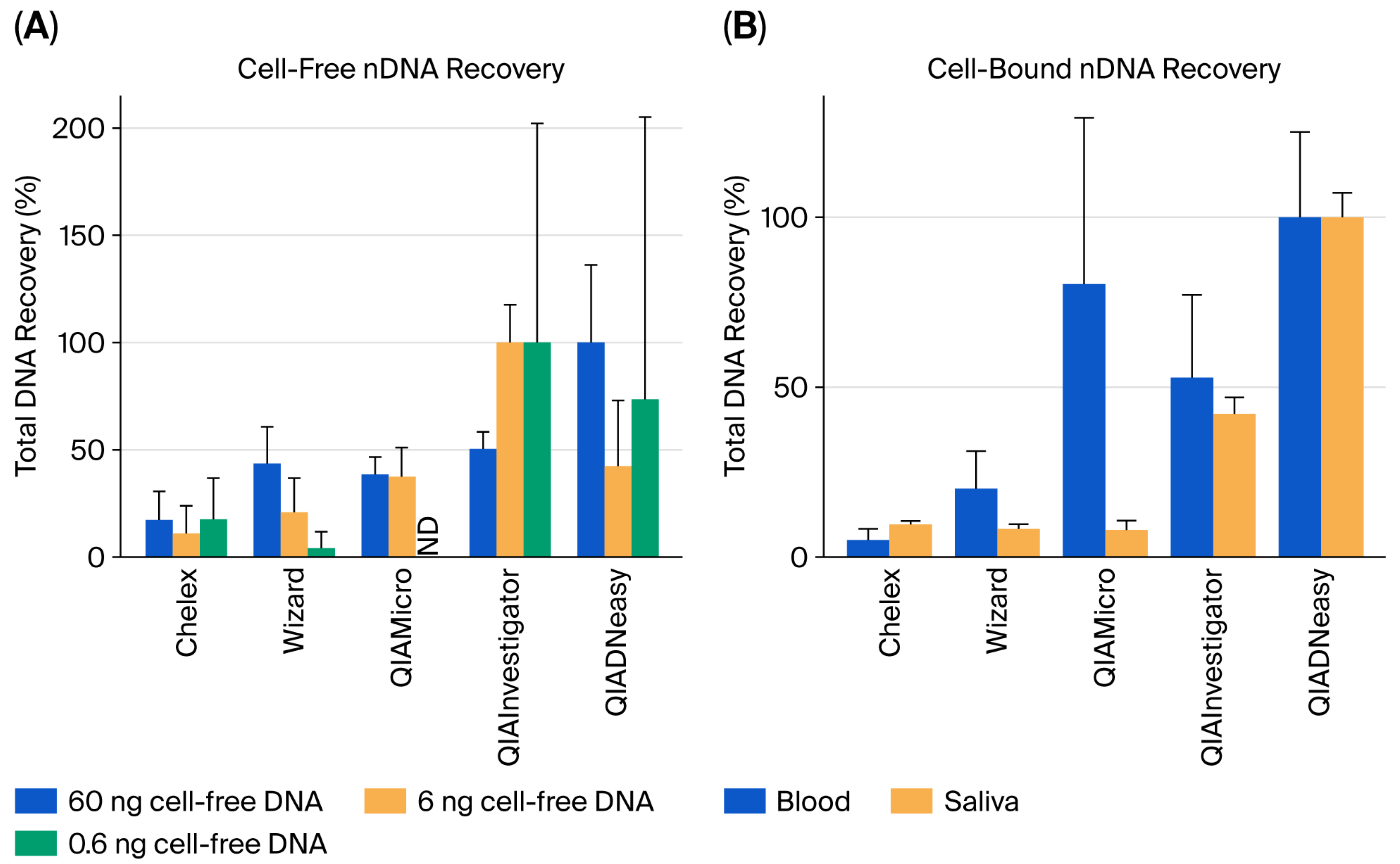 Figure 1. Recovery of nDNA using different extraction kits. (A) Cell-free nDNA in three different deposition amounts is shown as percent recovery (in relation to the best-performing kit for each deposited DNA amount). (B) Cell-bound nDNA in blood and saliva is shown as percent recovery (in relation to the best-performing kit for the two sample types). Error bars represent normalised standard deviation (SD %), calculated as SD % = (mean % × CV %)/100, for comparison of variation. ND—not determined. The lowest deposition amount, 0.06 ng DNA, was not analysed for the QIAMicro kit.