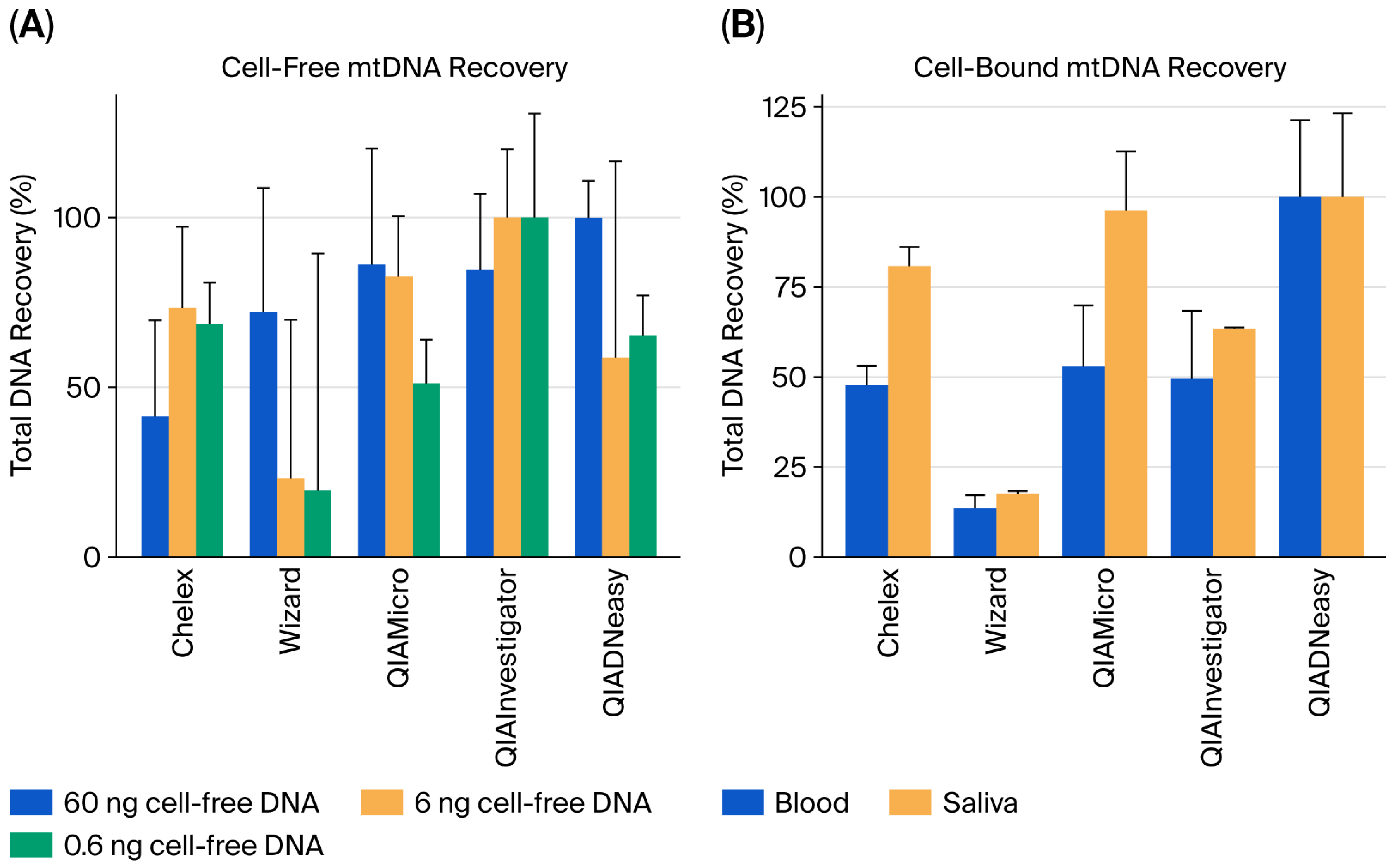 Figure 2. Recovery of mtDNA using different extraction kits. (A) Cell-free mtDNA in three different deposition amounts is shown as percent recovery (in relation to the best-performing method for each deposited DNA amount). (B) Cell-bound mtDNA in blood and saliva is shown as percent recovery (in relation to the best-performing method for the two sample types). Error bars represent normalised standard deviation (SD %), calculated as SD % = (mean % × CV %)/100, for comparison of variation.
